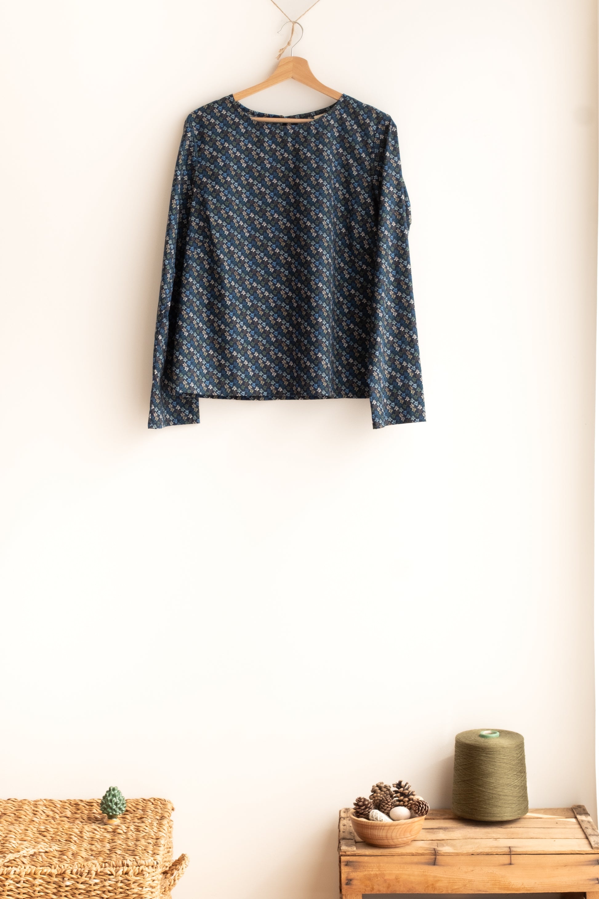 Straight model, round collar, one little button on back, long sleeves. Every item is produced on demand.