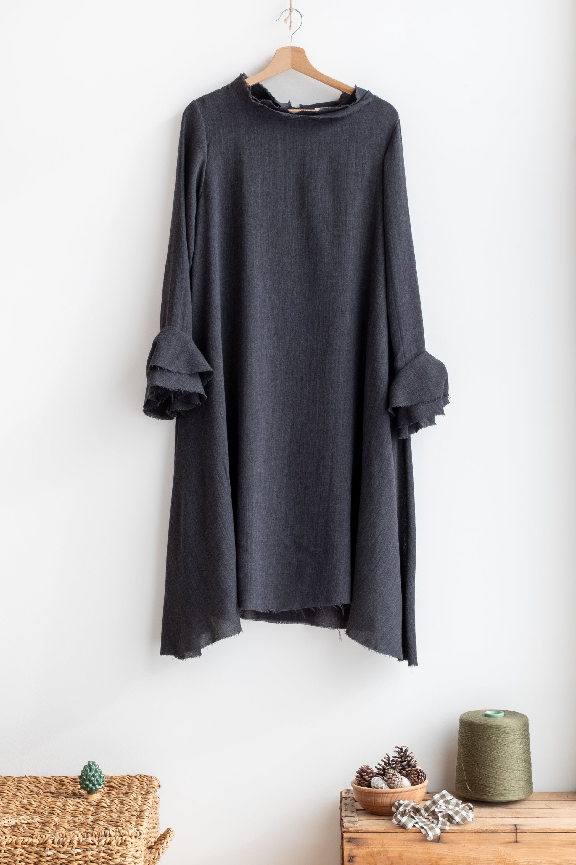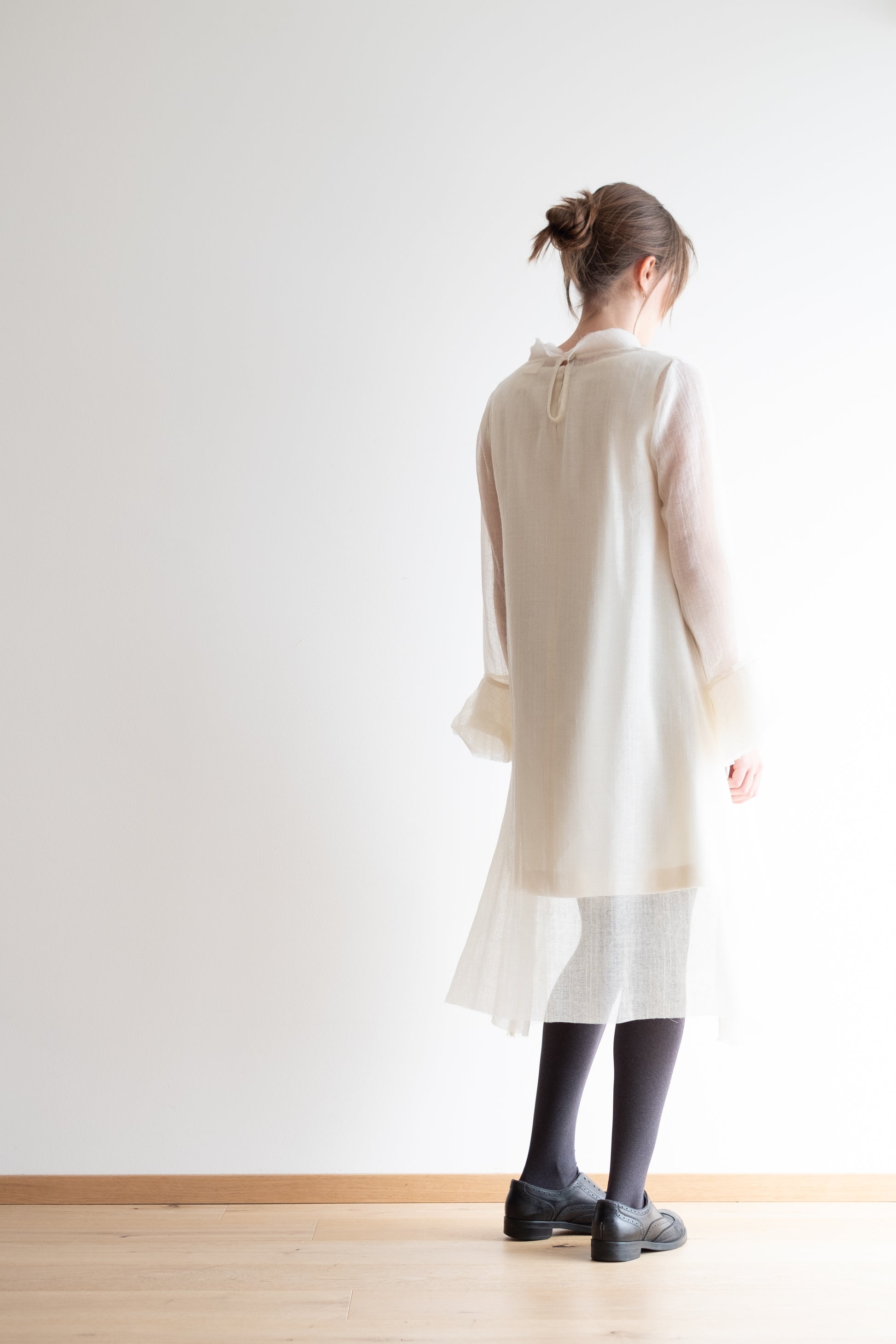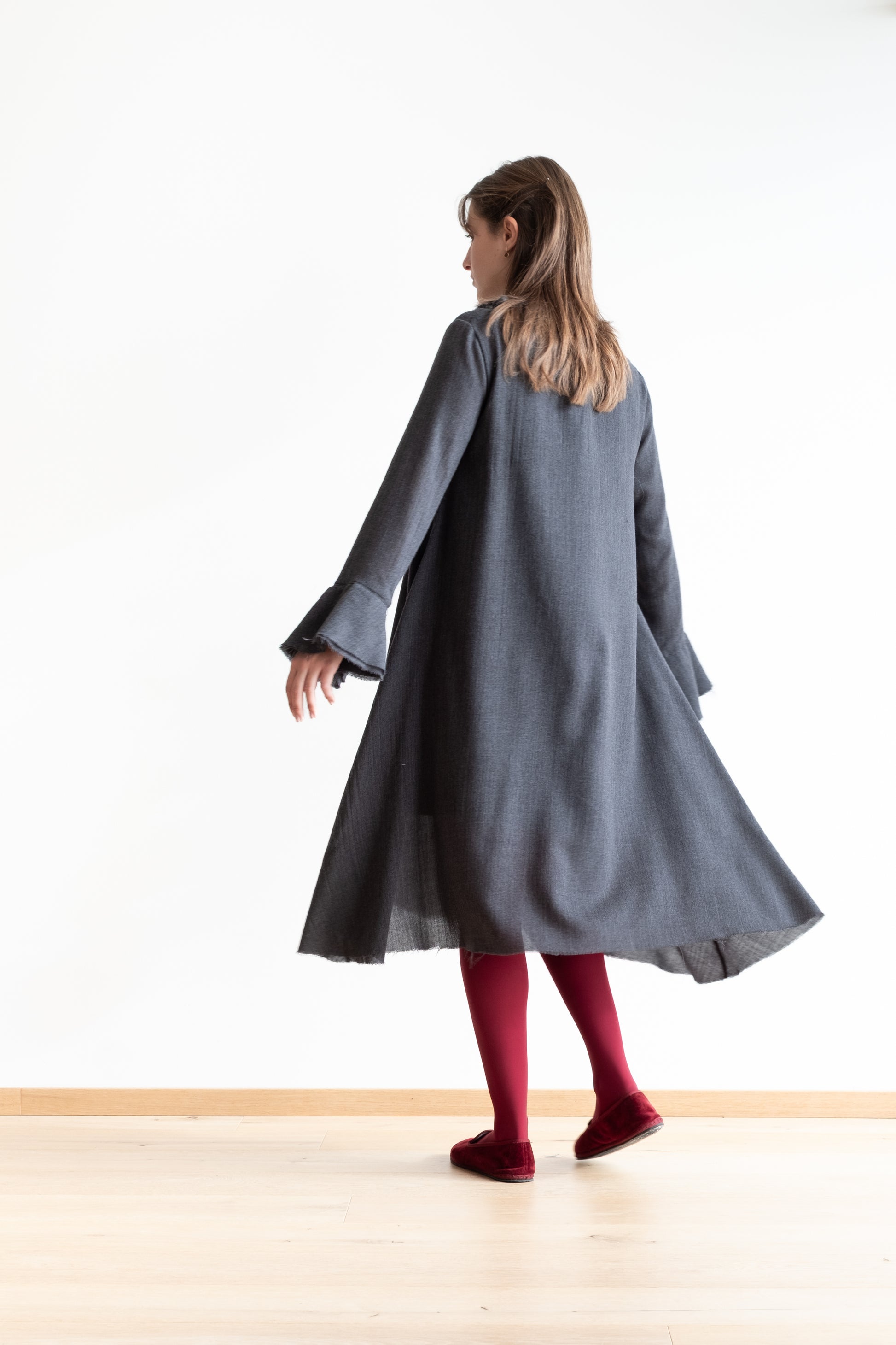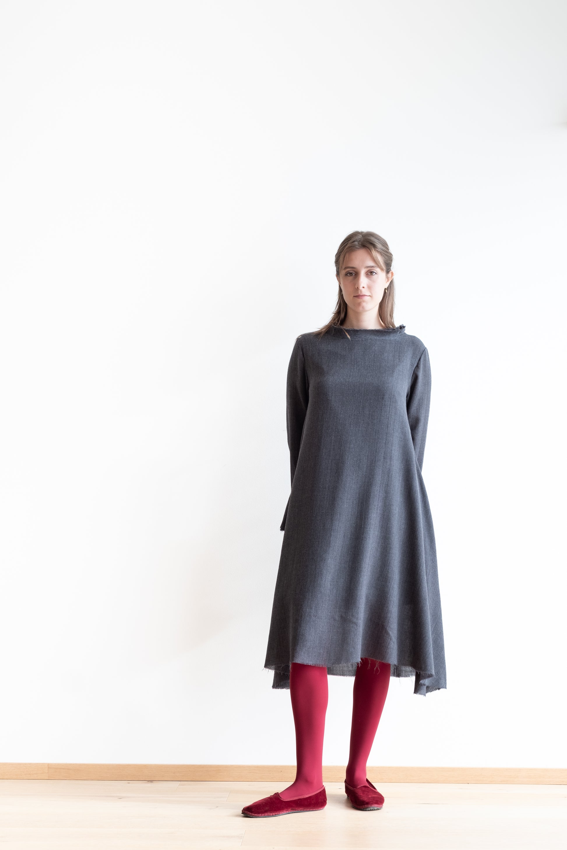 Modello svasato a trapezio, scollo rotondo finito con doppio sbieco a taglio vivo, chiuso con un bottoncino sulla schiena, manica lunga con polso triplo a campana a taglio vivo, orlo a taglio vivo sfilacciato.