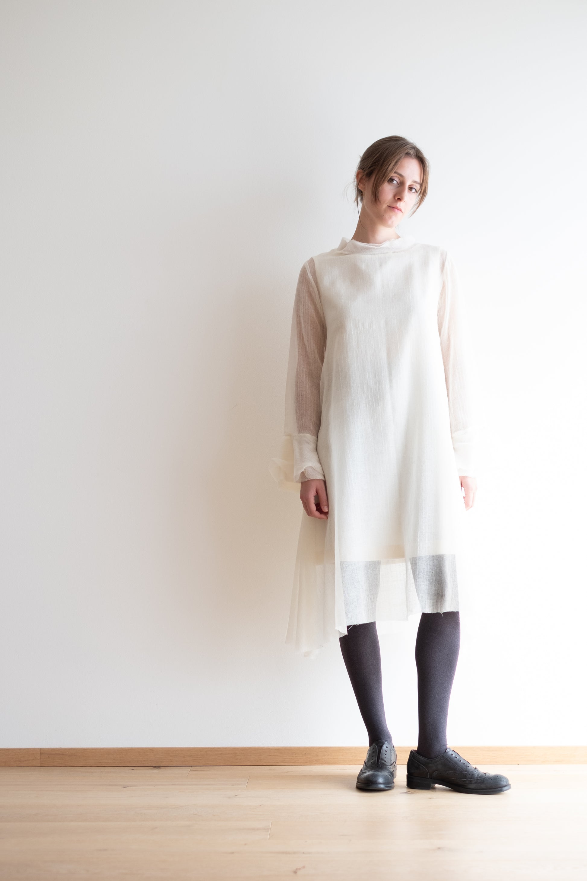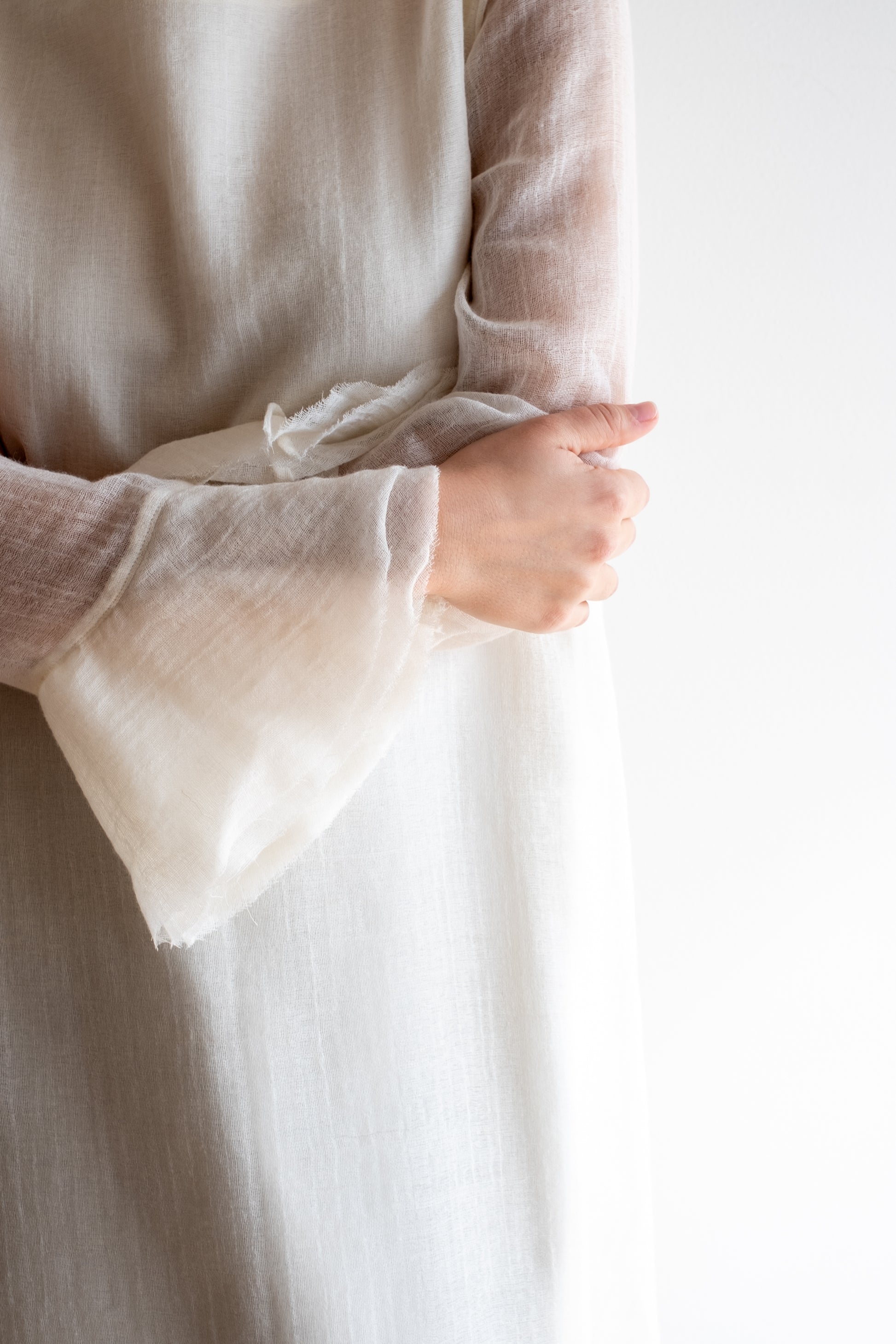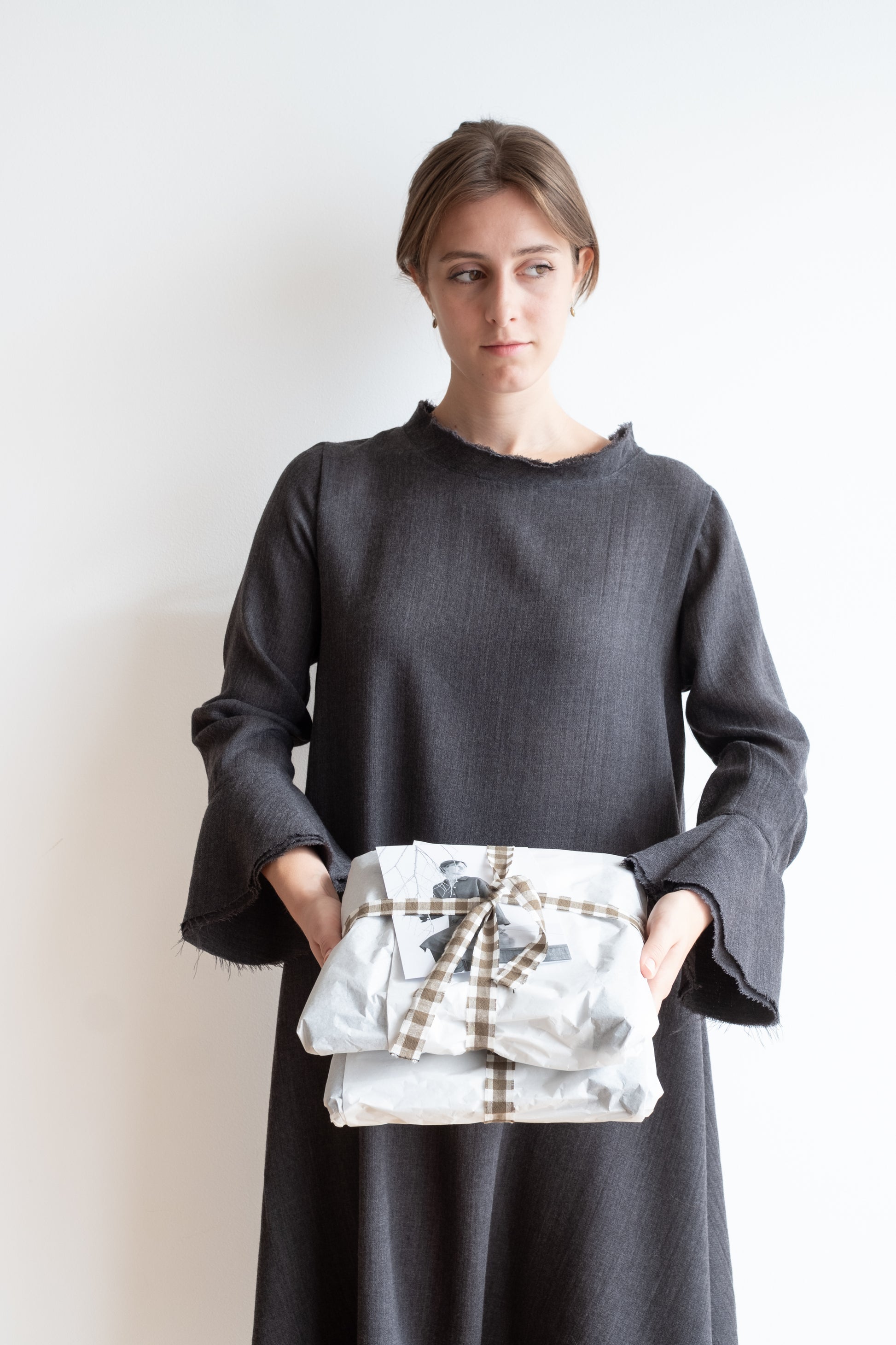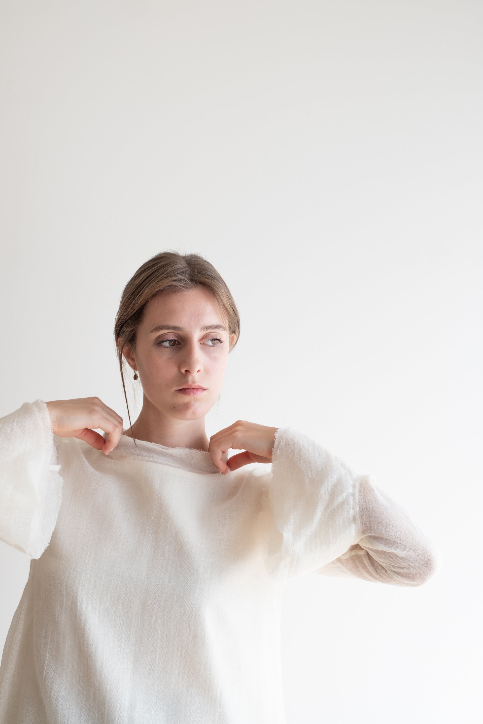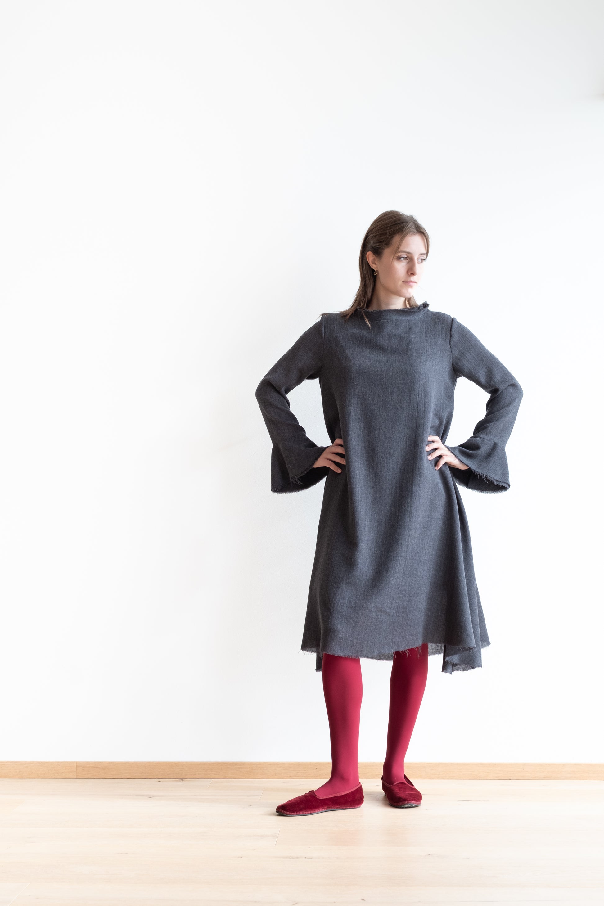 Modello svasato a trapezio, scollo rotondo finito con doppio sbieco a taglio vivo, chiuso con un bottoncino sulla schiena, manica lunga con polso triplo a campana a taglio vivo, orlo a taglio vivo sfilacciato.