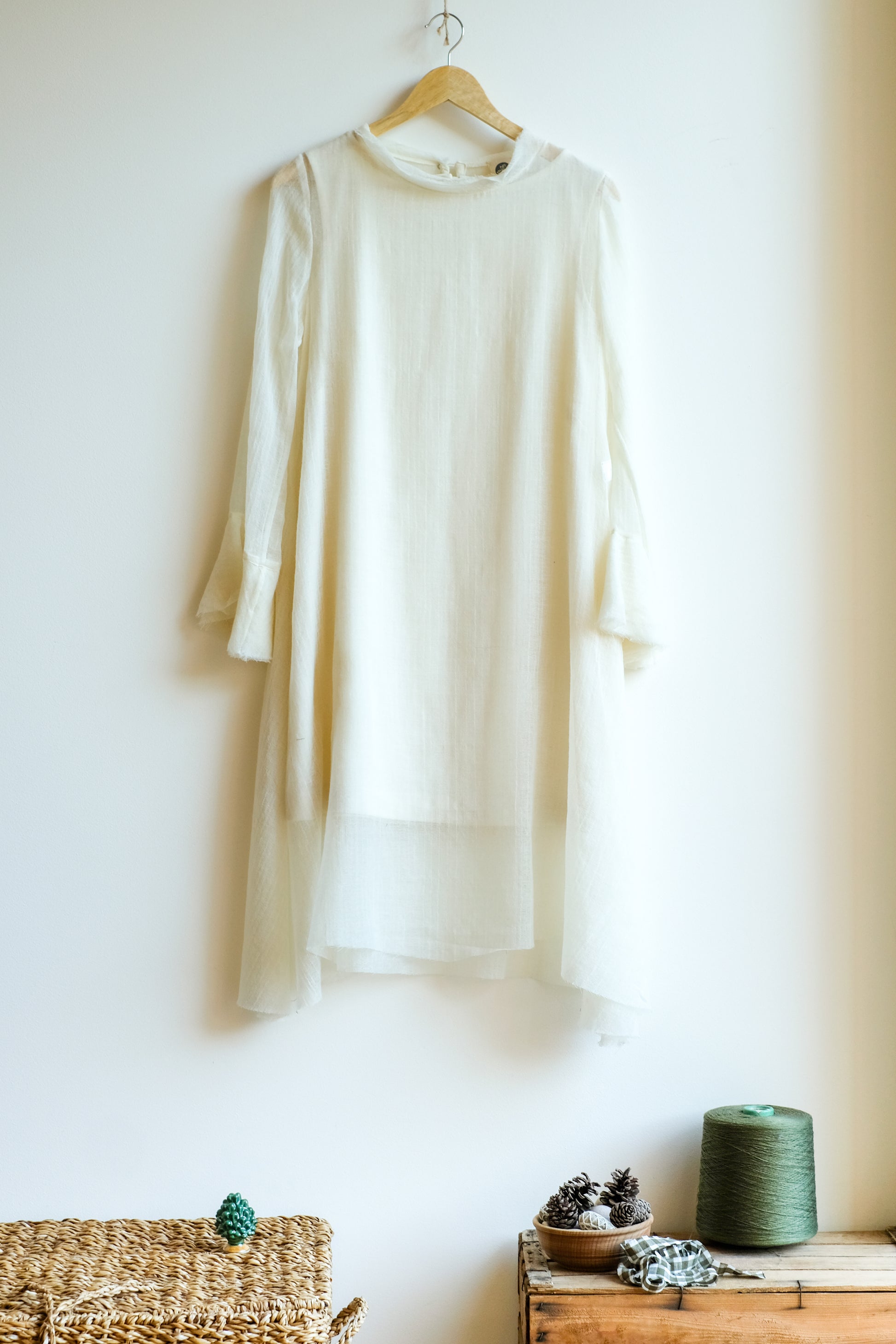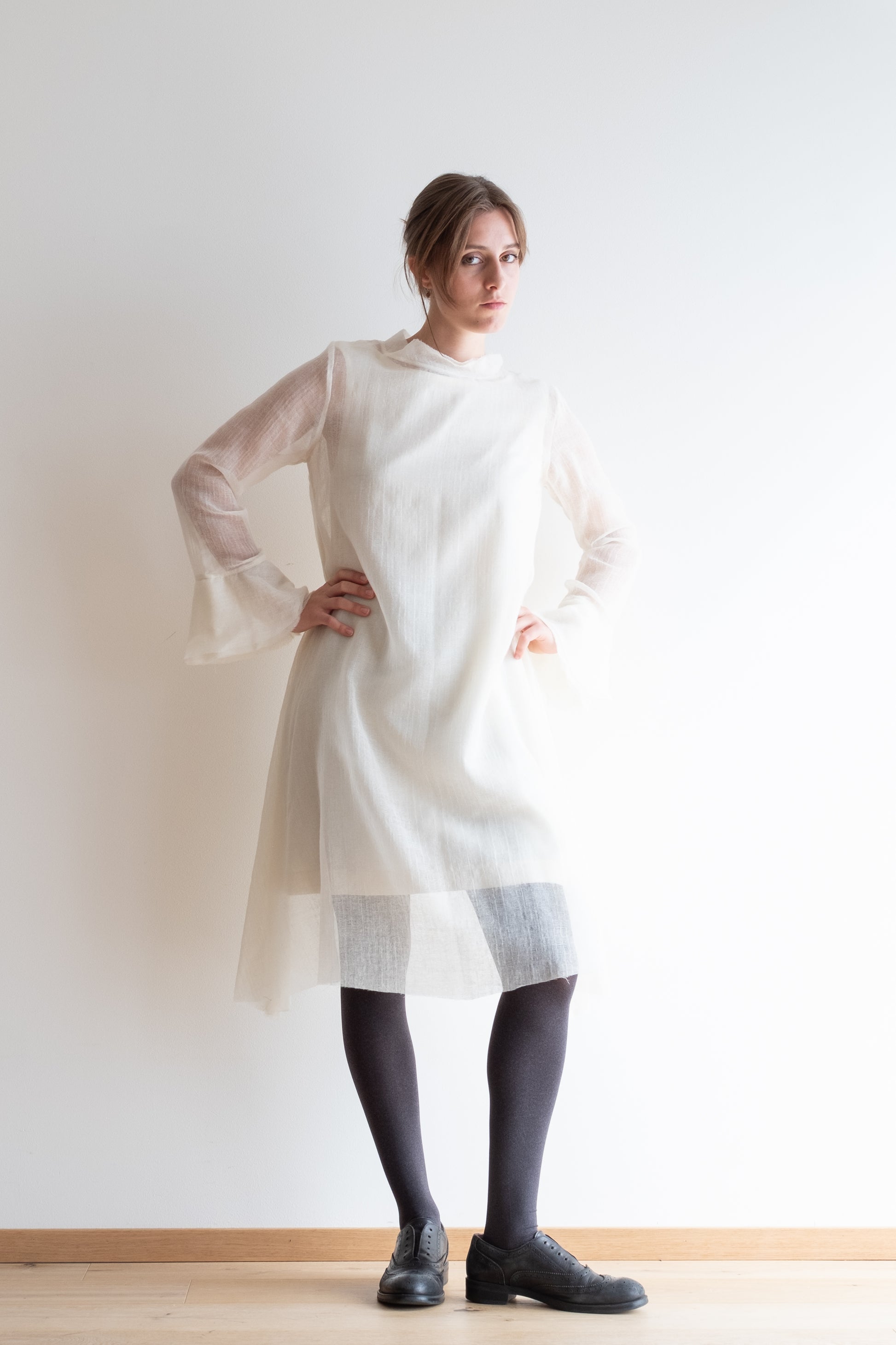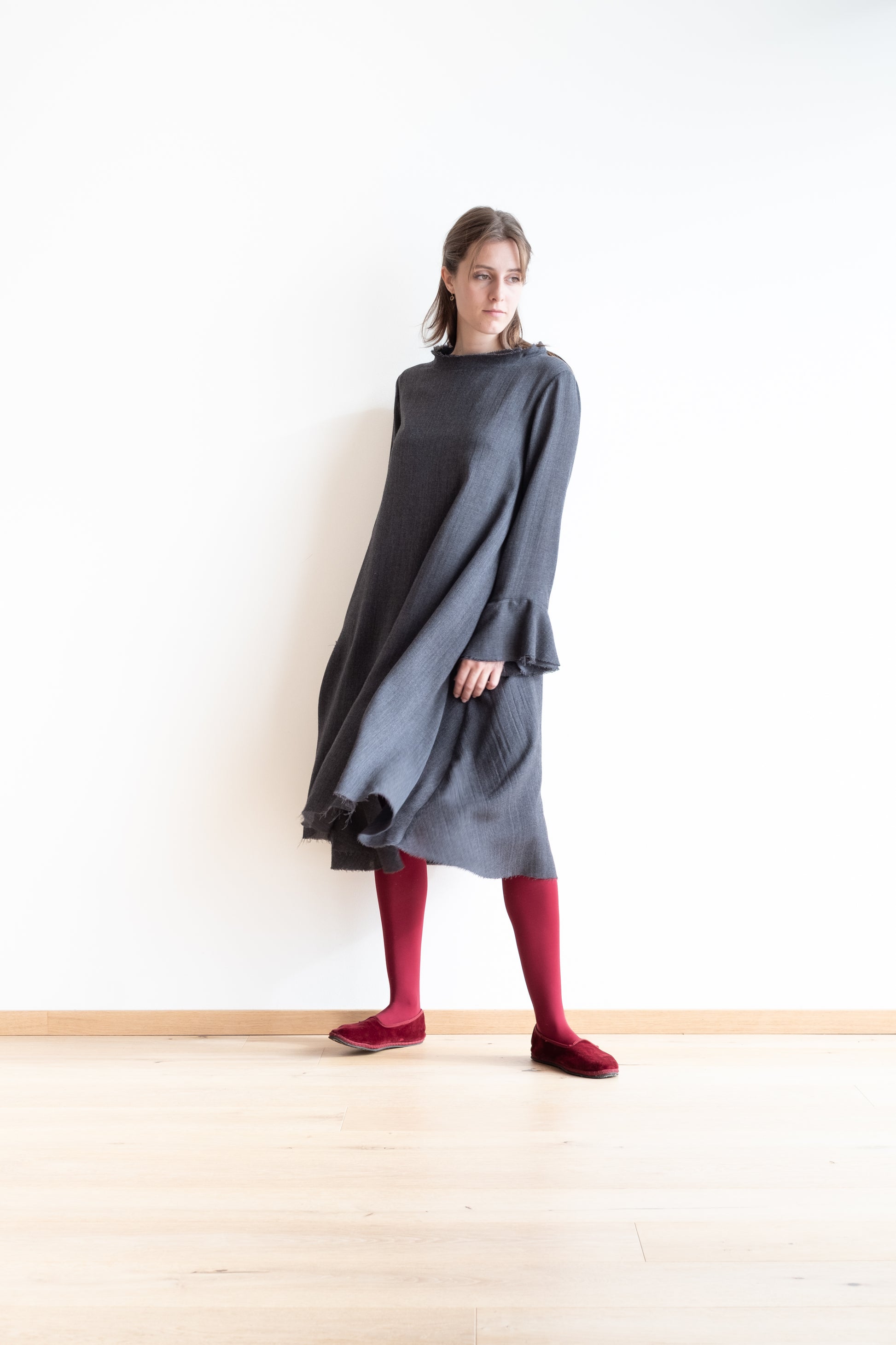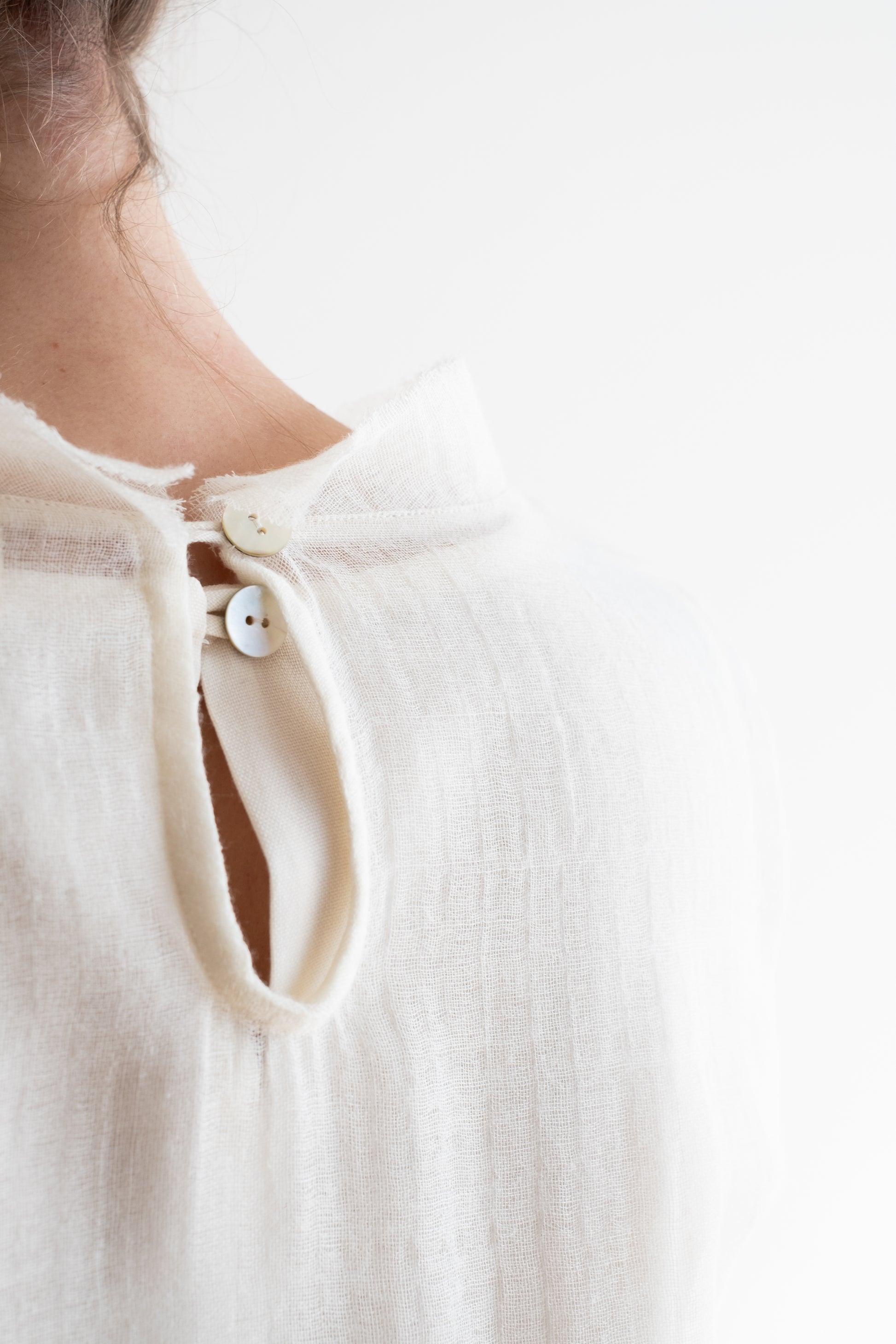 Modello svasato a trapezio, scollo rotondo finito con doppio sbieco a taglio vivo, chiuso con un bottoncino sulla schiena, manica lunga con polso triplo a campana a taglio vivo, orlo a taglio vivo sfilacciato.