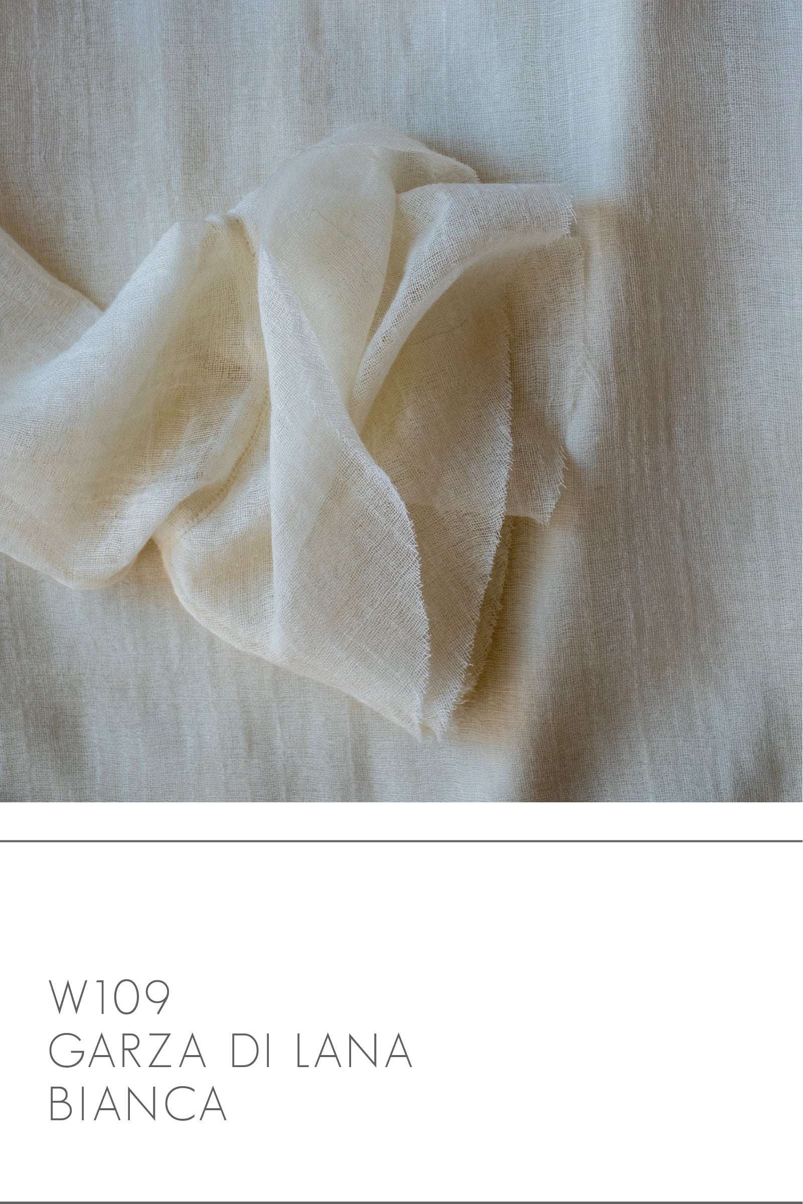Tessuto in garza di lana trasparente nella versione in bianco e semi trasparente nella versione in grigio.