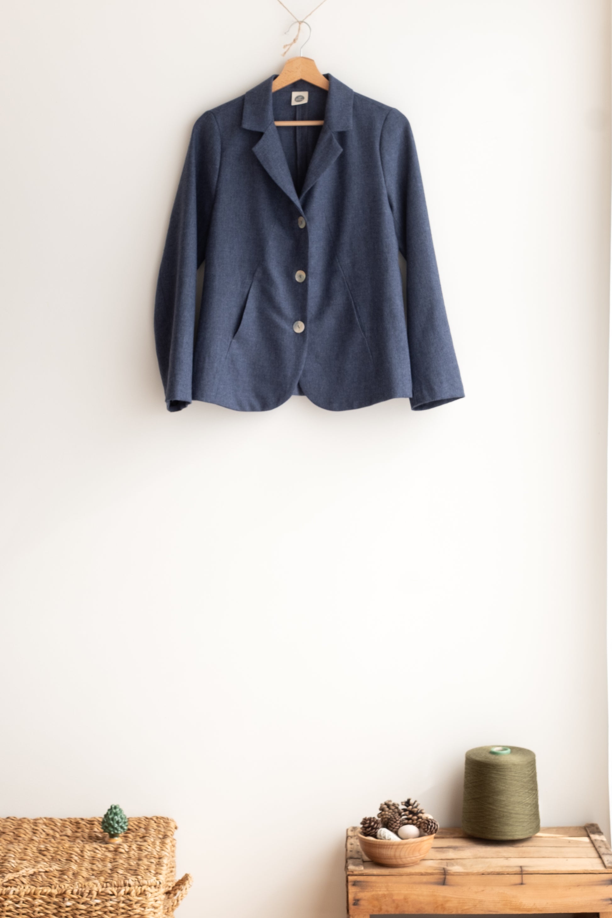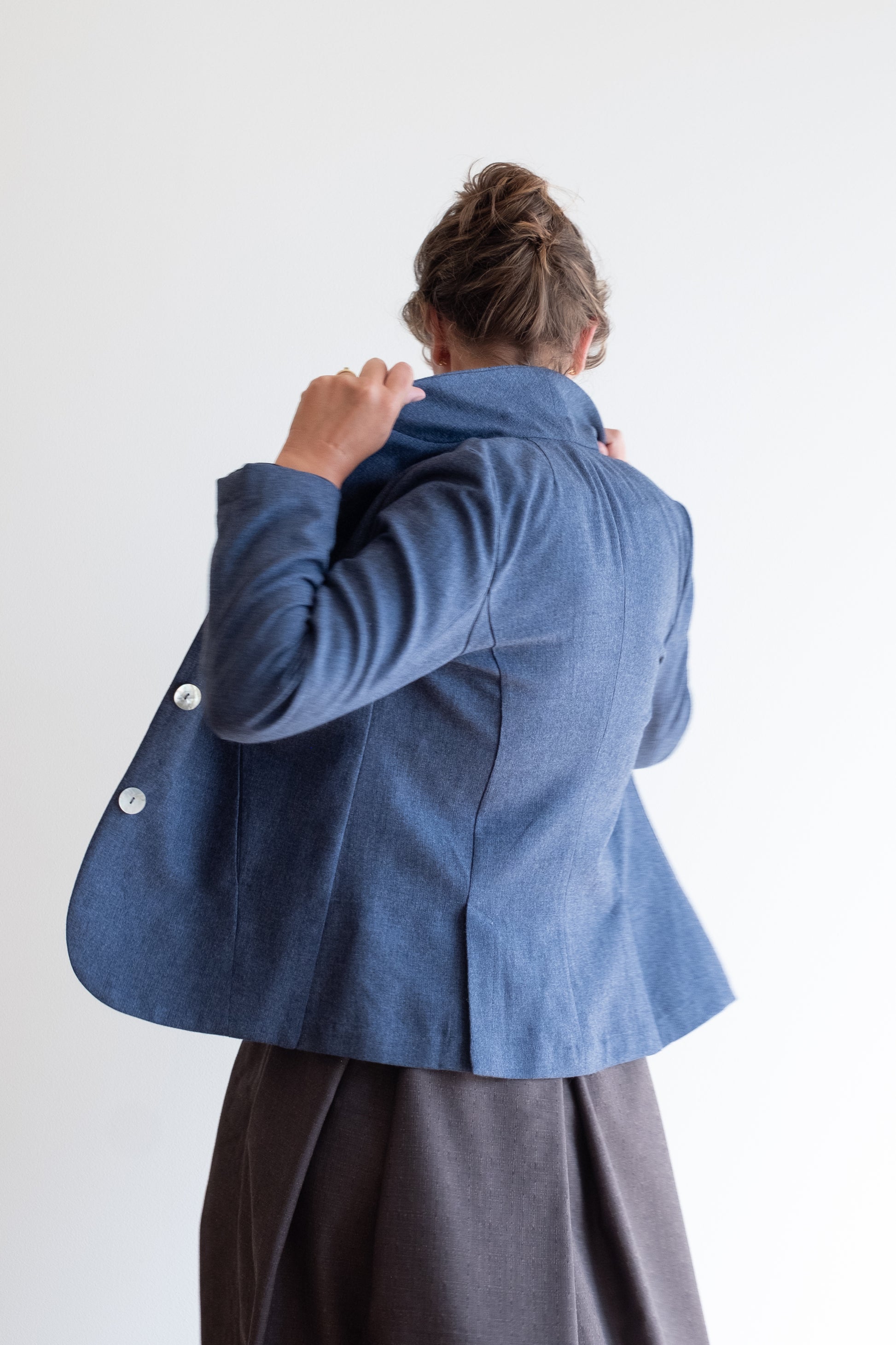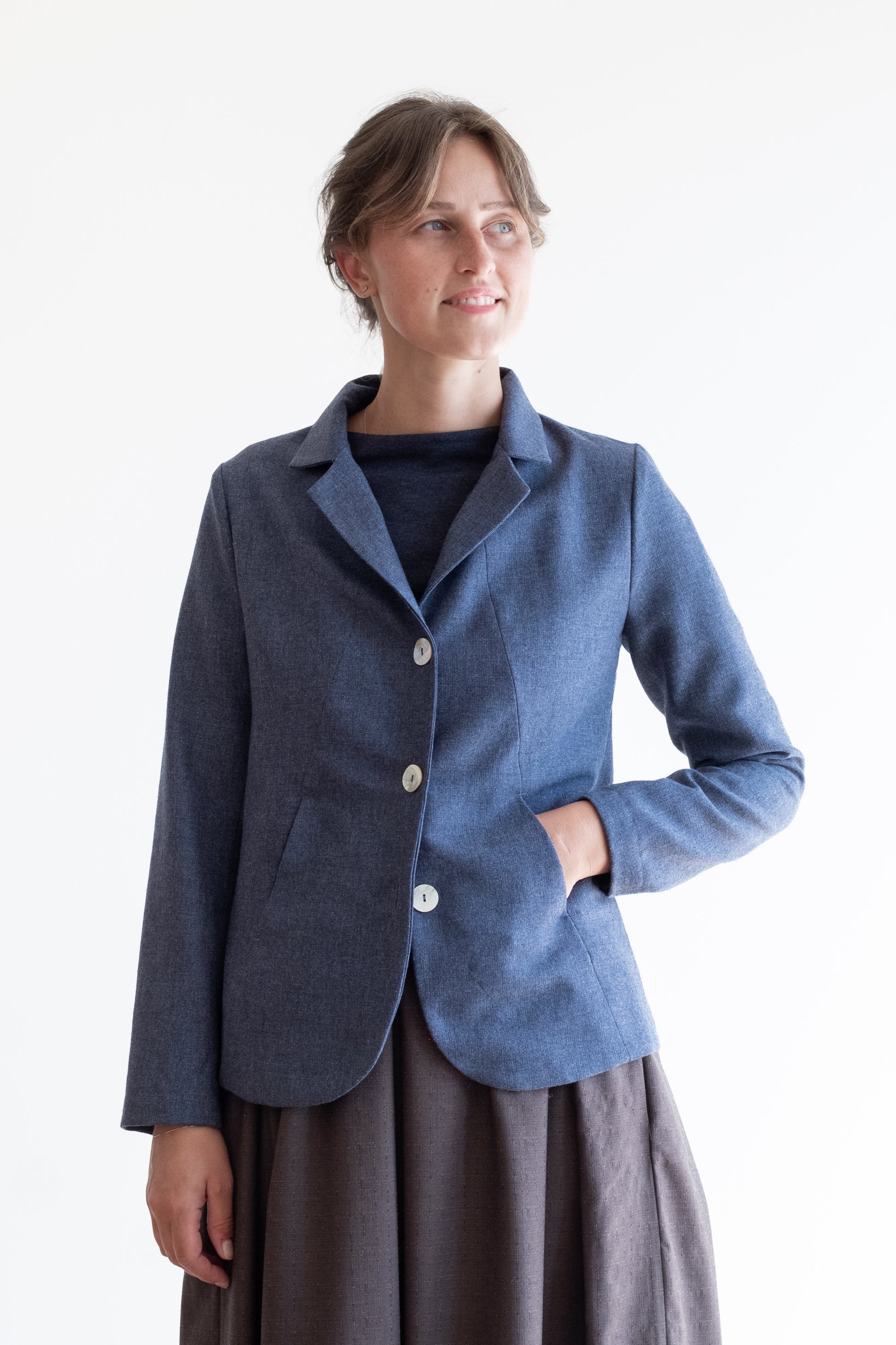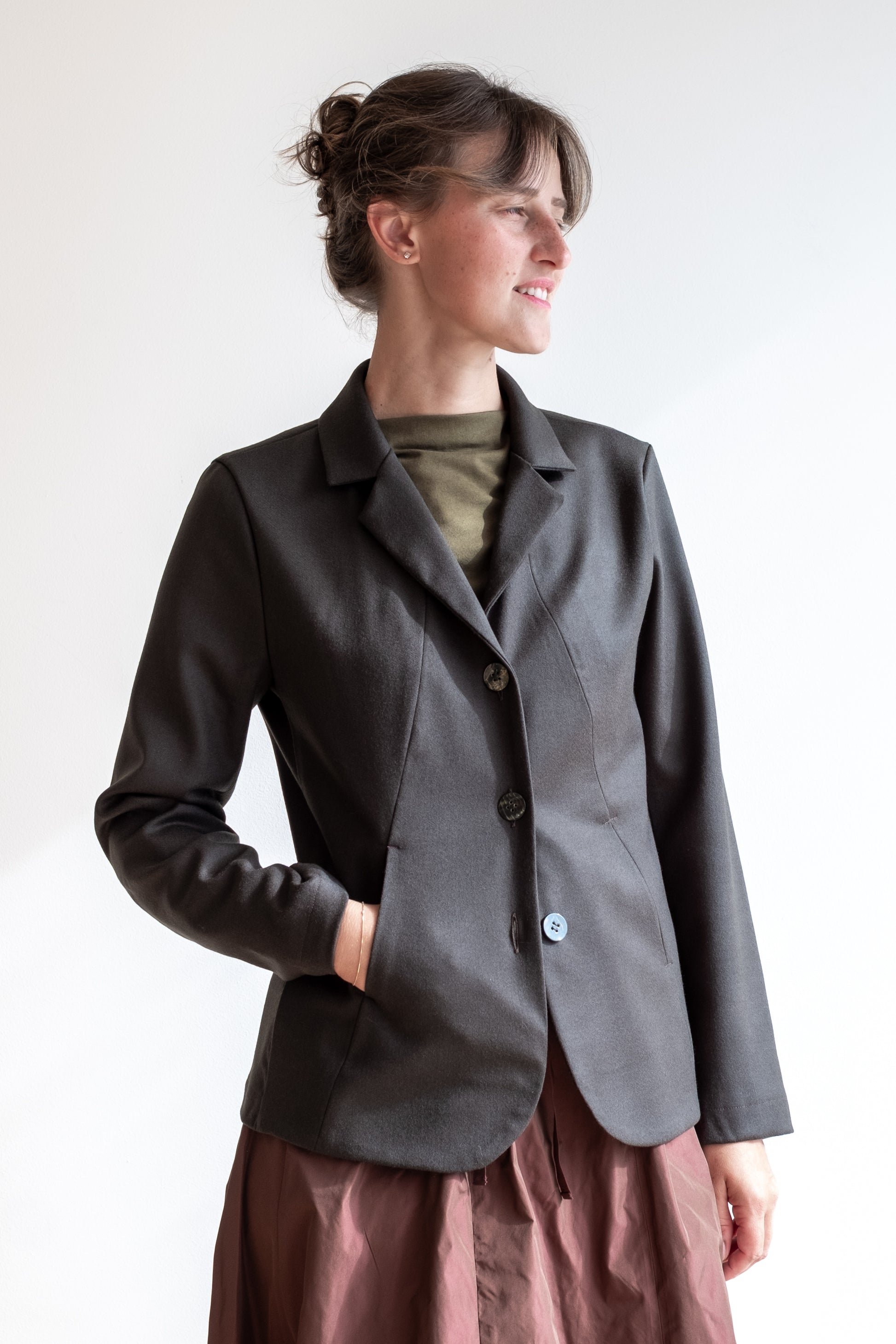 Modello sciancrato, collo morbido e revers, tasche lungo la cucitura davanti, manica lunga foderata o sfoderata a seconda del tessuto della giacca, chiusa al centro davanti con tre bottoni in madreperla, due spacchi dietro.