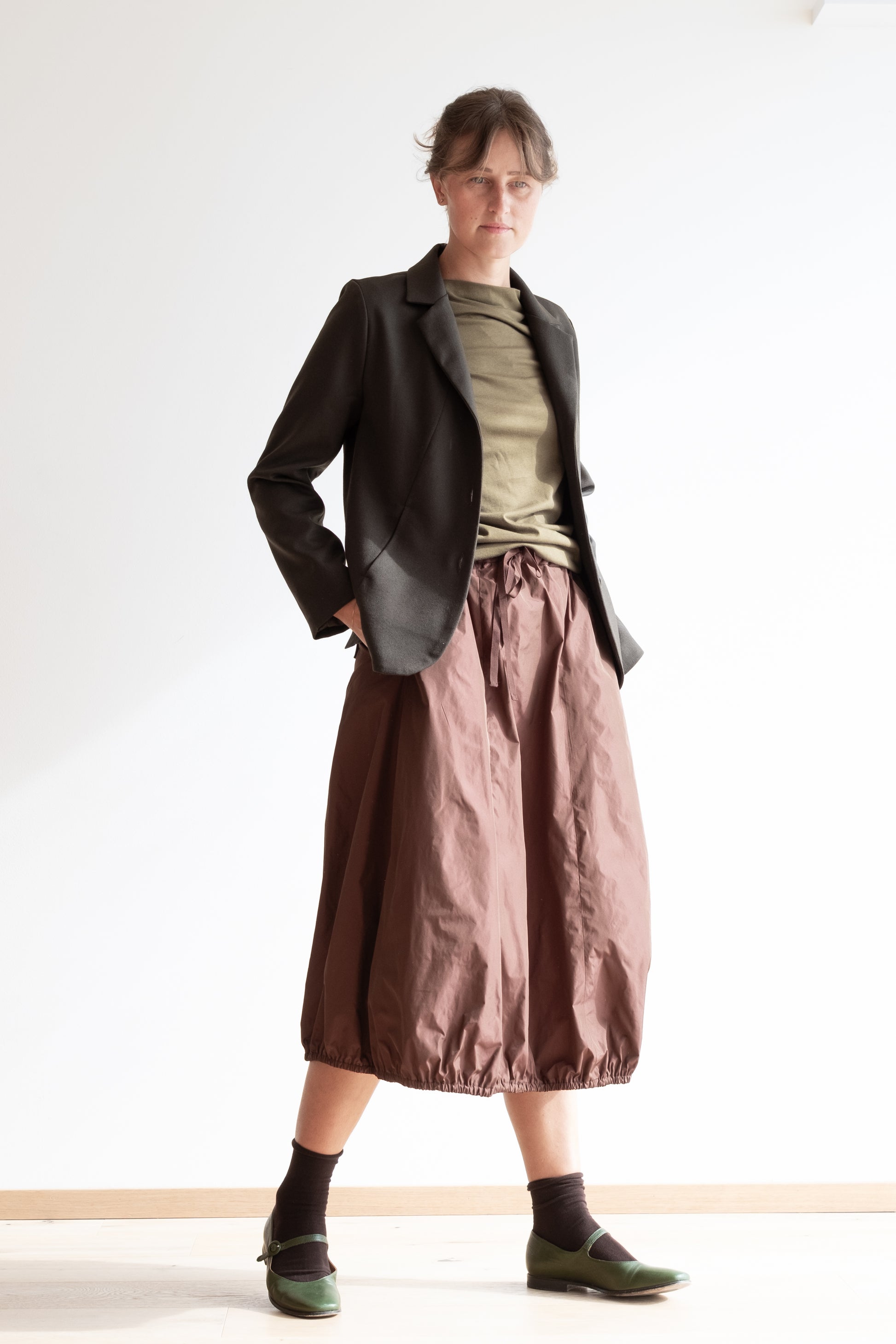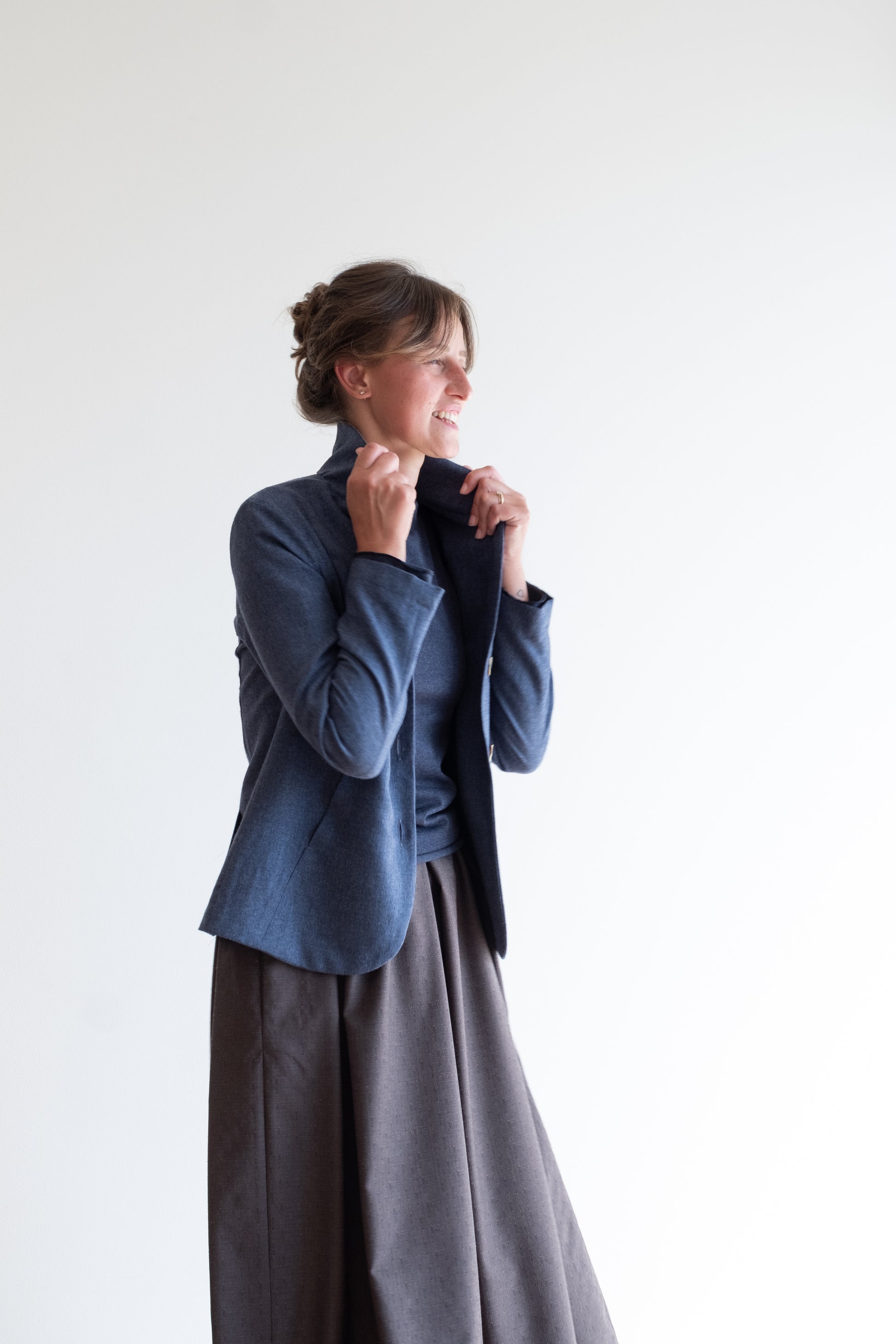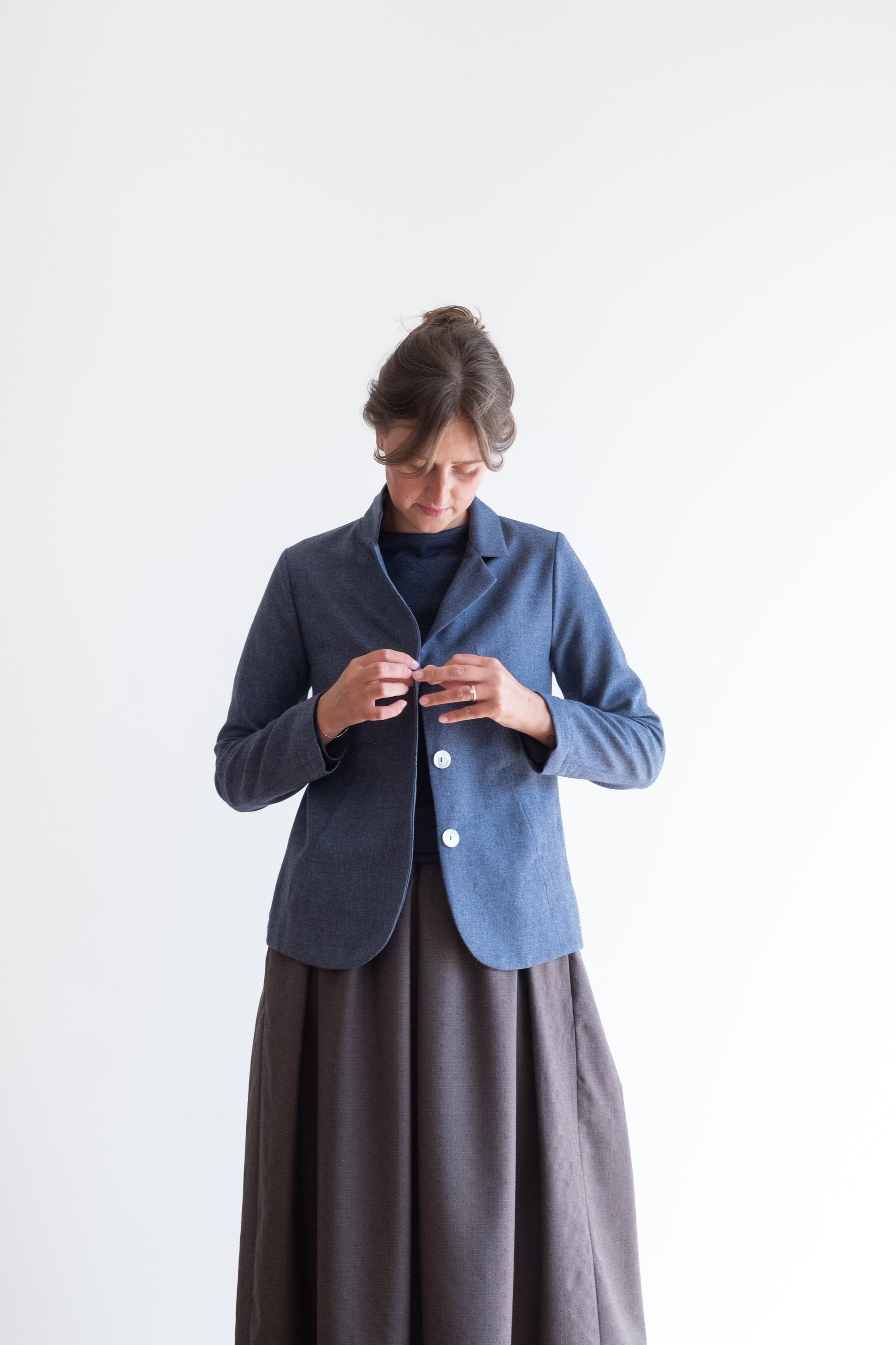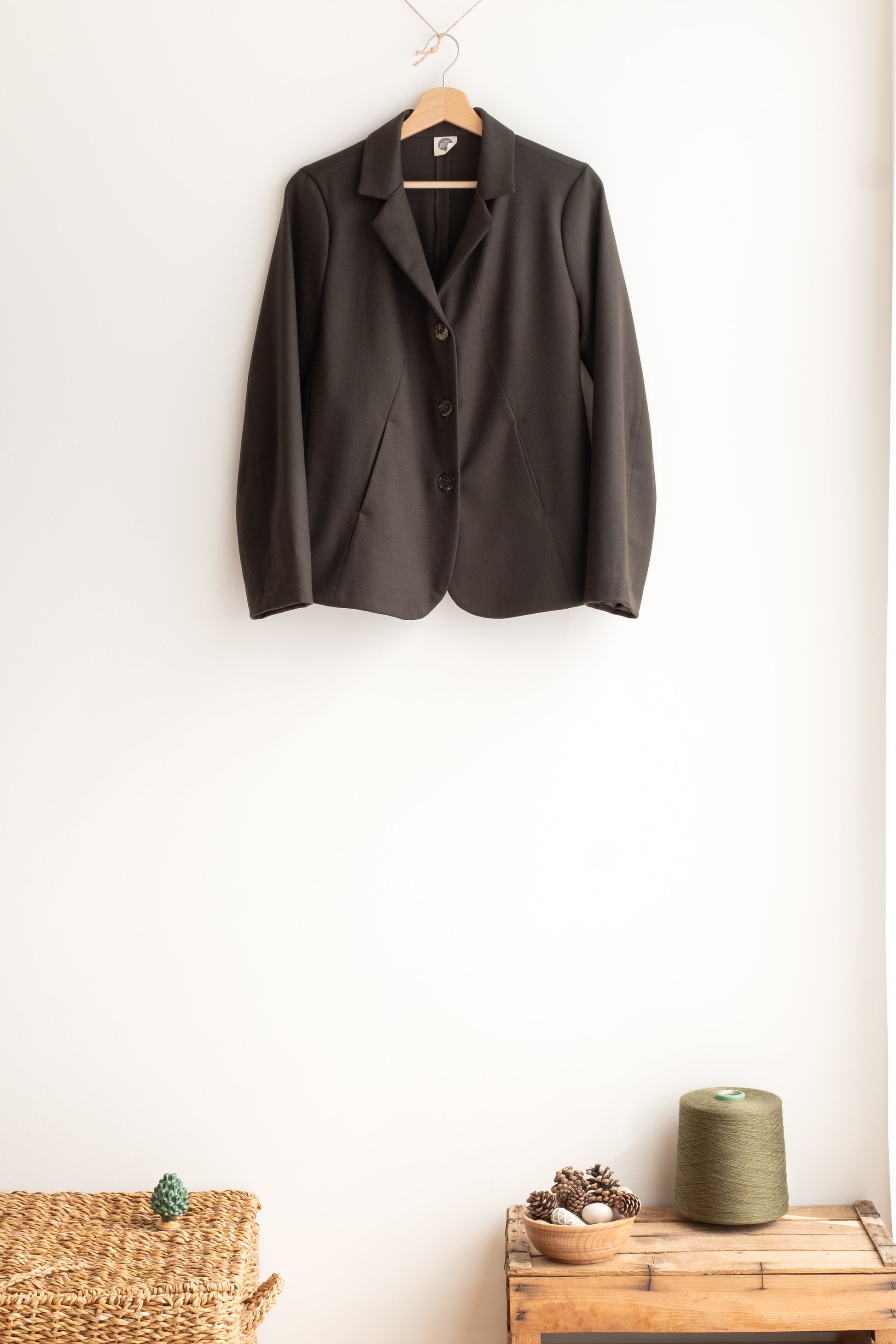 Modello sciancrato, collo morbido e revers, tasche lungo la cucitura davanti, manica lunga foderata o sfoderata a seconda del tessuto della giacca, chiusa al centro davanti con tre bottoni in madreperla, due spacchi dietro.