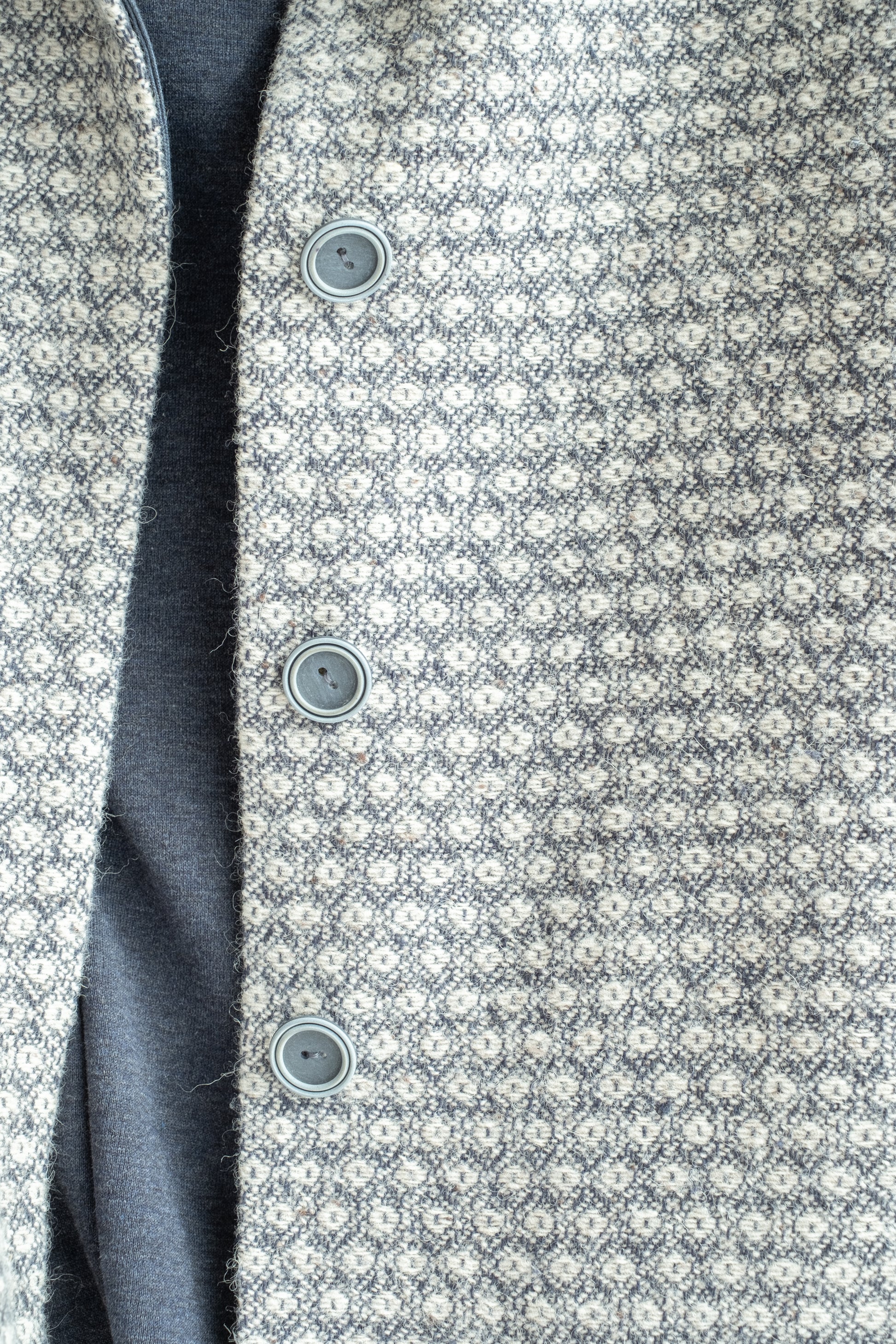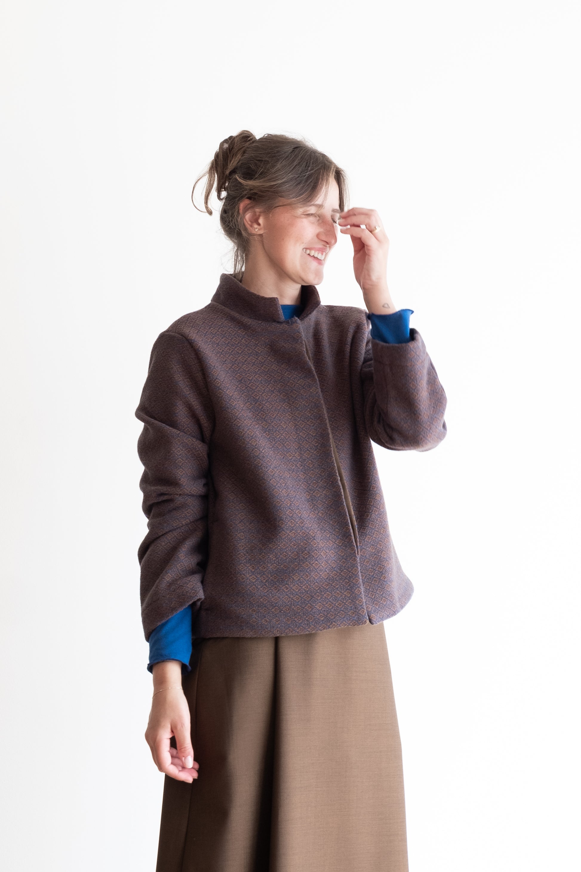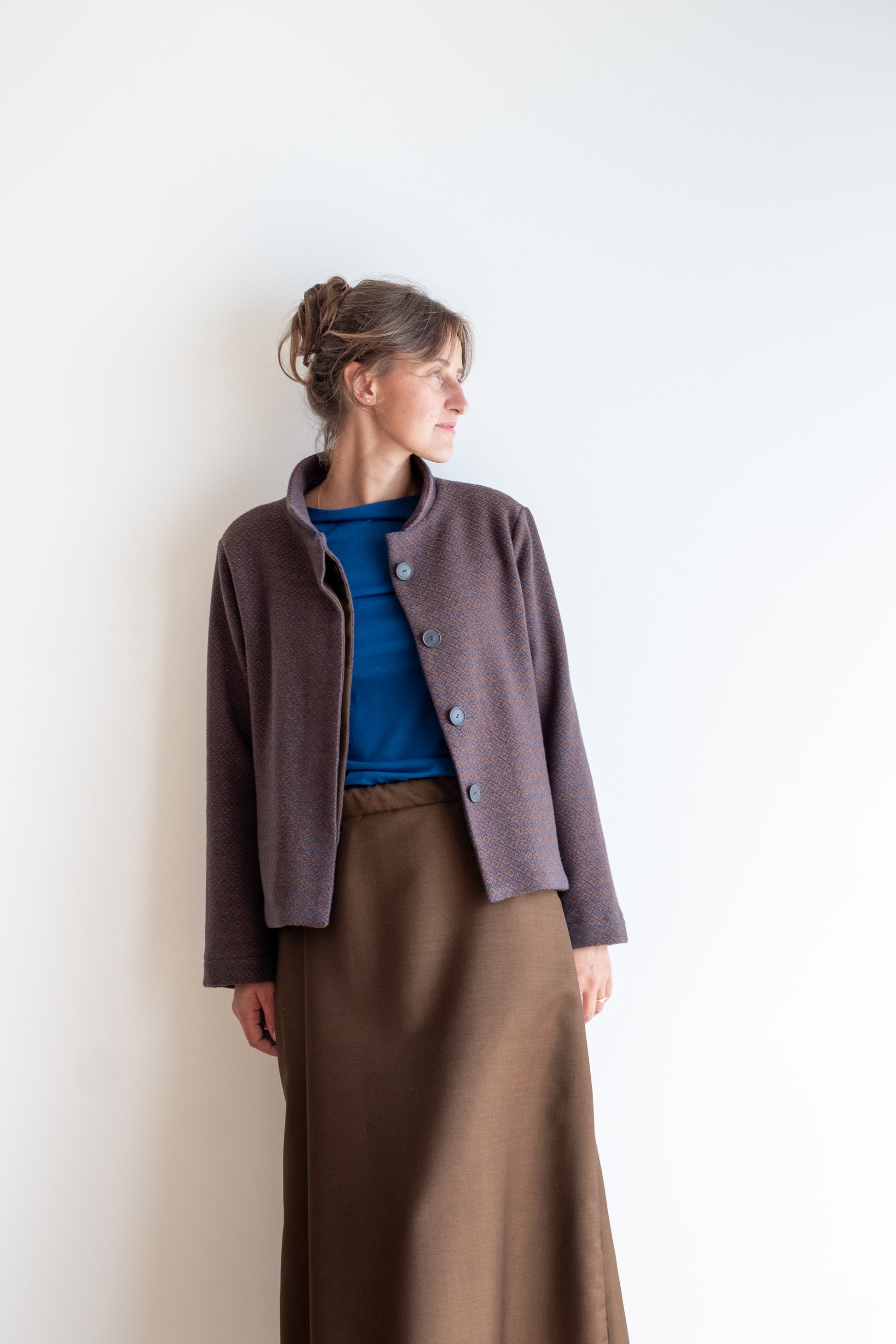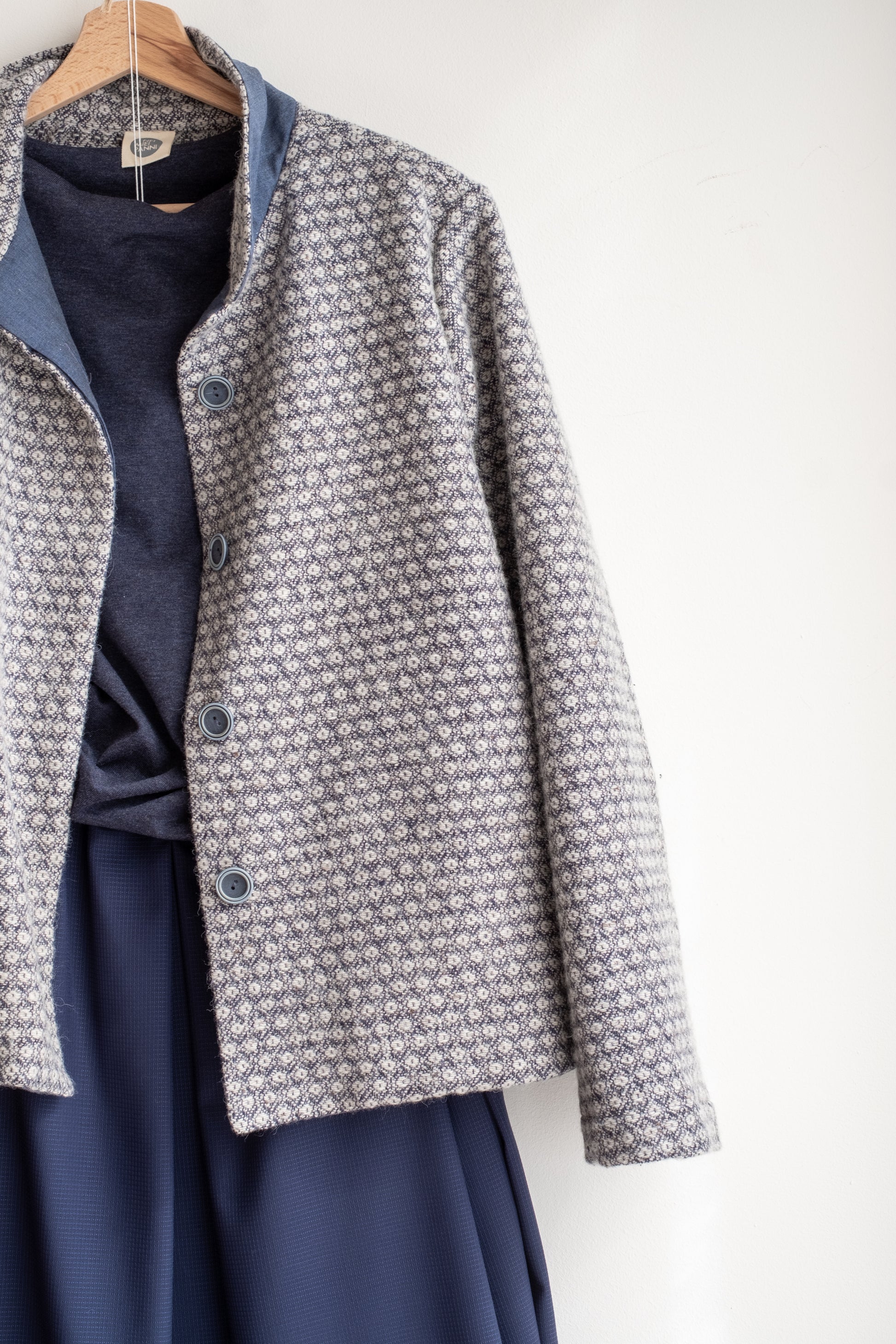 Modello a scatola, colletto morbido, tasche lungo la cucitura laterali, manica lunga foderata, chiusa al centro davanti con abbottonatura nascosta, interno davanti foderato in tessuto.