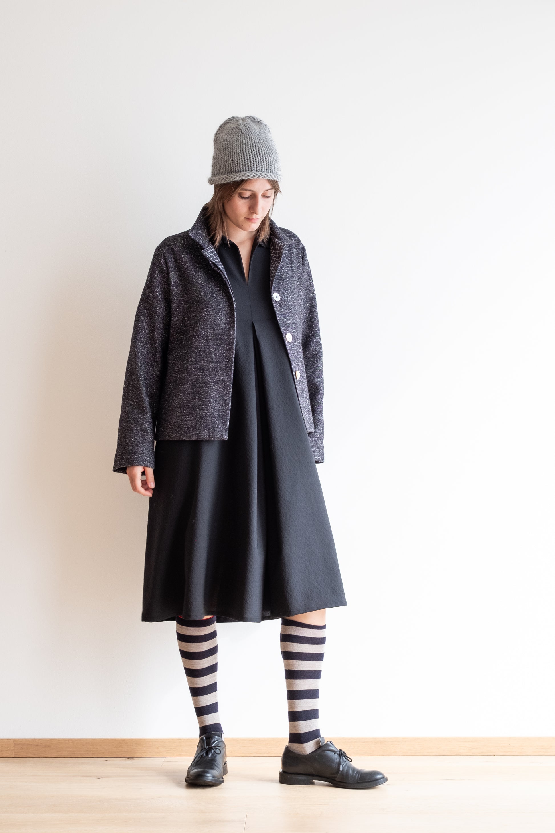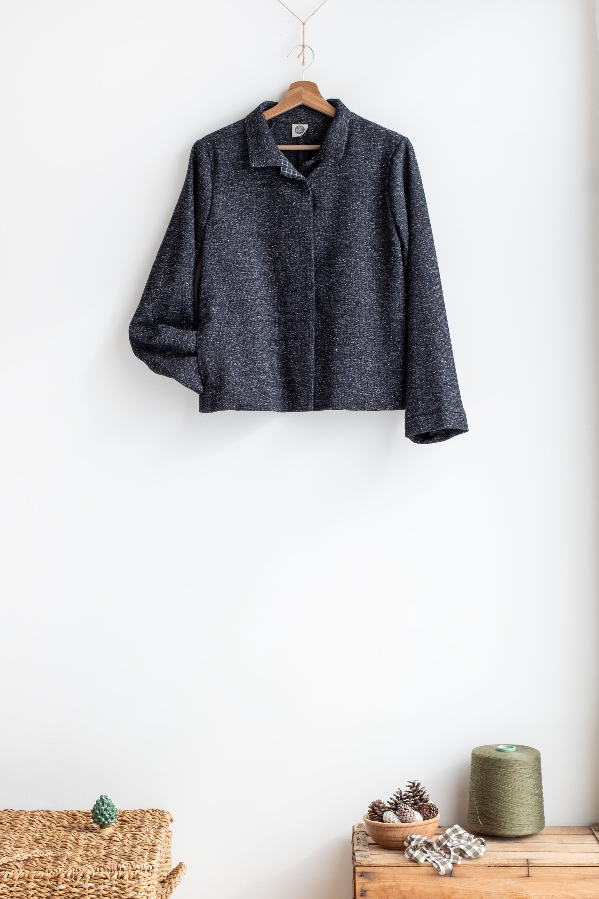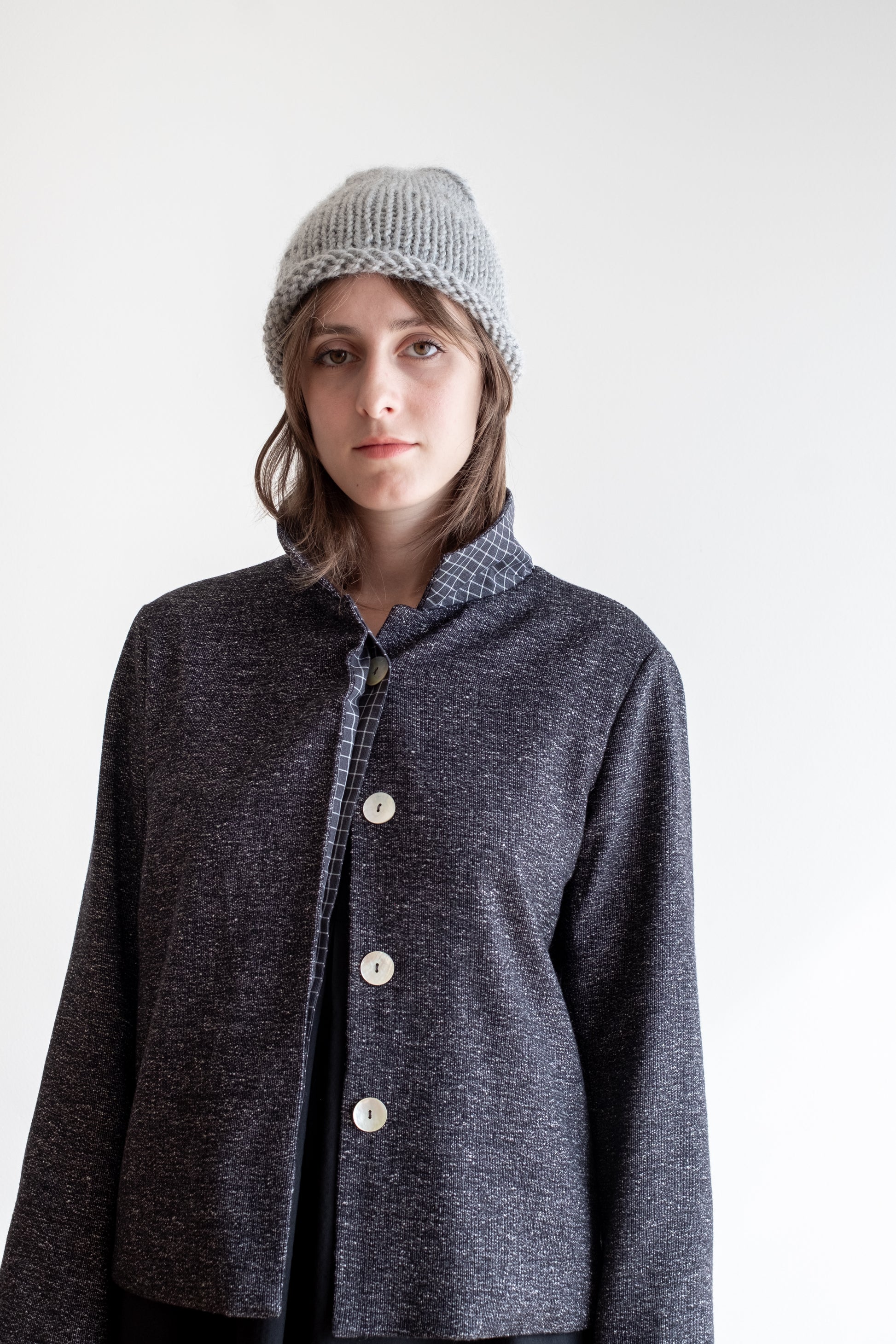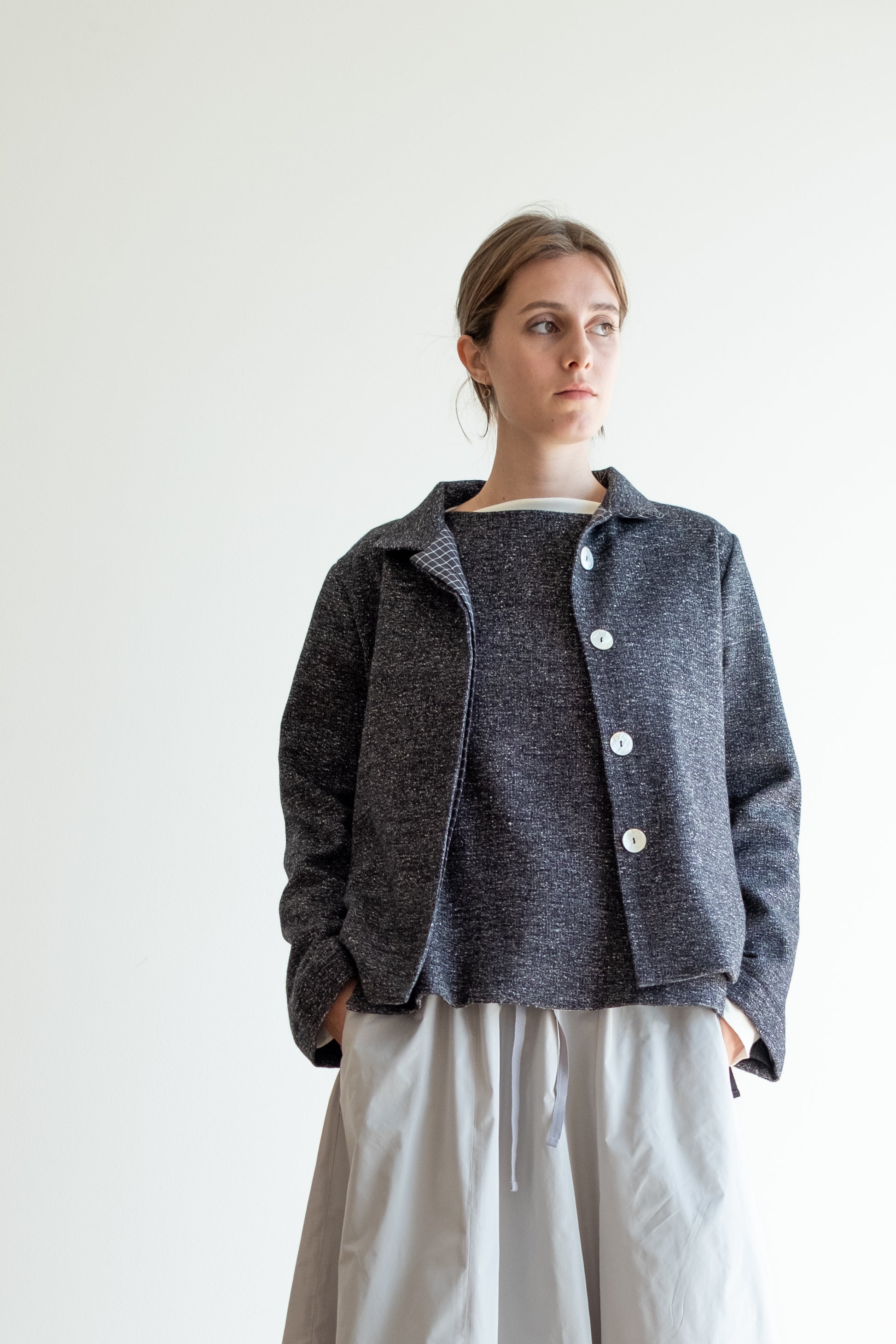 Modello a scatola, colletto morbido, tasche lungo la cucitura laterali, manica lunga foderata, chiusa al centro davanti con abbottonatura nascosta, interno davanti foderato in tessuto.