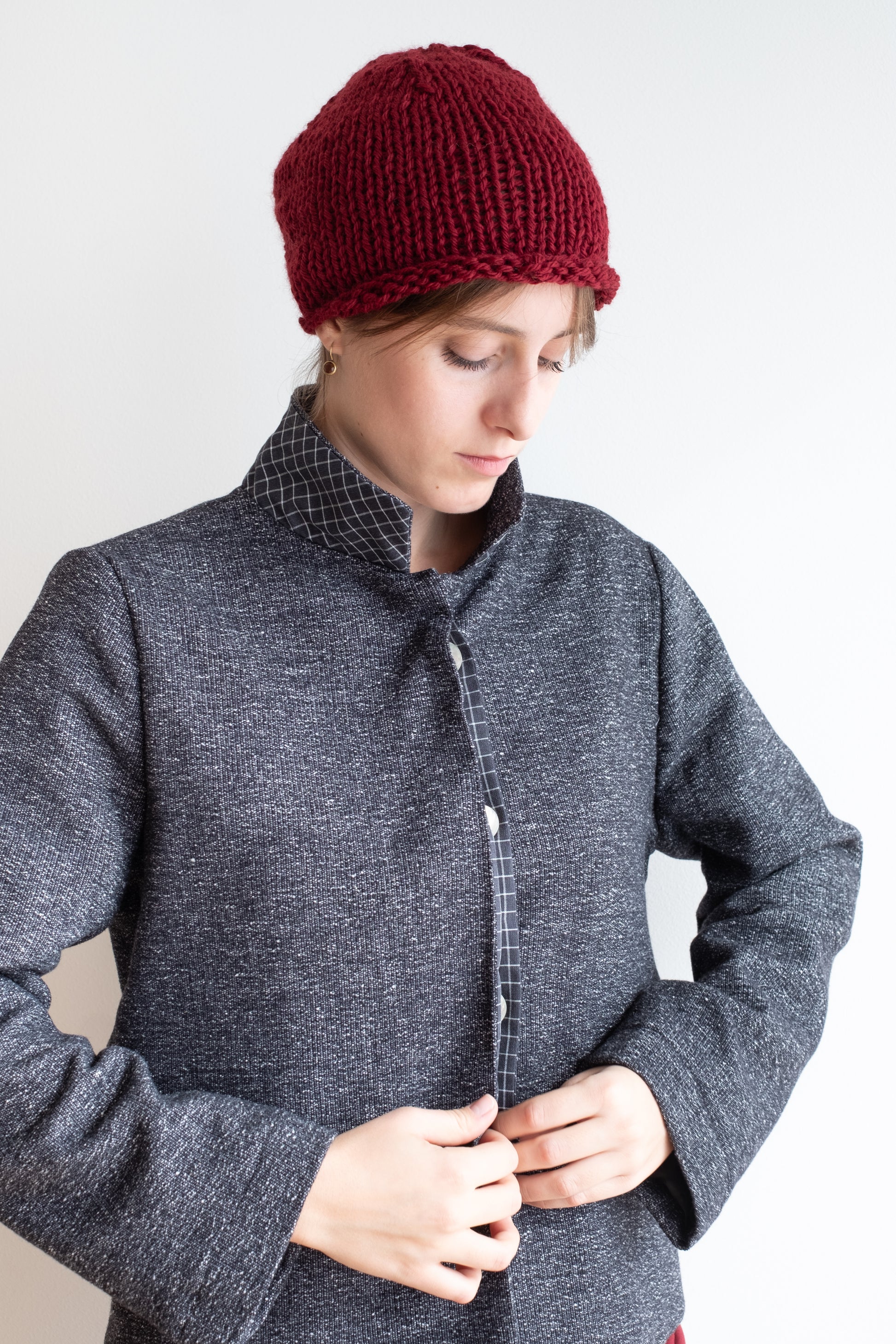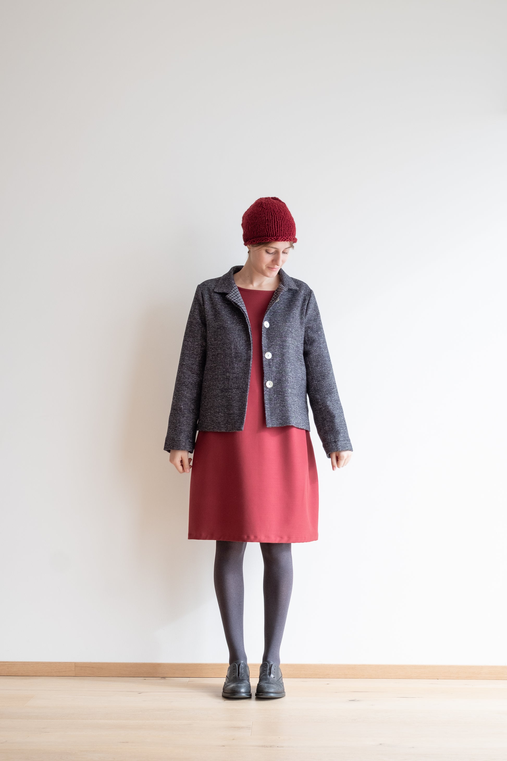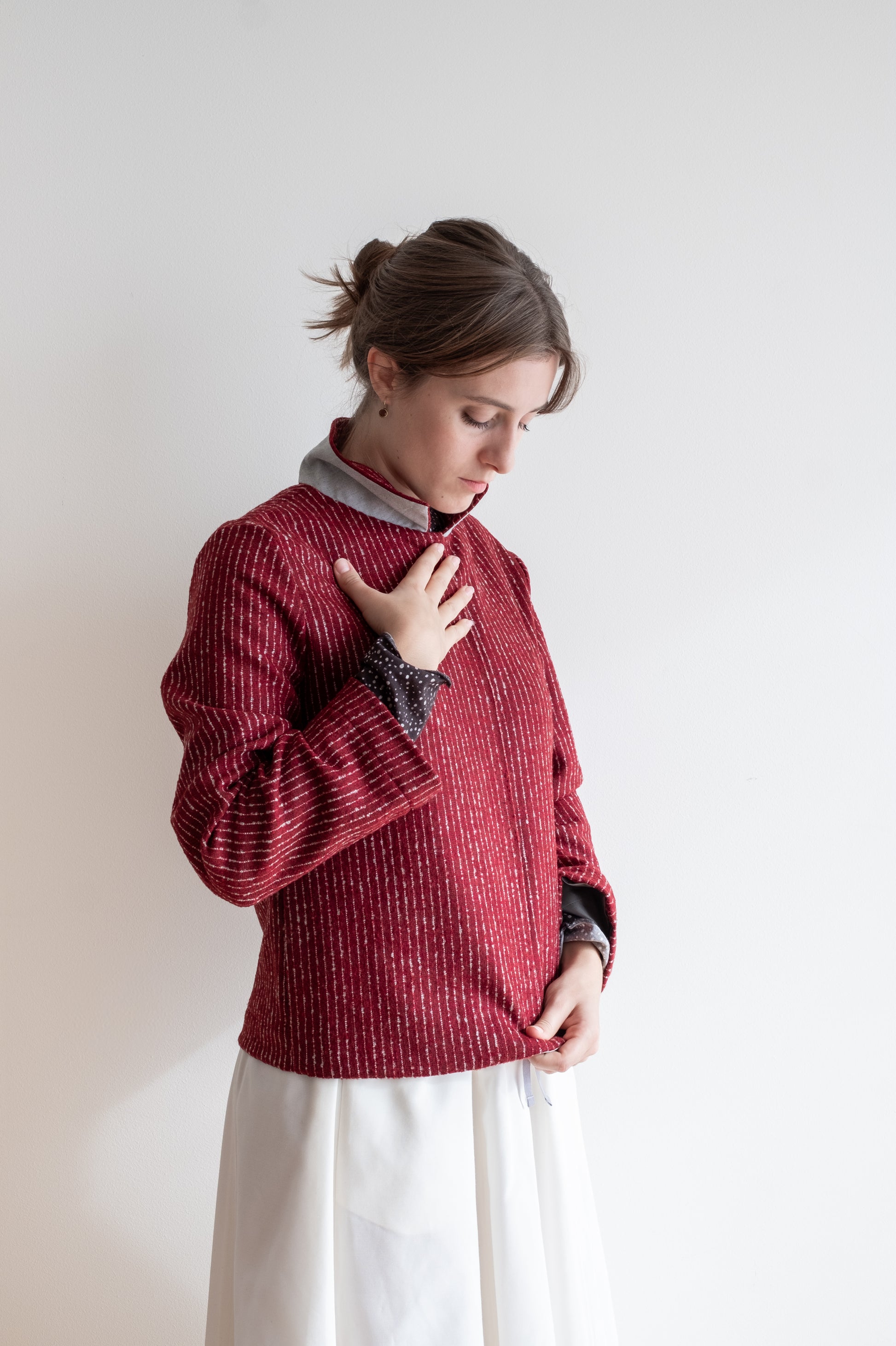 Modello a scatola, colletto morbido, tasche lungo la cucitura laterali, manica lunga foderata, chiusa al centro davanti con abbottonatura nascosta, interno davanti foderato in tessuto.