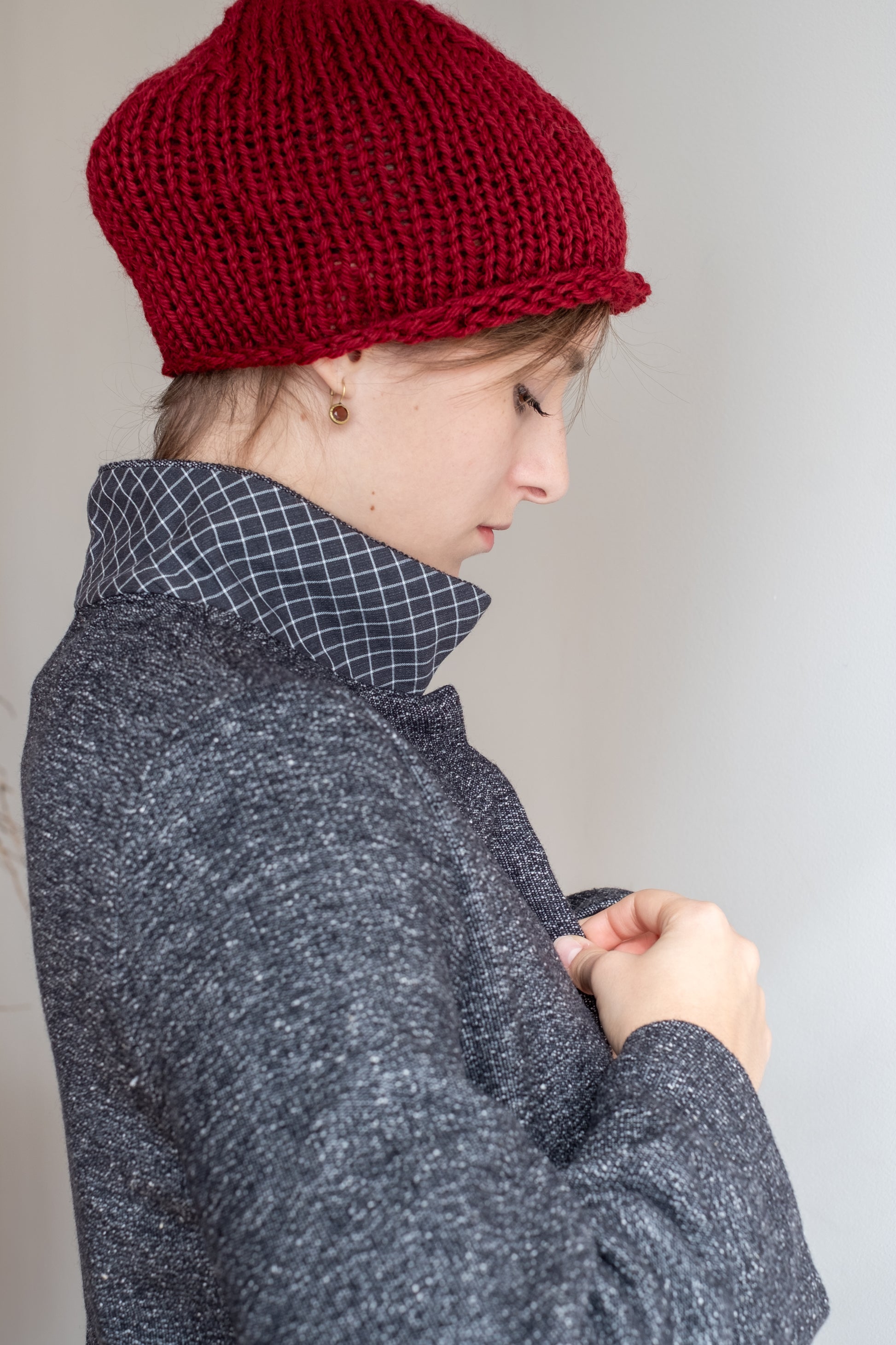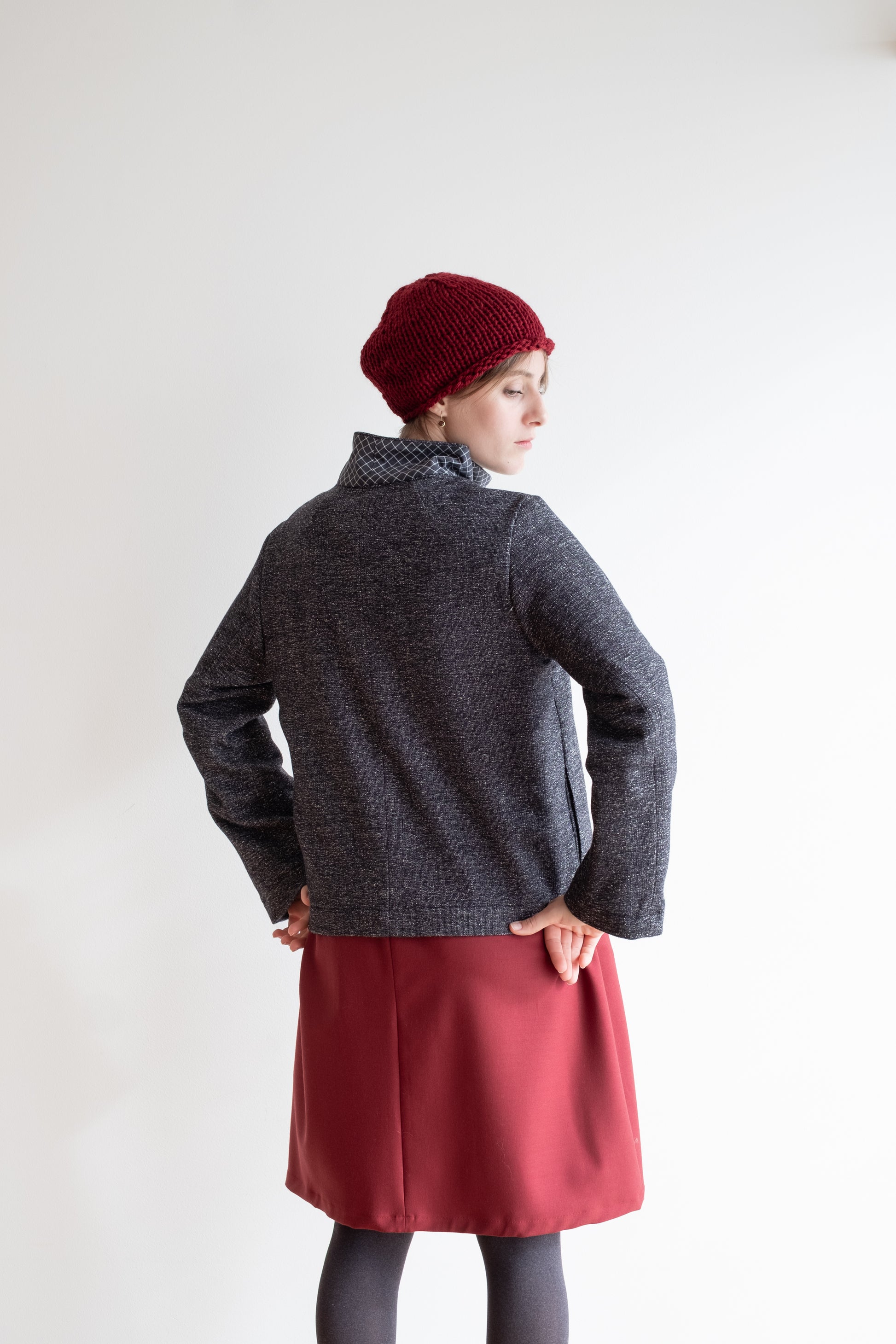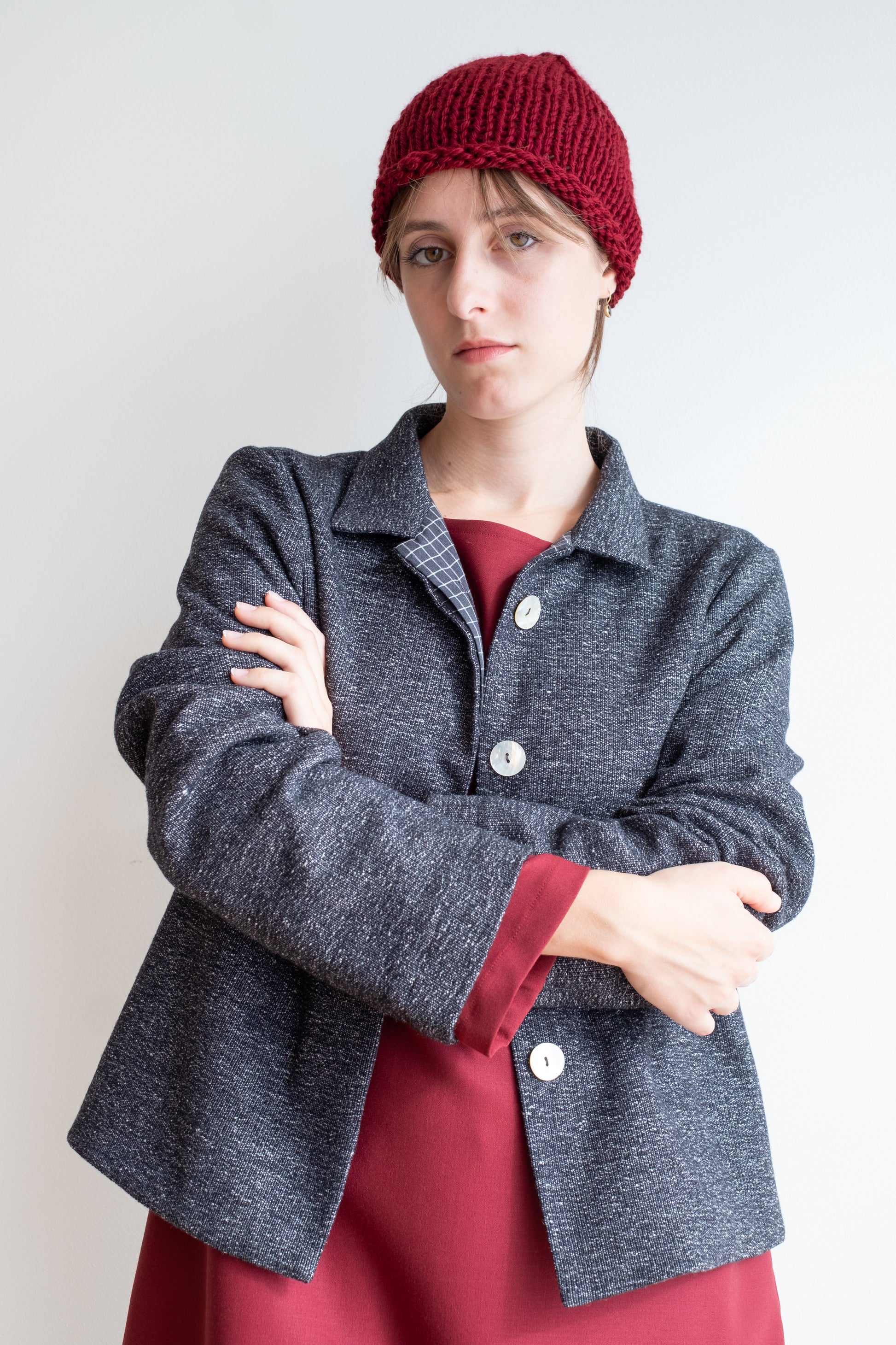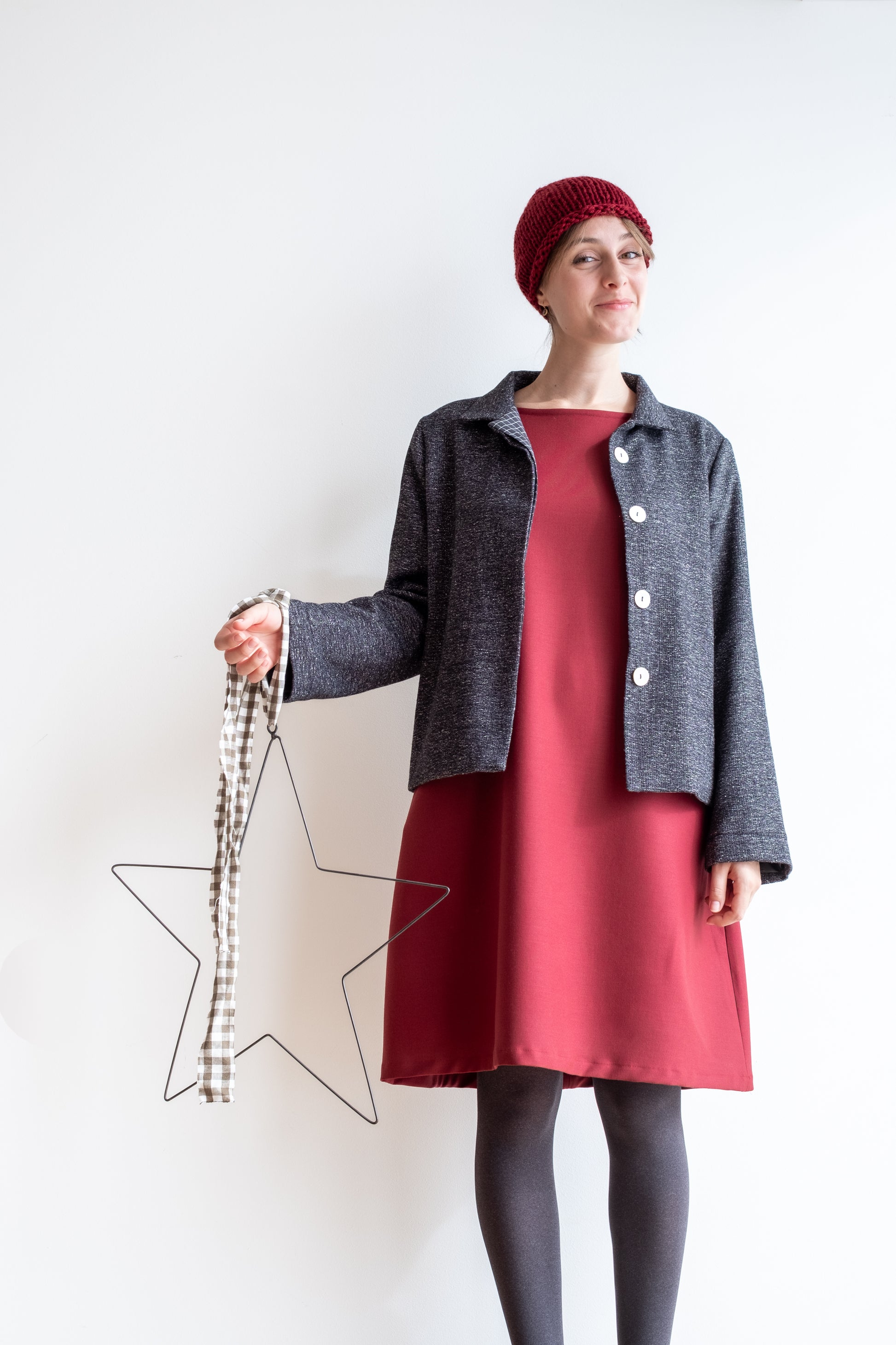 Modello a scatola, colletto morbido, tasche lungo la cucitura laterali, manica lunga foderata, chiusa al centro davanti con abbottonatura nascosta, interno davanti foderato in tessuto.