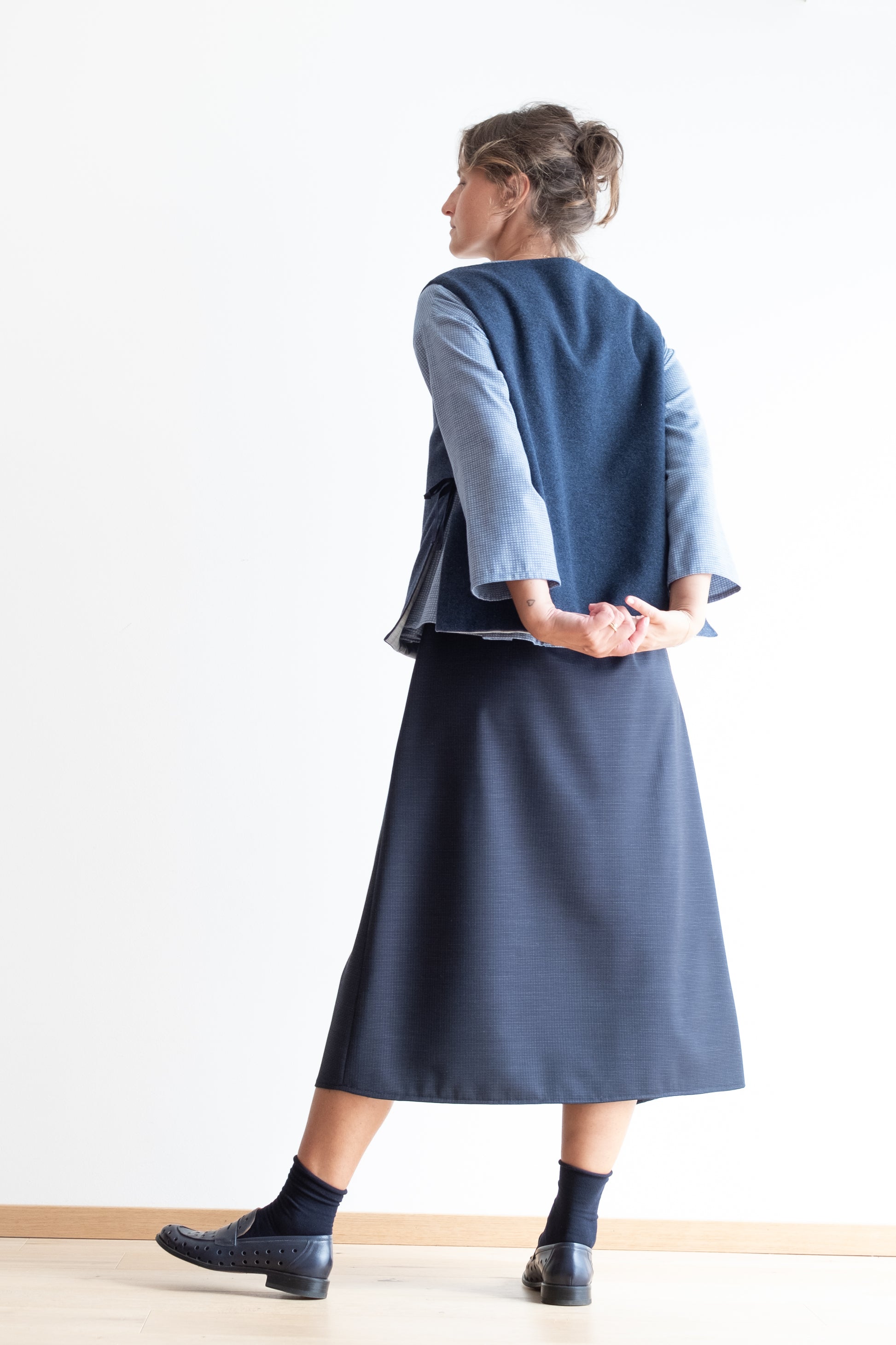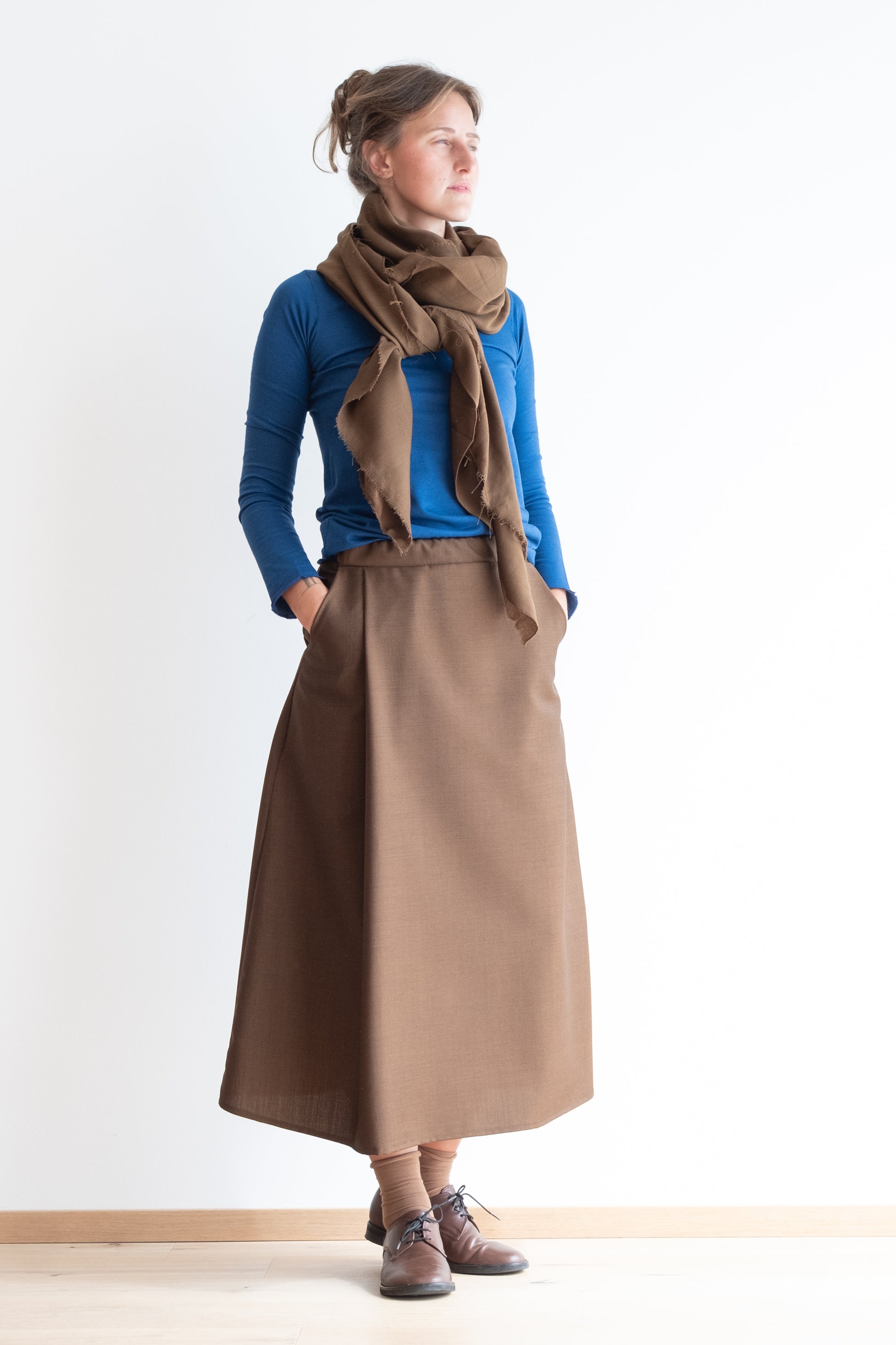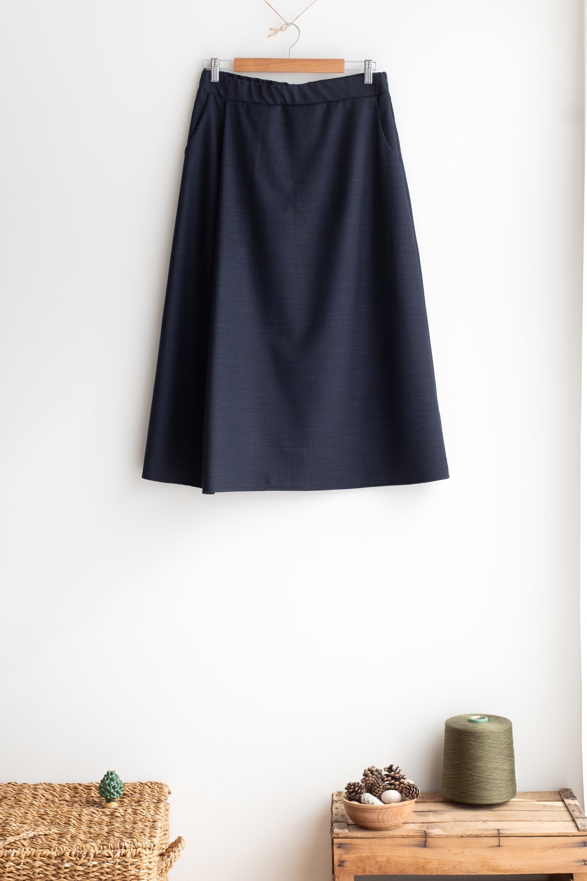 Modello diritto, leggermente a trapezio, sfondo piega laterale sul davanti, con tasche, diritta sul dietro, lunghezza a metà polpaccio, elastico in vita e cerniera laterale.