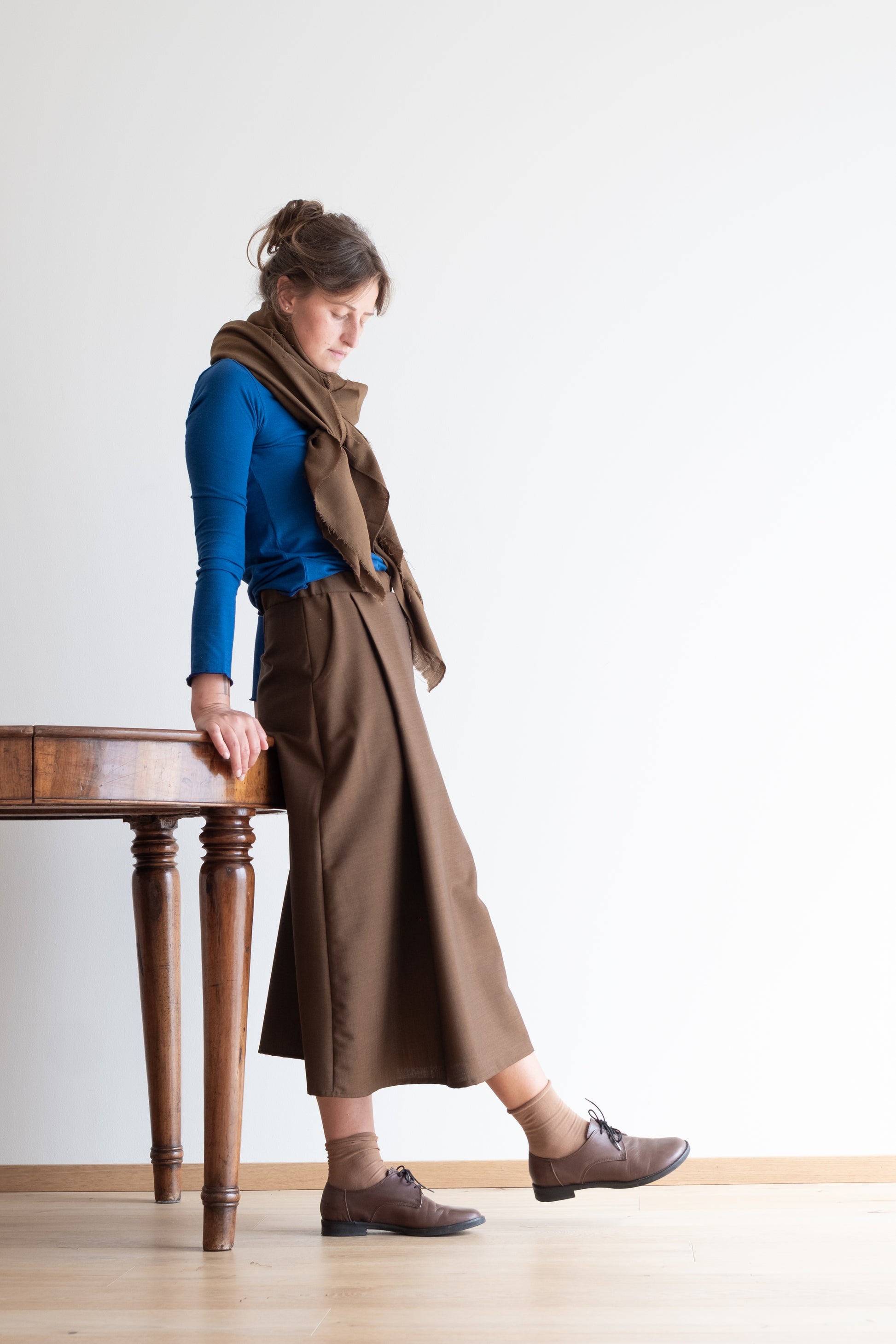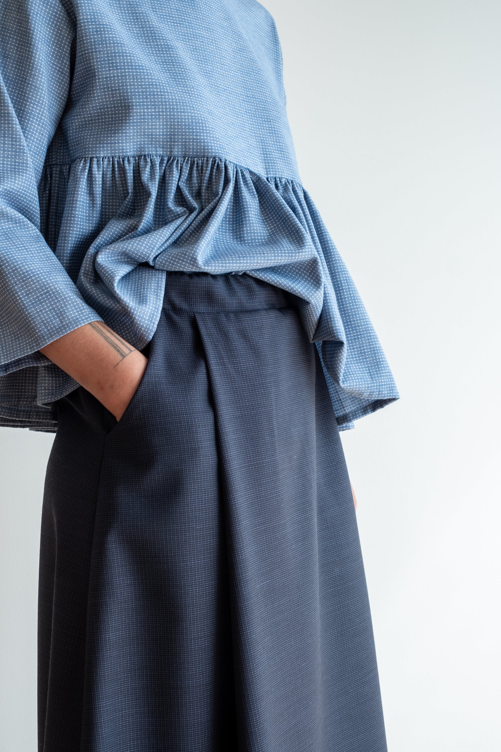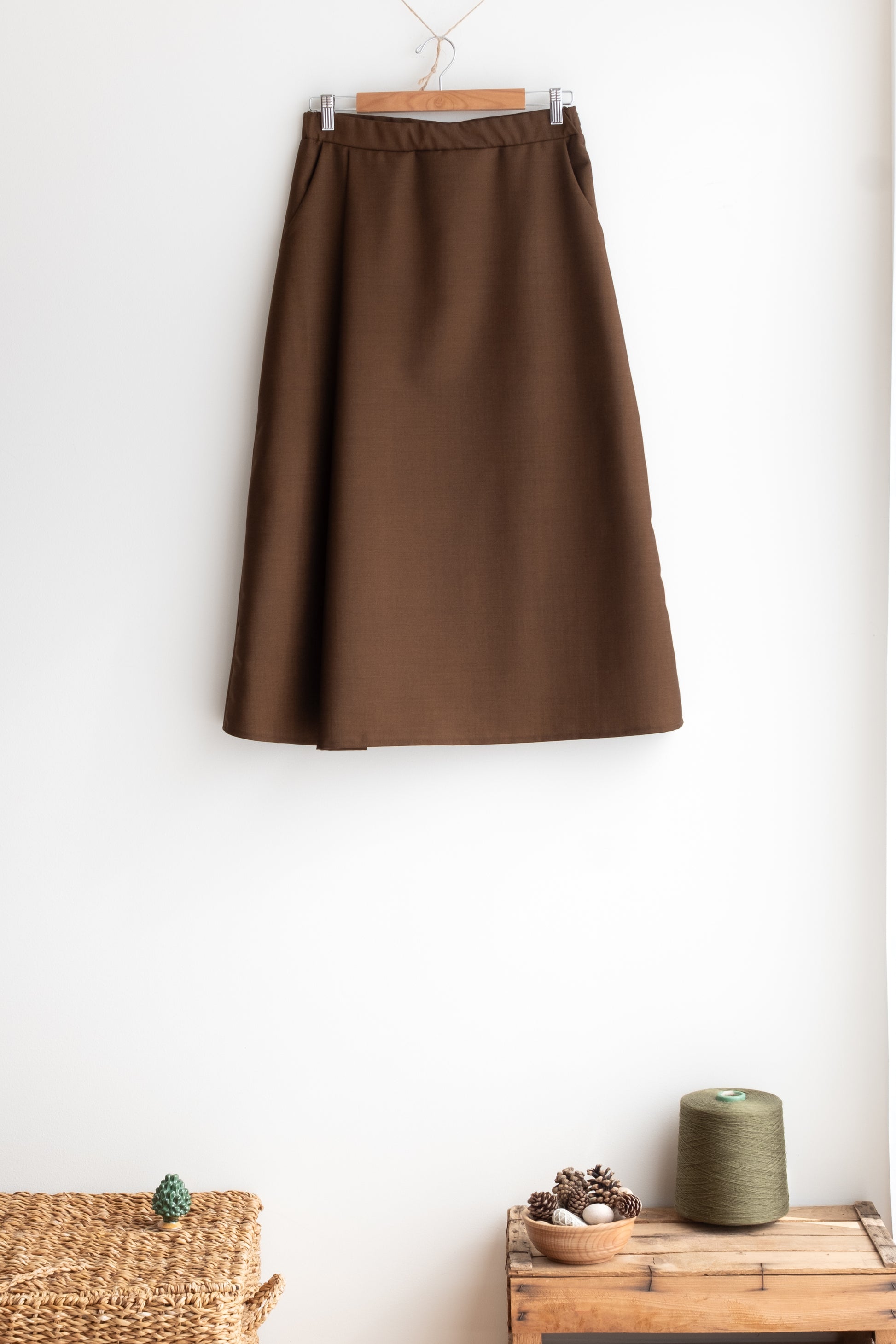 Modello diritto, leggermente a trapezio, sfondo piega laterale sul davanti, con tasche, diritta sul dietro, lunghezza a metà polpaccio, elastico in vita e cerniera laterale.