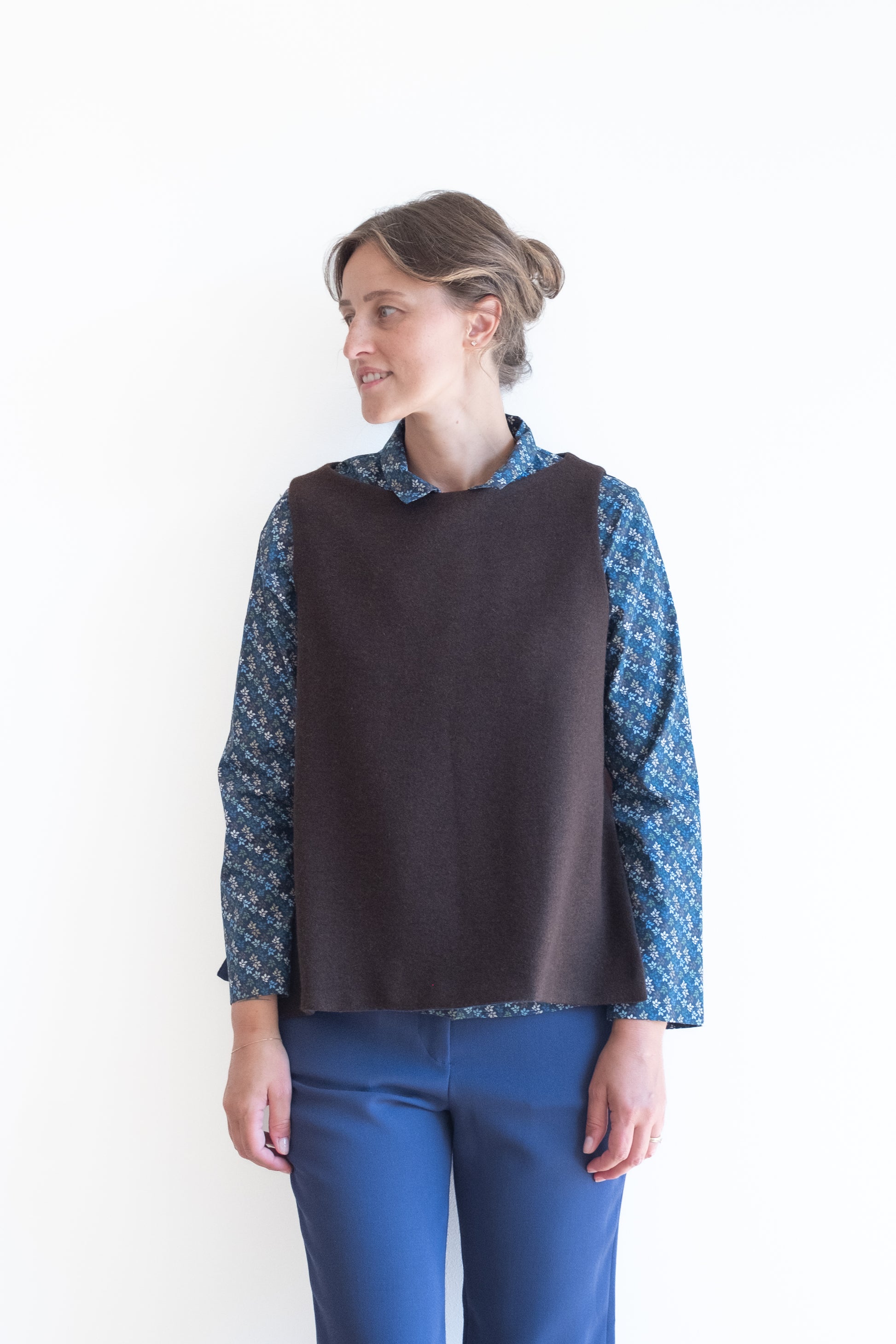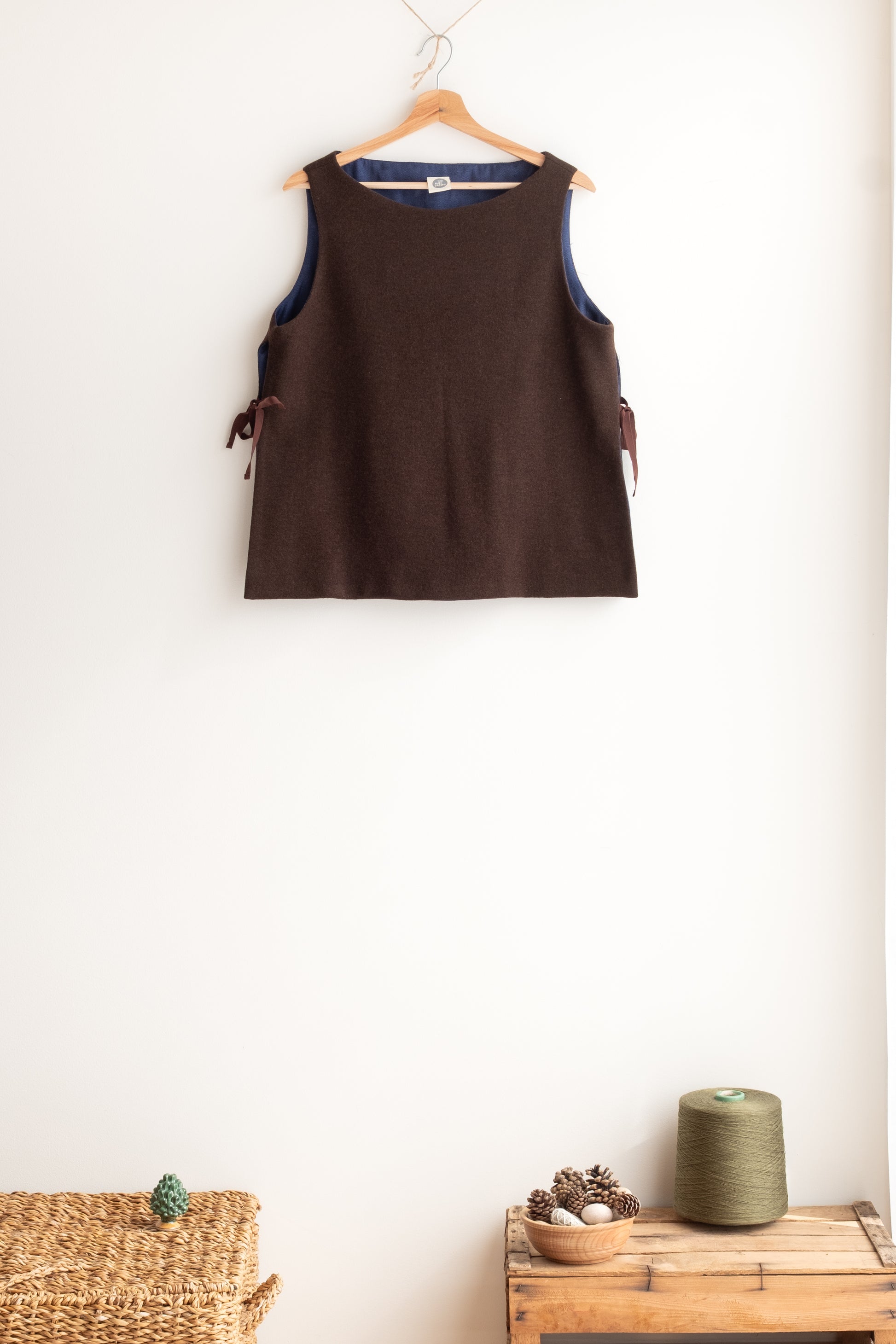 Modello dritto, scollo a barchetta, aperto sui fianchi con nastri a chiudere gli spacchi. Esterno in lana cotta, interno in cotone a contrasto.