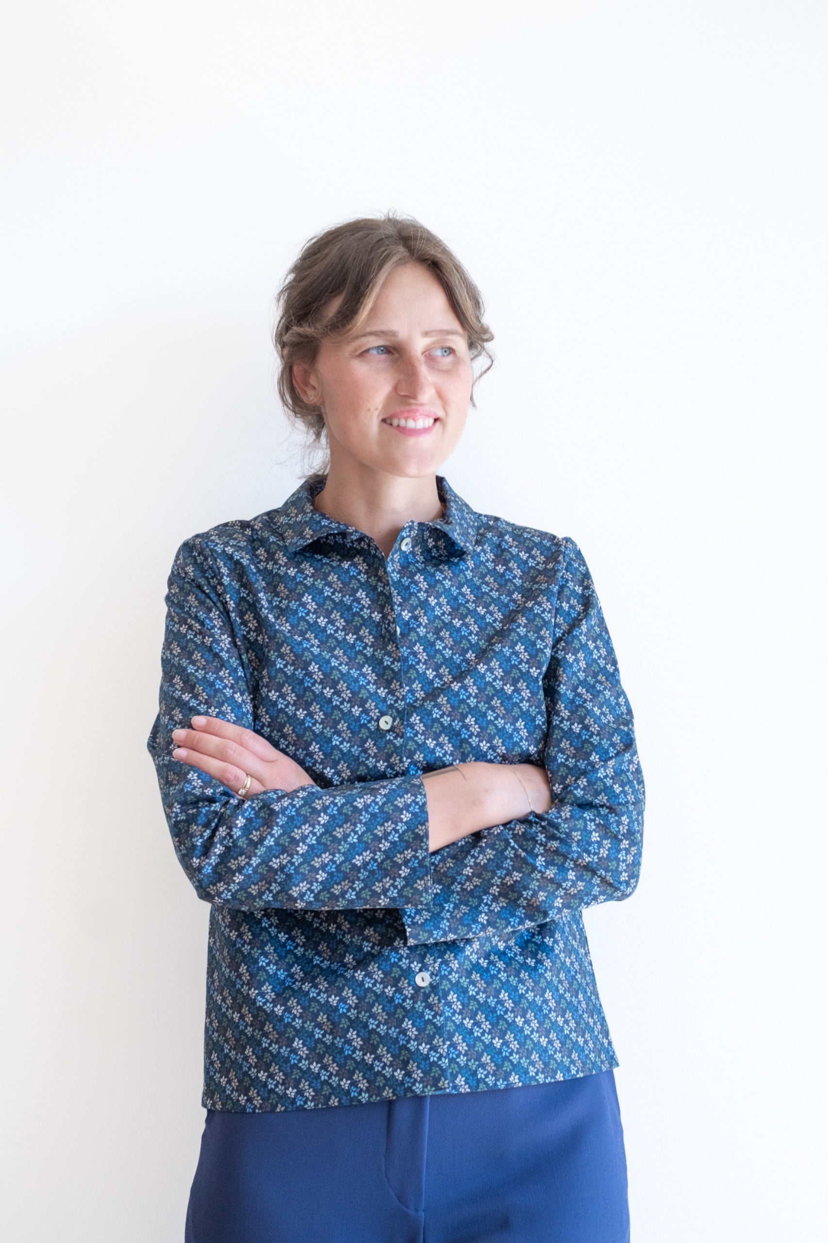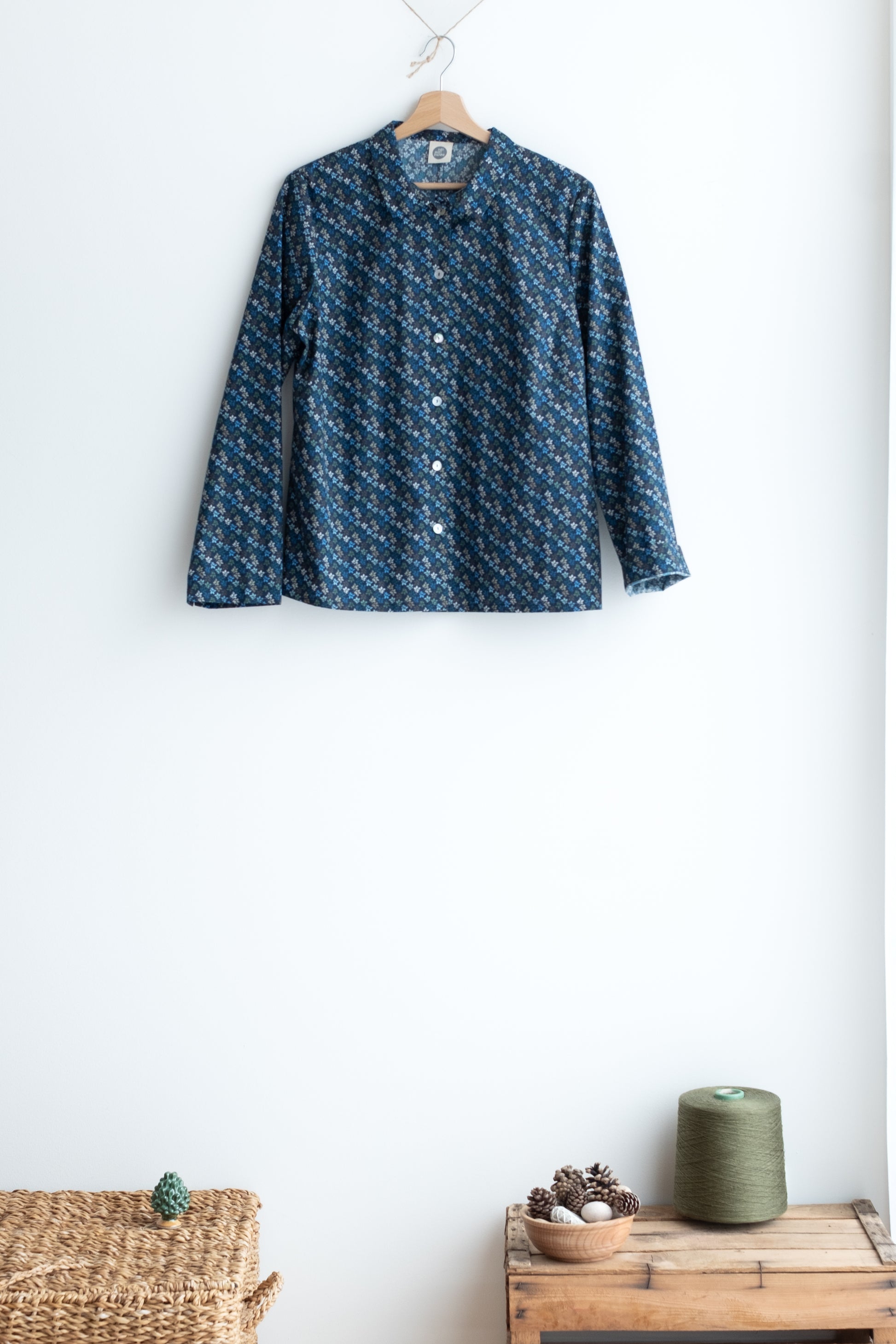 Modello dritto abbottonato sul davanti con piccoli bottoni di madreperla, leggermente sciancrato, scollo rotondo con colletto, manica a tre quarti e spacchetto in fondo alla manica.