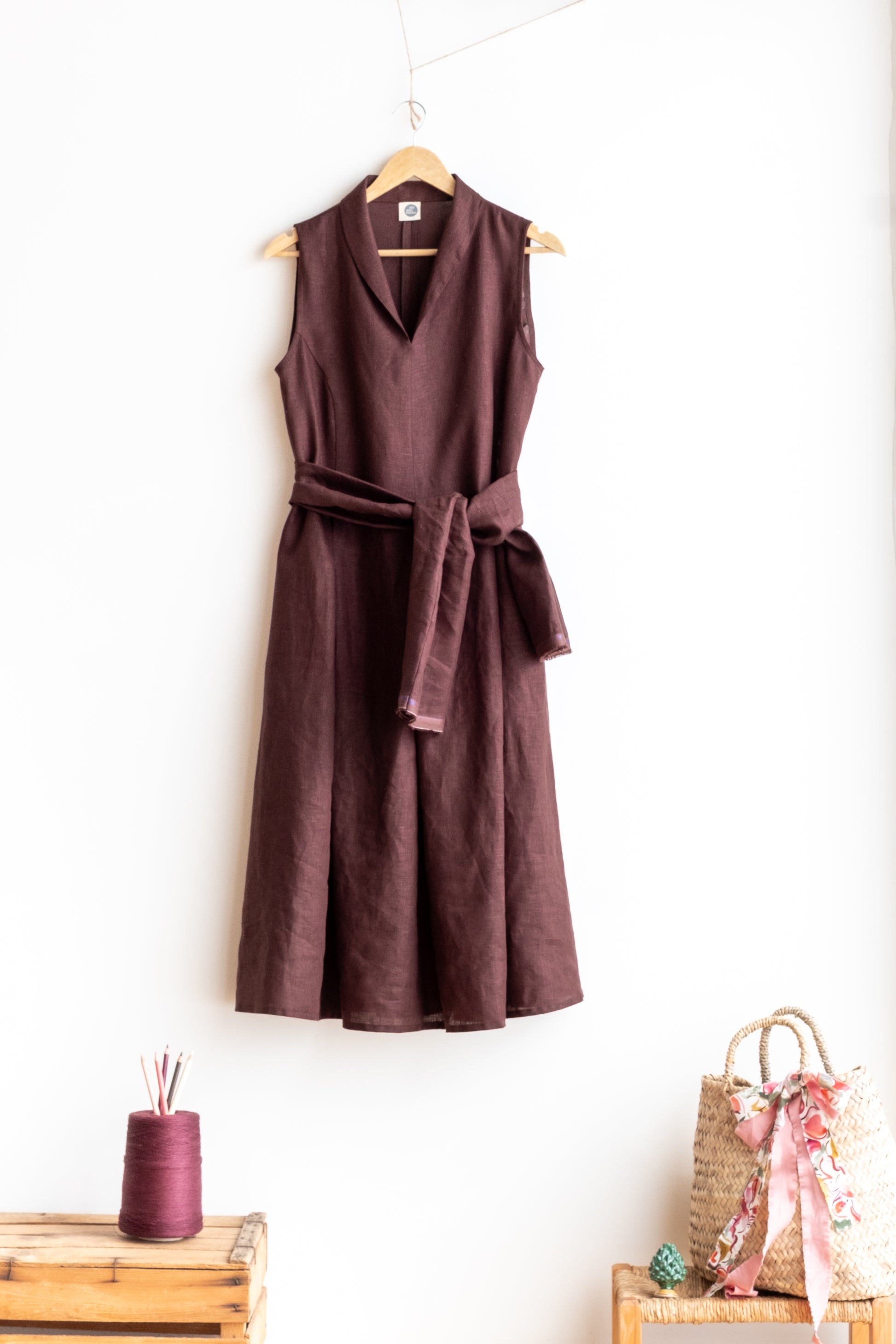 Modello ampio, corpino smanicato svasato con scollo a V e colletto rialzato, gonna ampia con sfondi piega doppi, tasche lungo i fianchi, lunghezza a metà polpaccio. Fusciacca
