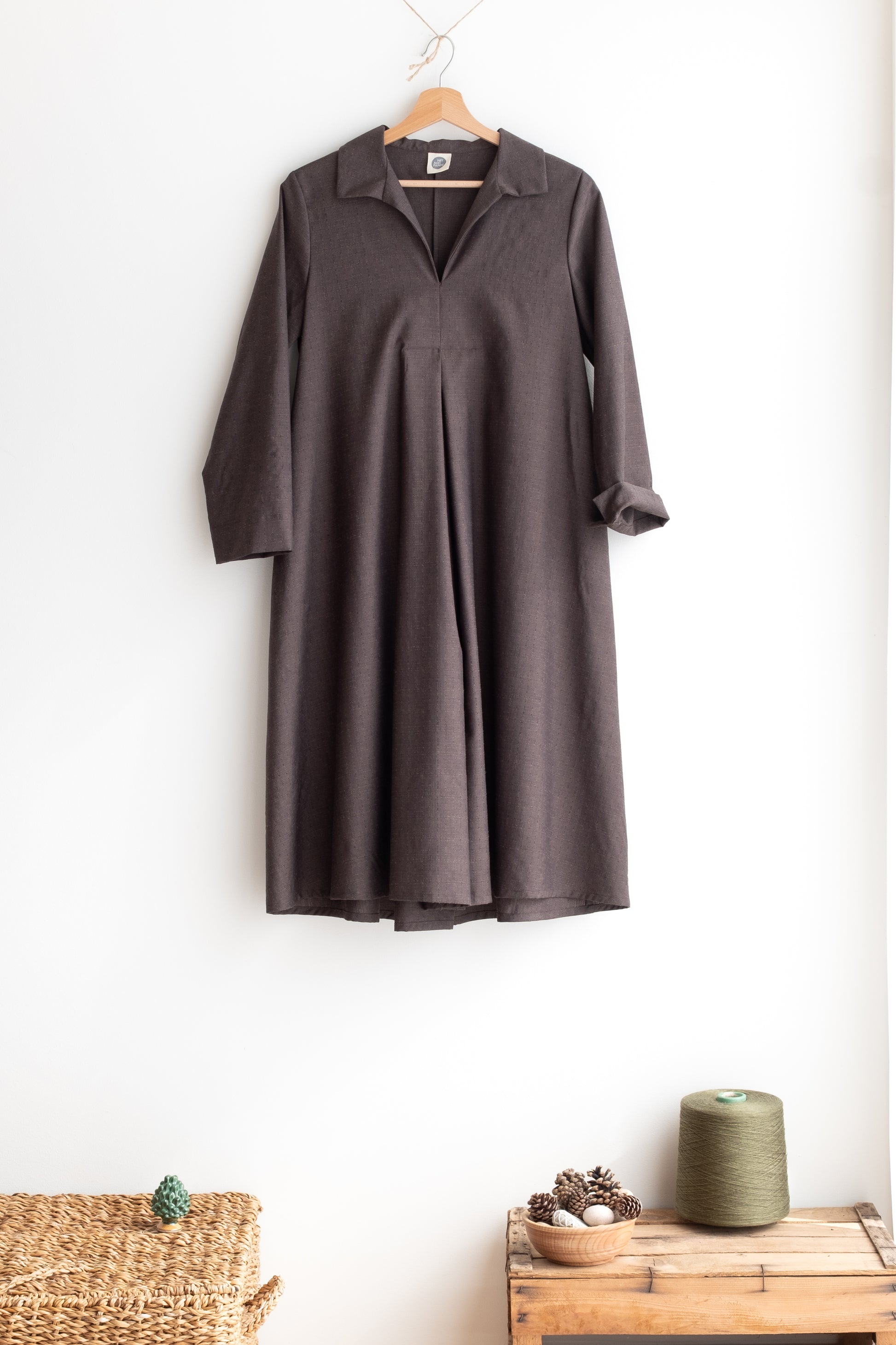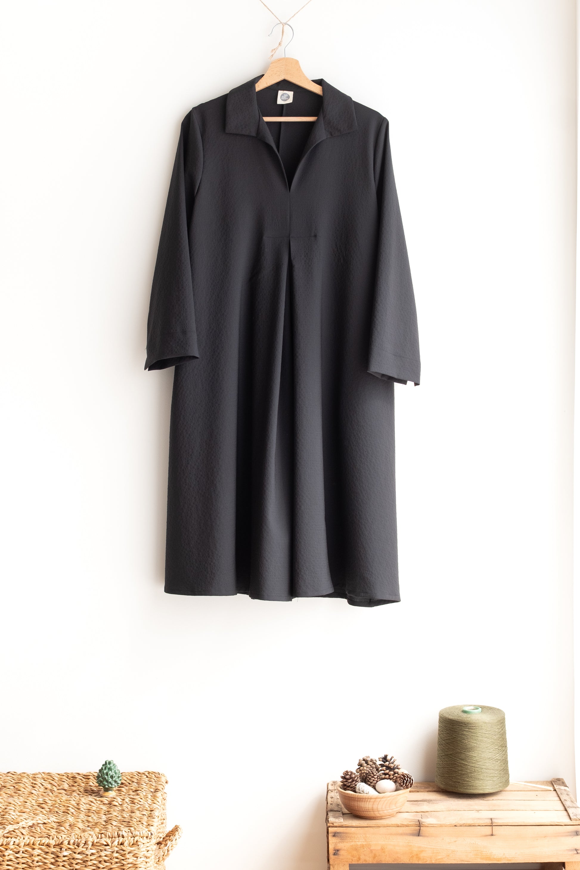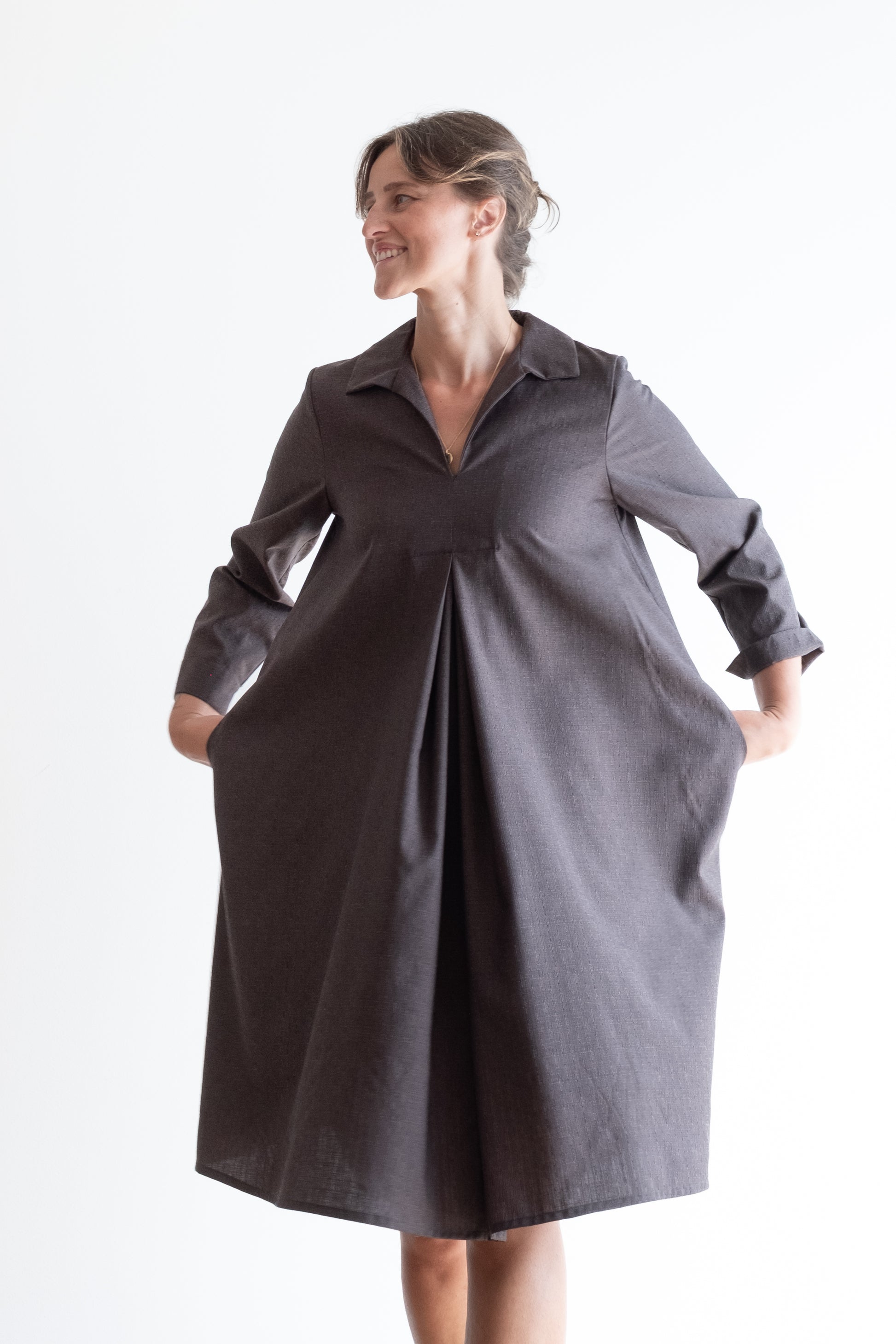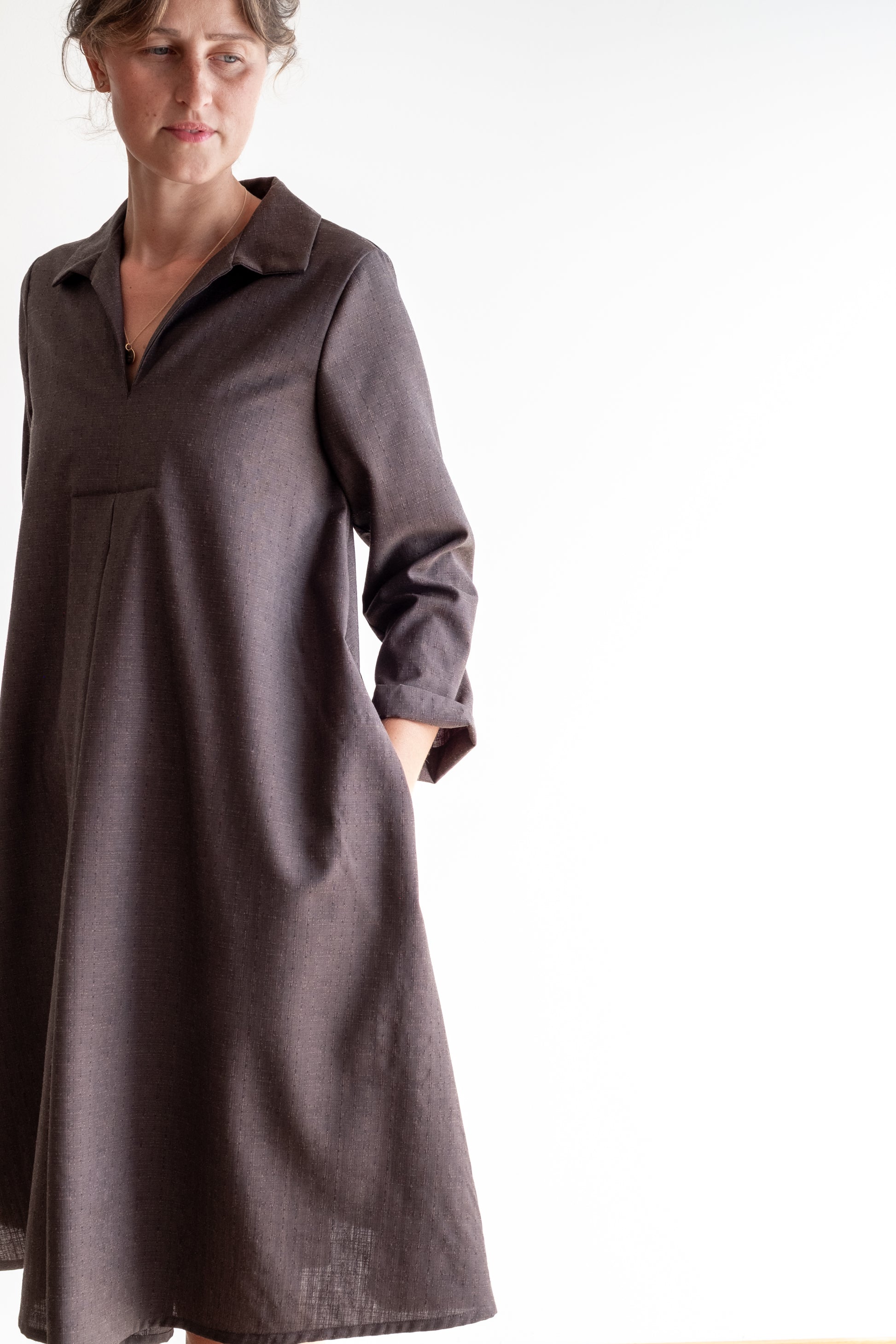 Abito ampio, scollo a V con colletto dritto, doppio sfondo piega al centro davanti e al centro dietro, lunghezza sotto al ginocchio, manica 3/4, tasche nascoste inserite lungo le cuciture laterali.
