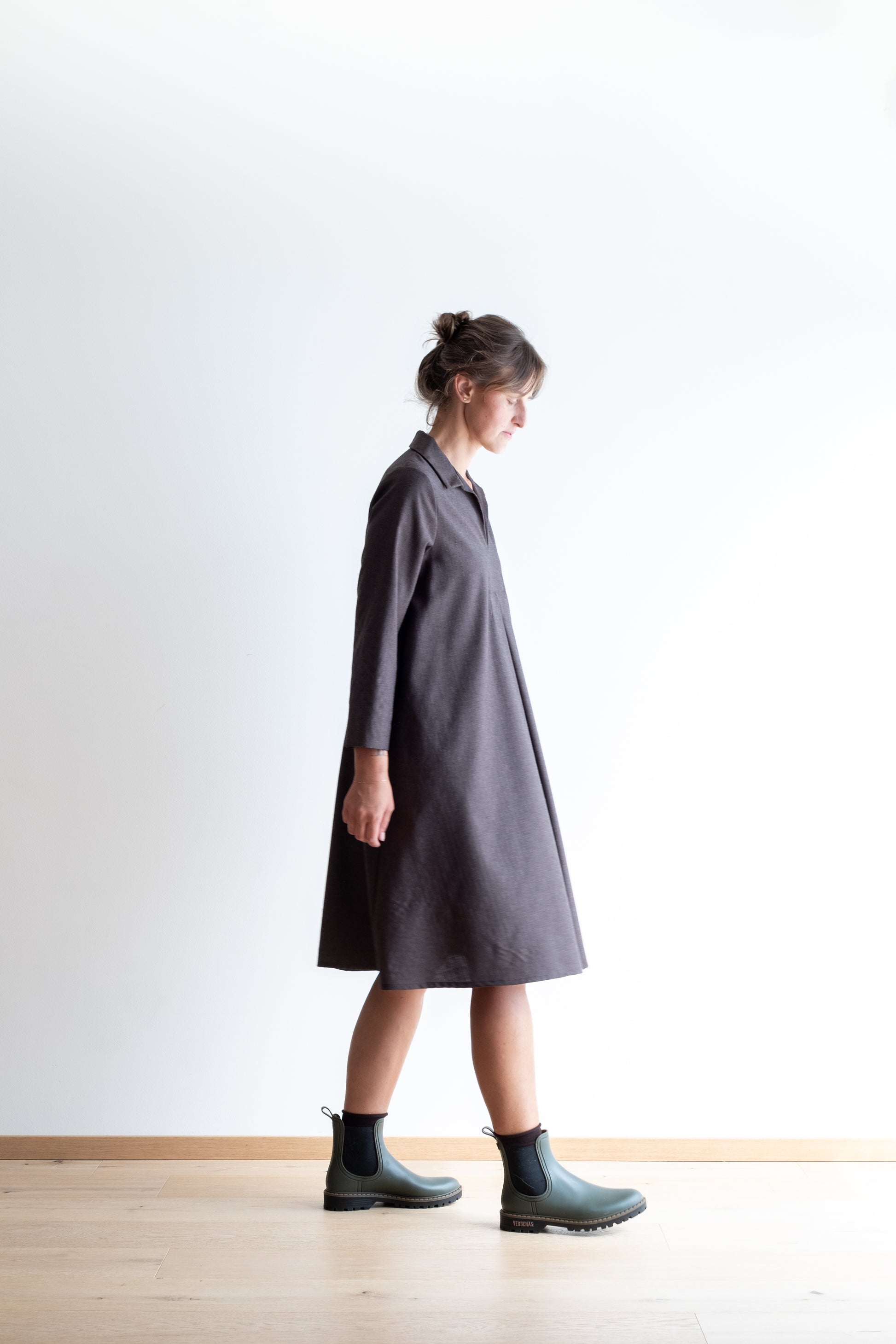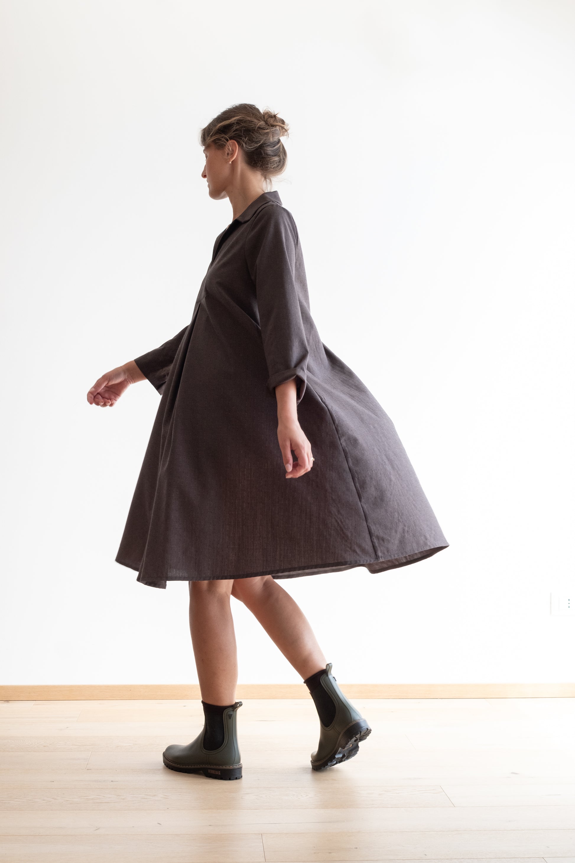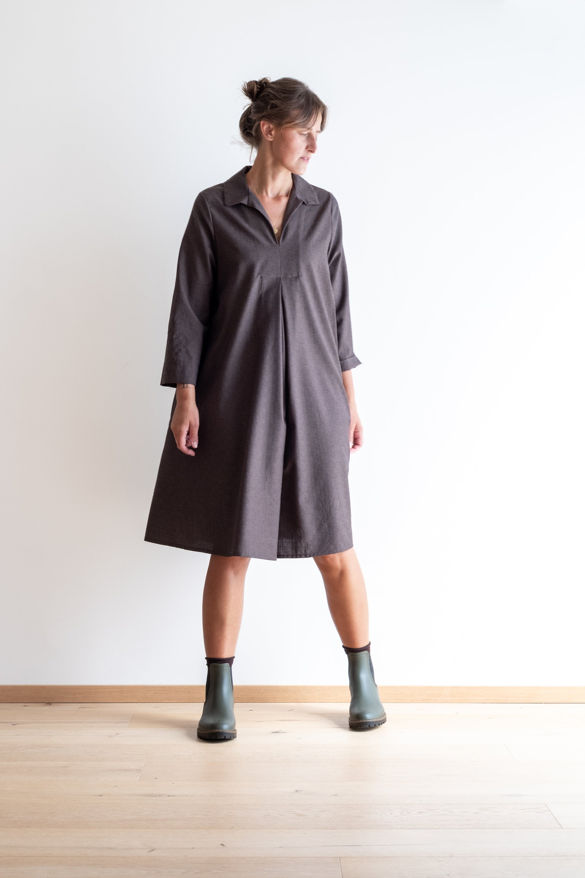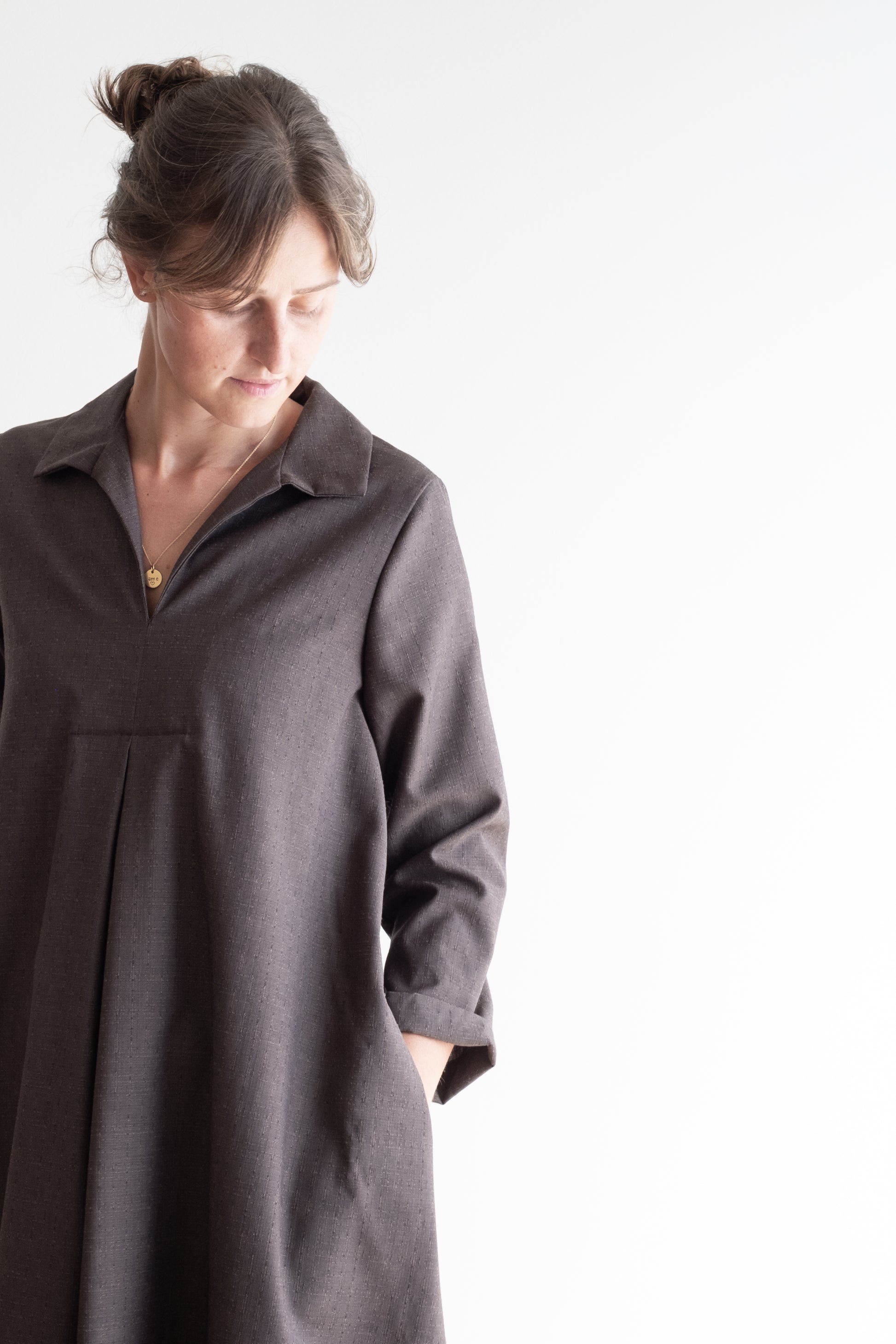 Abito ampio, scollo a V con colletto dritto, doppio sfondo piega al centro davanti e al centro dietro, lunghezza sotto al ginocchio, manica 3/4, tasche nascoste inserite lungo le cuciture laterali.