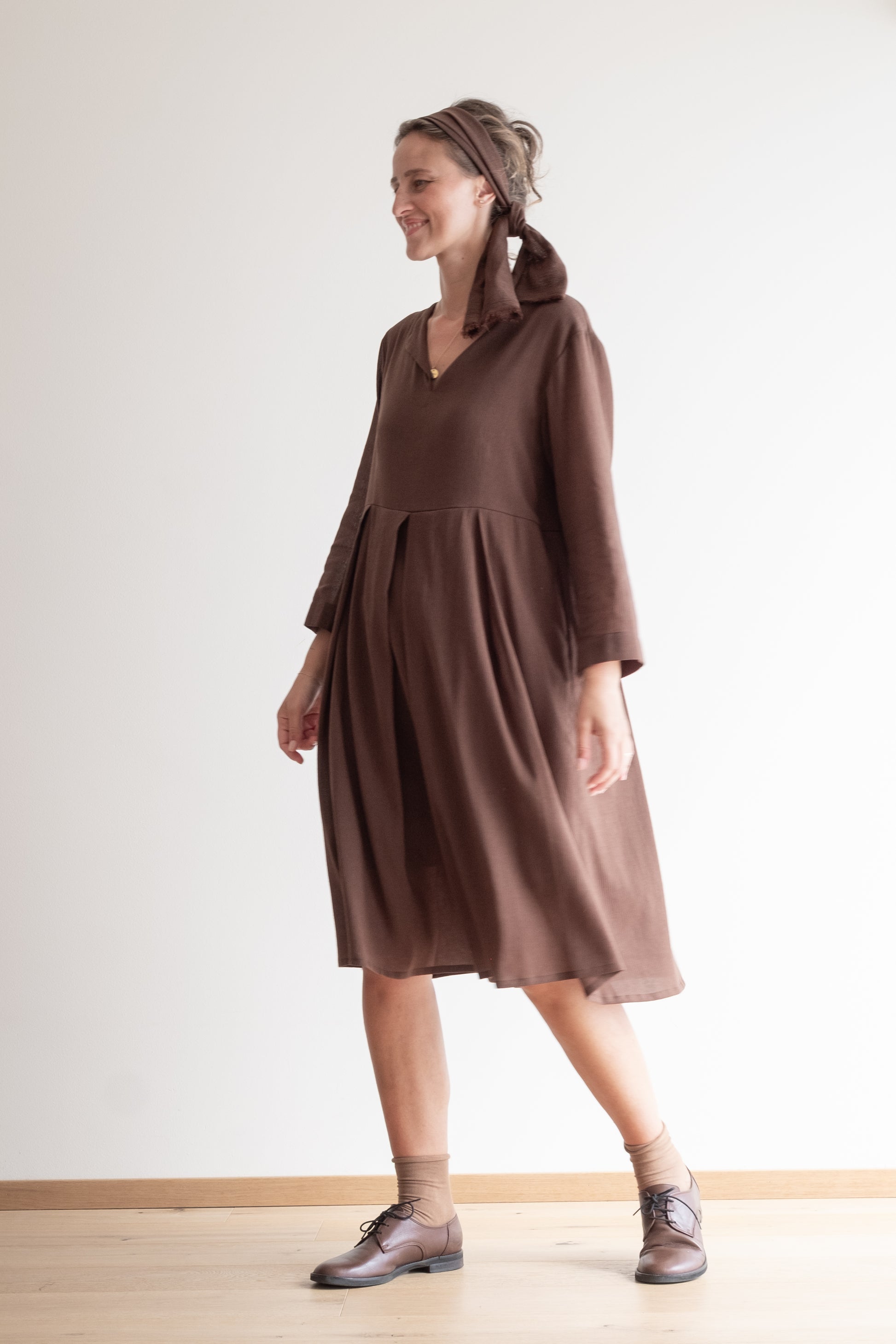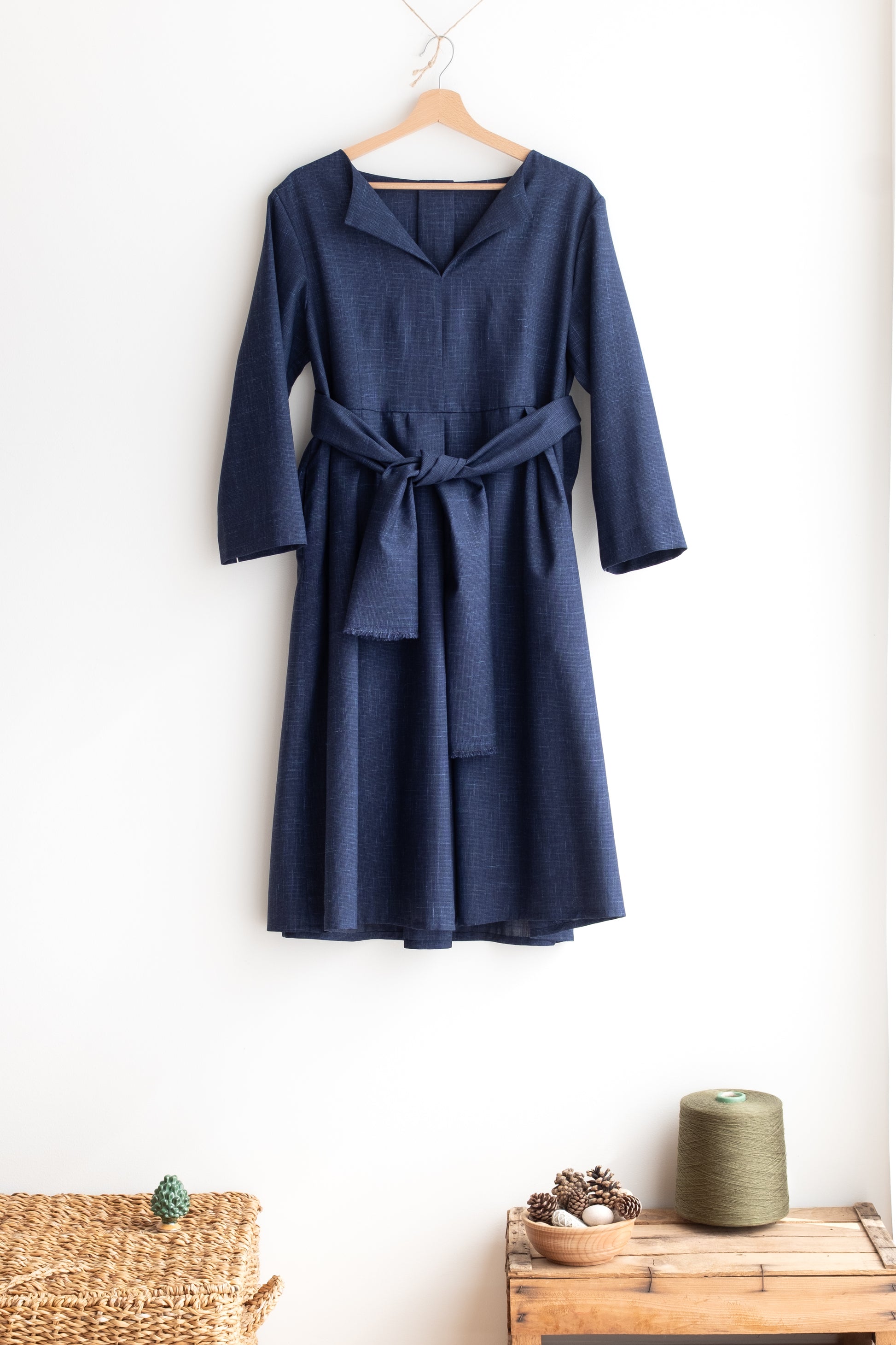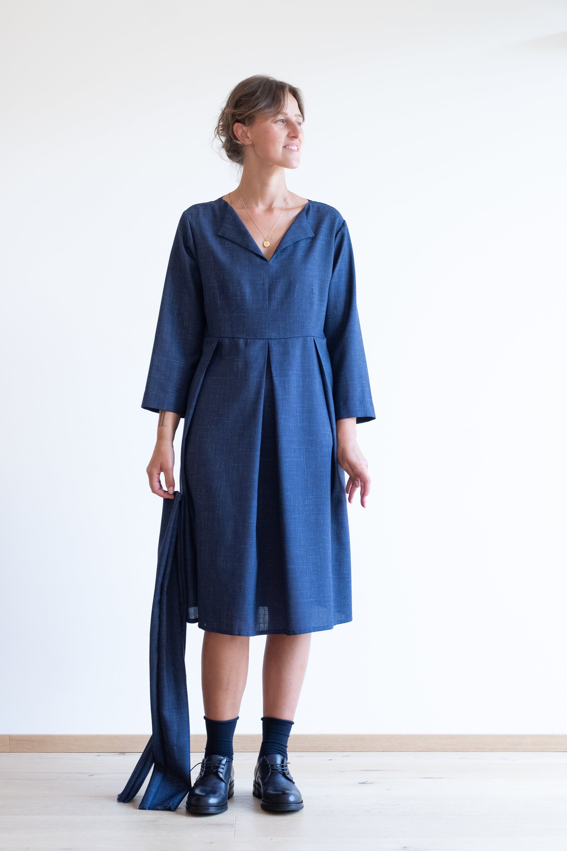 Abito con scollo a V, tasche, gonna ampia, lunghezza al ginocchio. Con fusciacca.