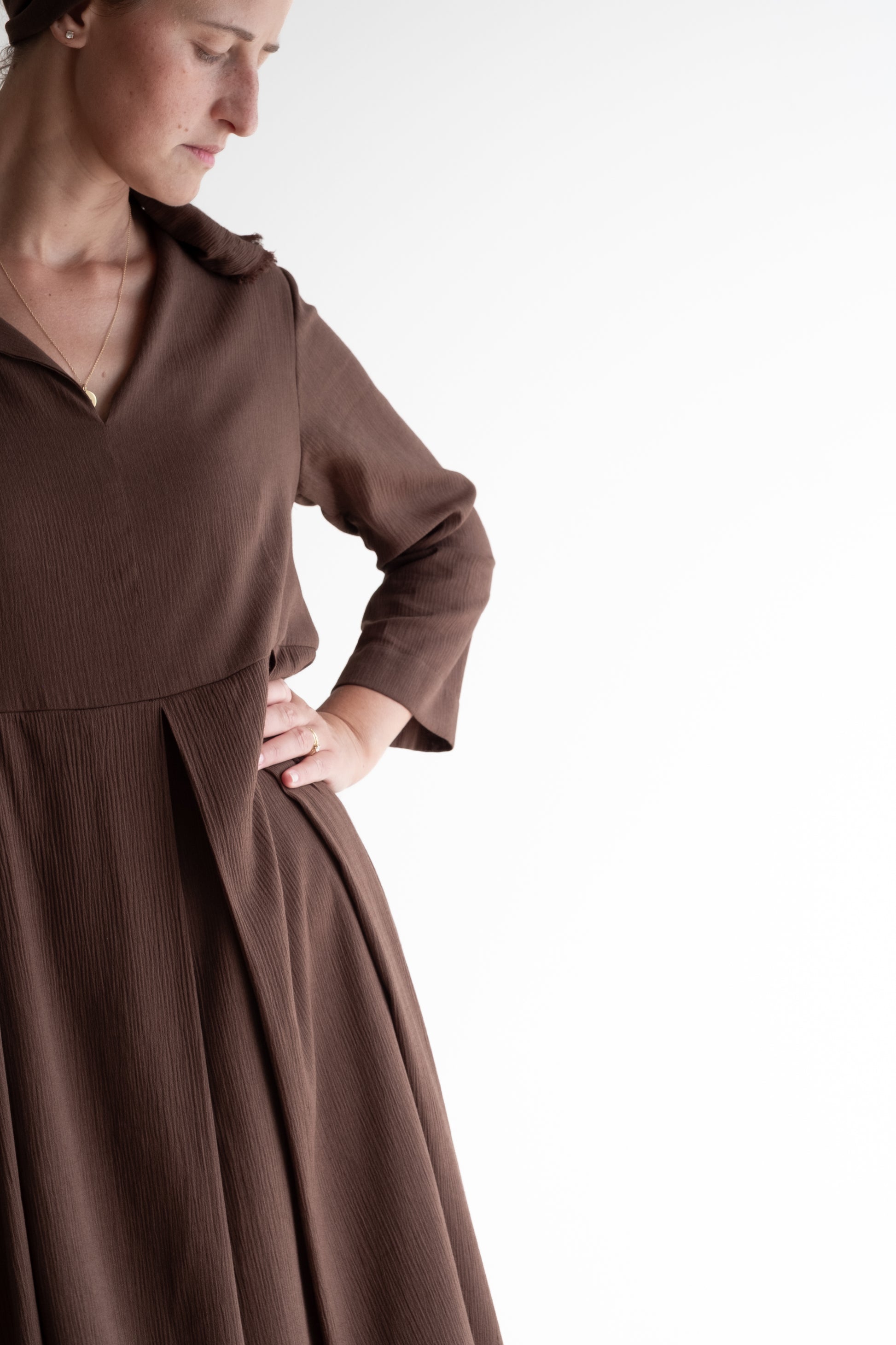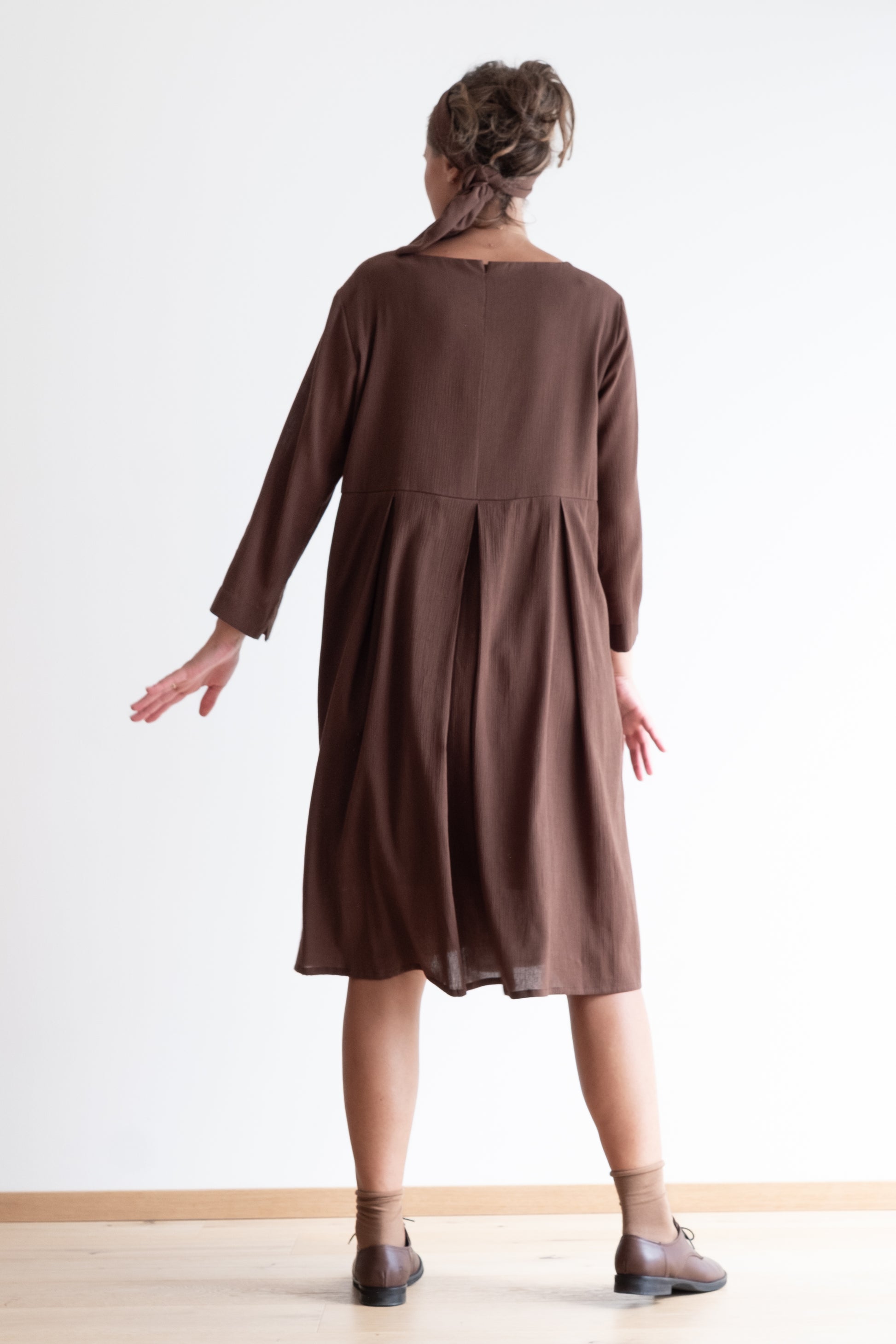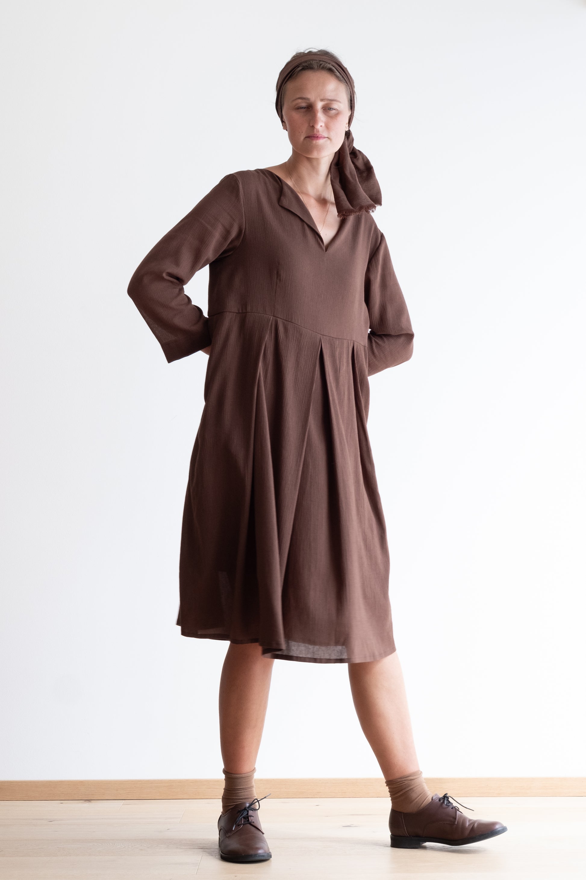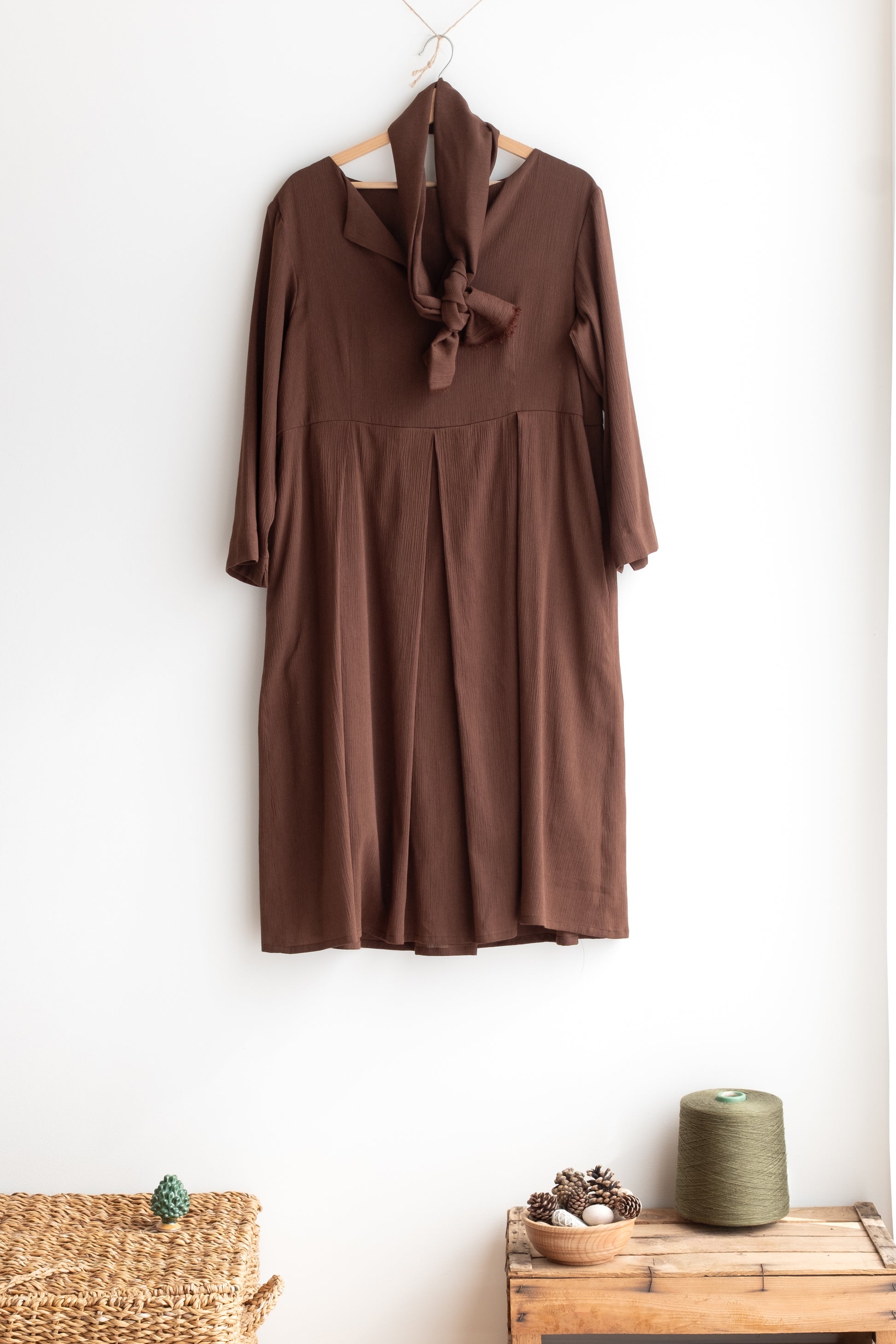 Abito con scollo a V, tasche, gonna ampia, lunghezza al ginocchio. Con fusciacca.