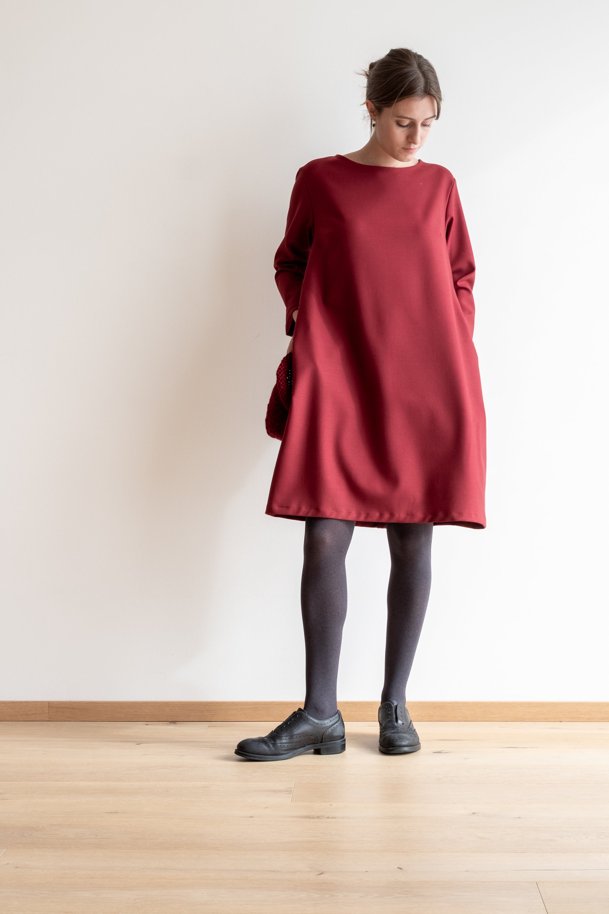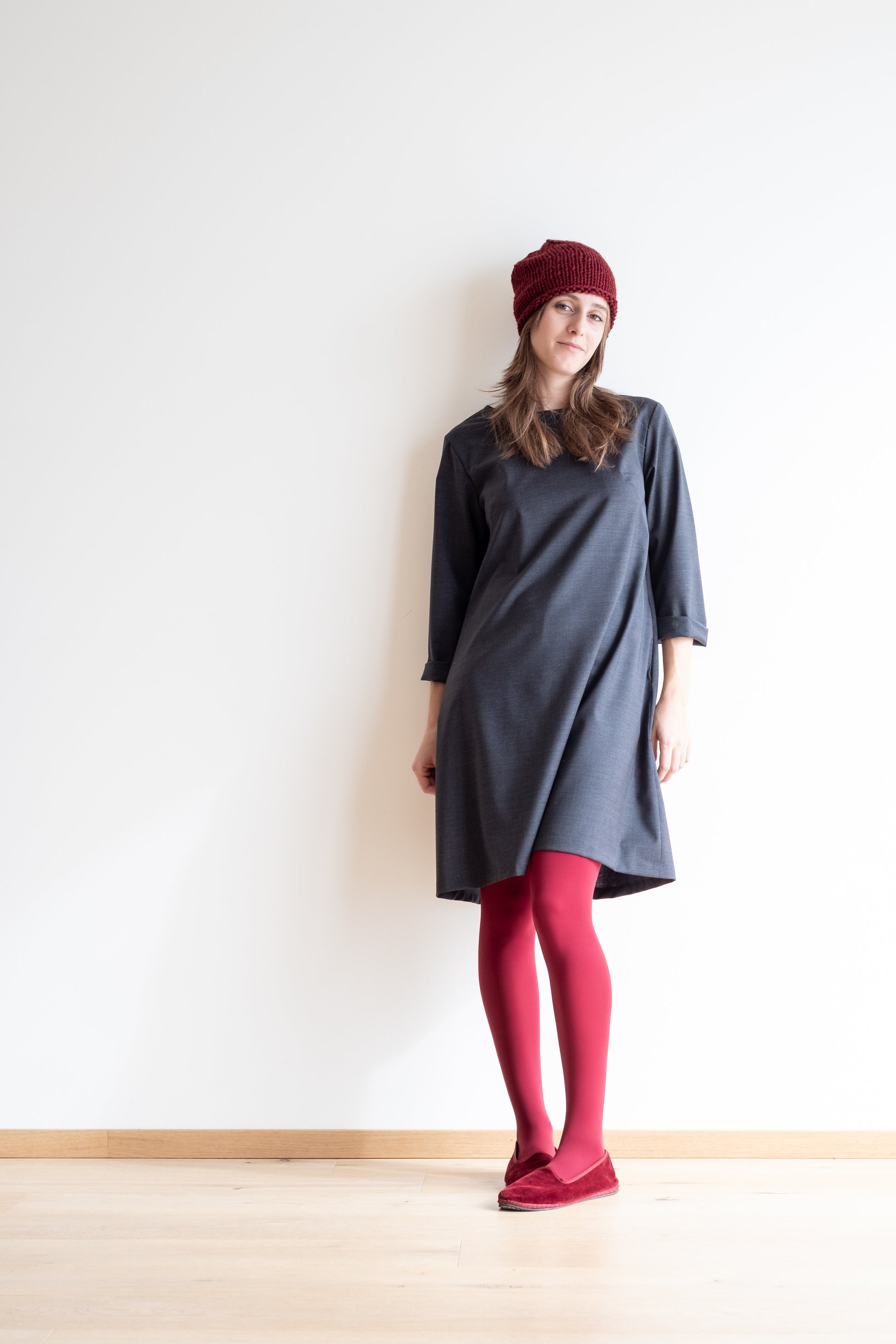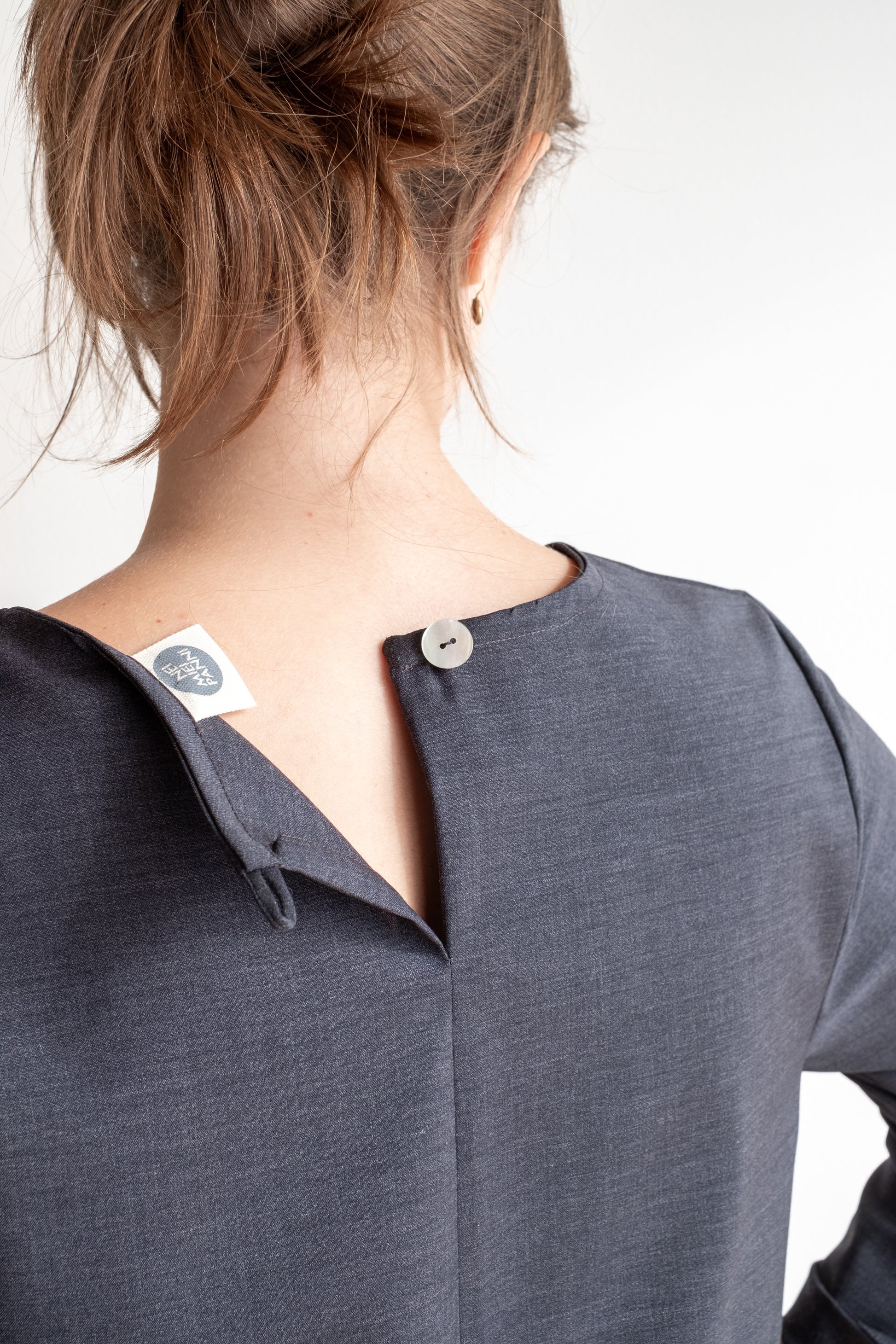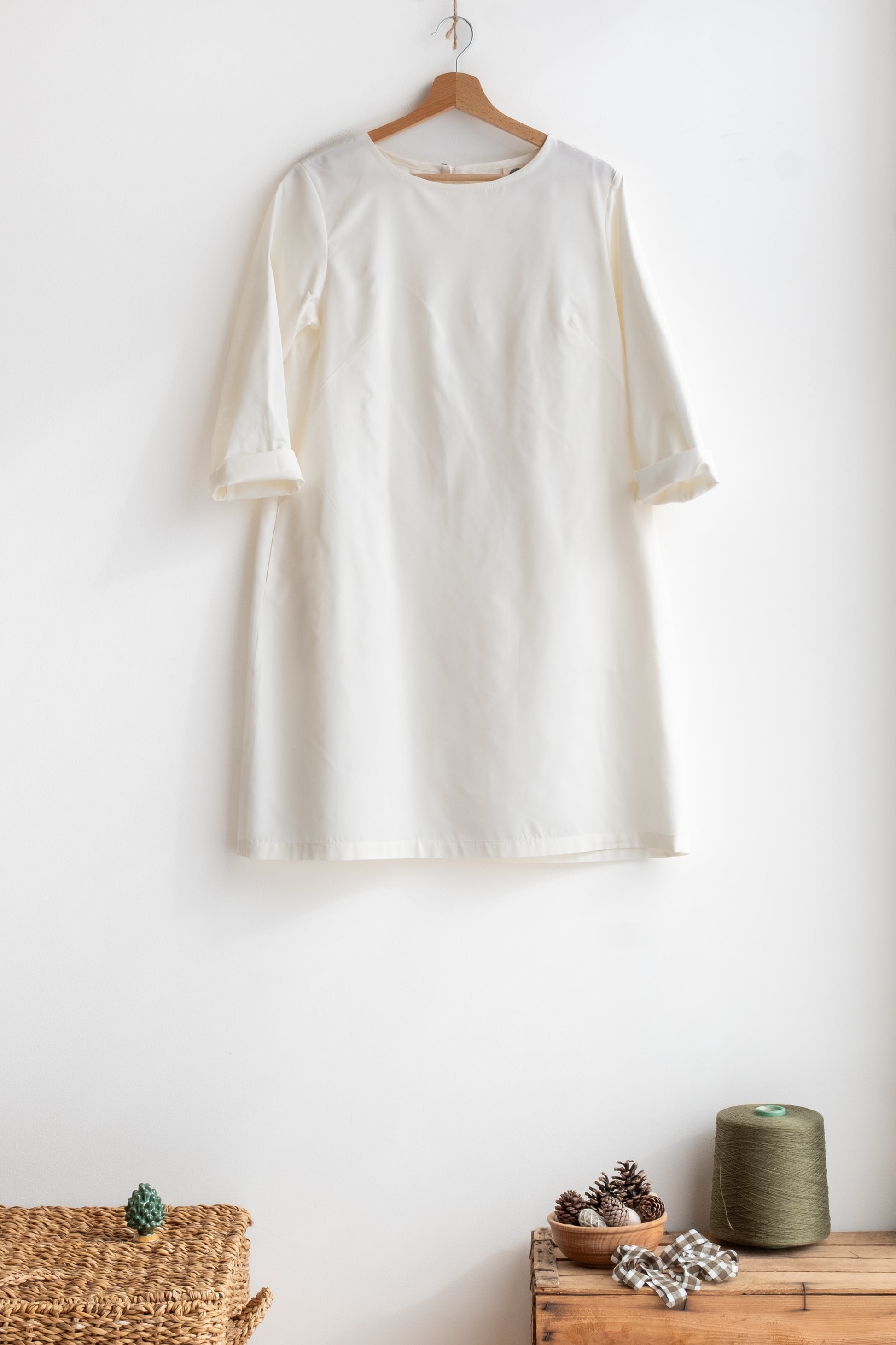 Modello diritto, scollo rotondo, chiuso con un bottoncino sulla schiena, manica lunga.