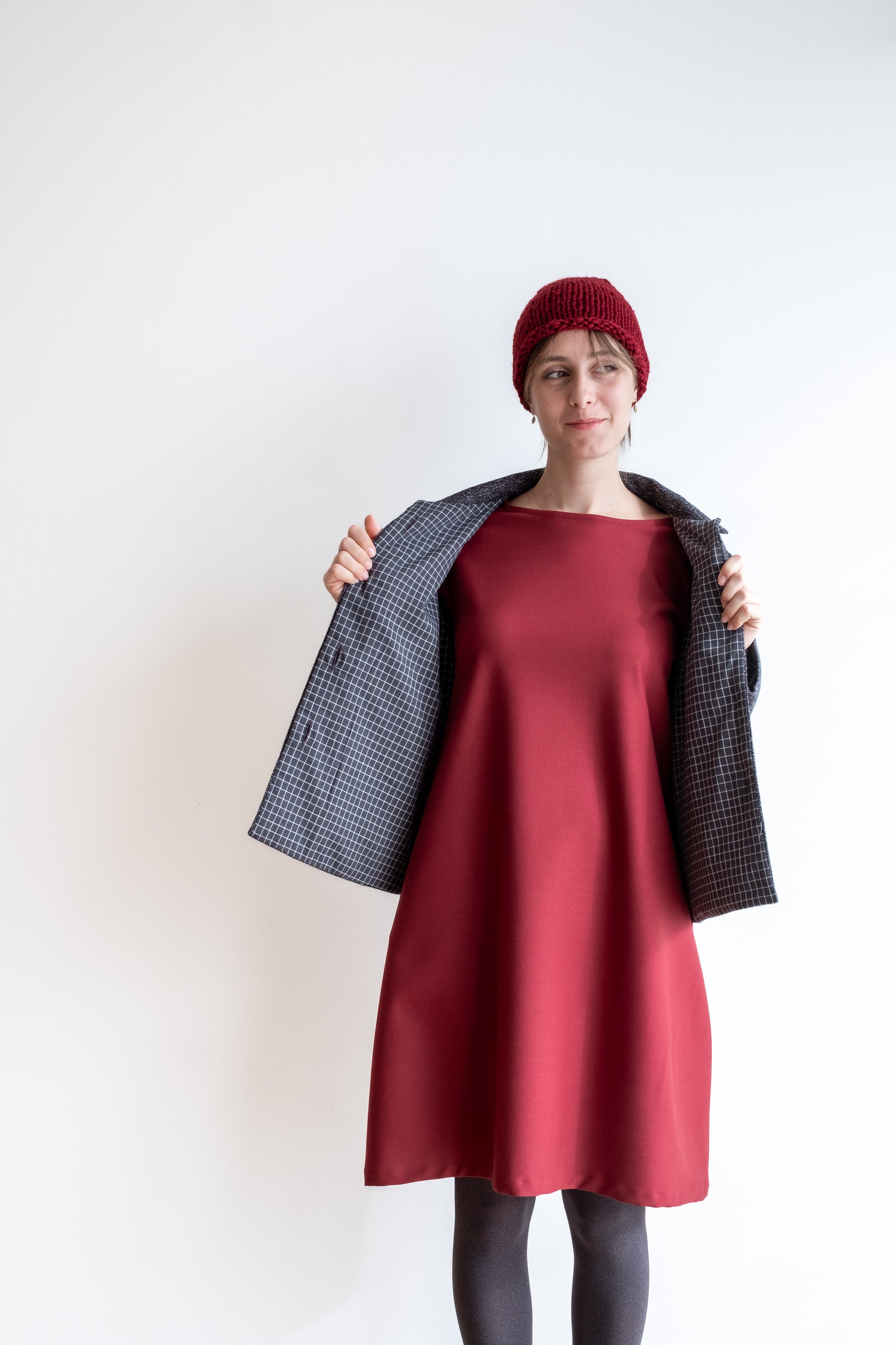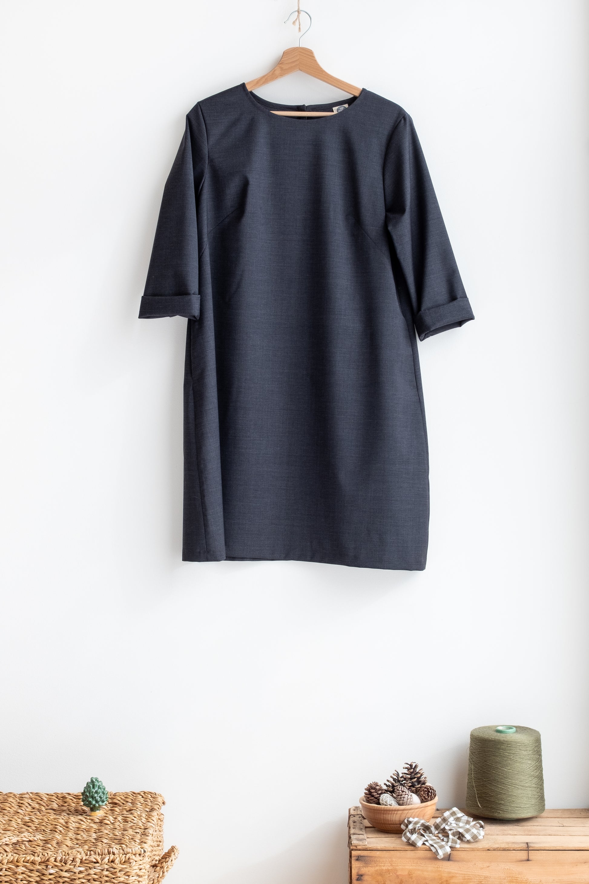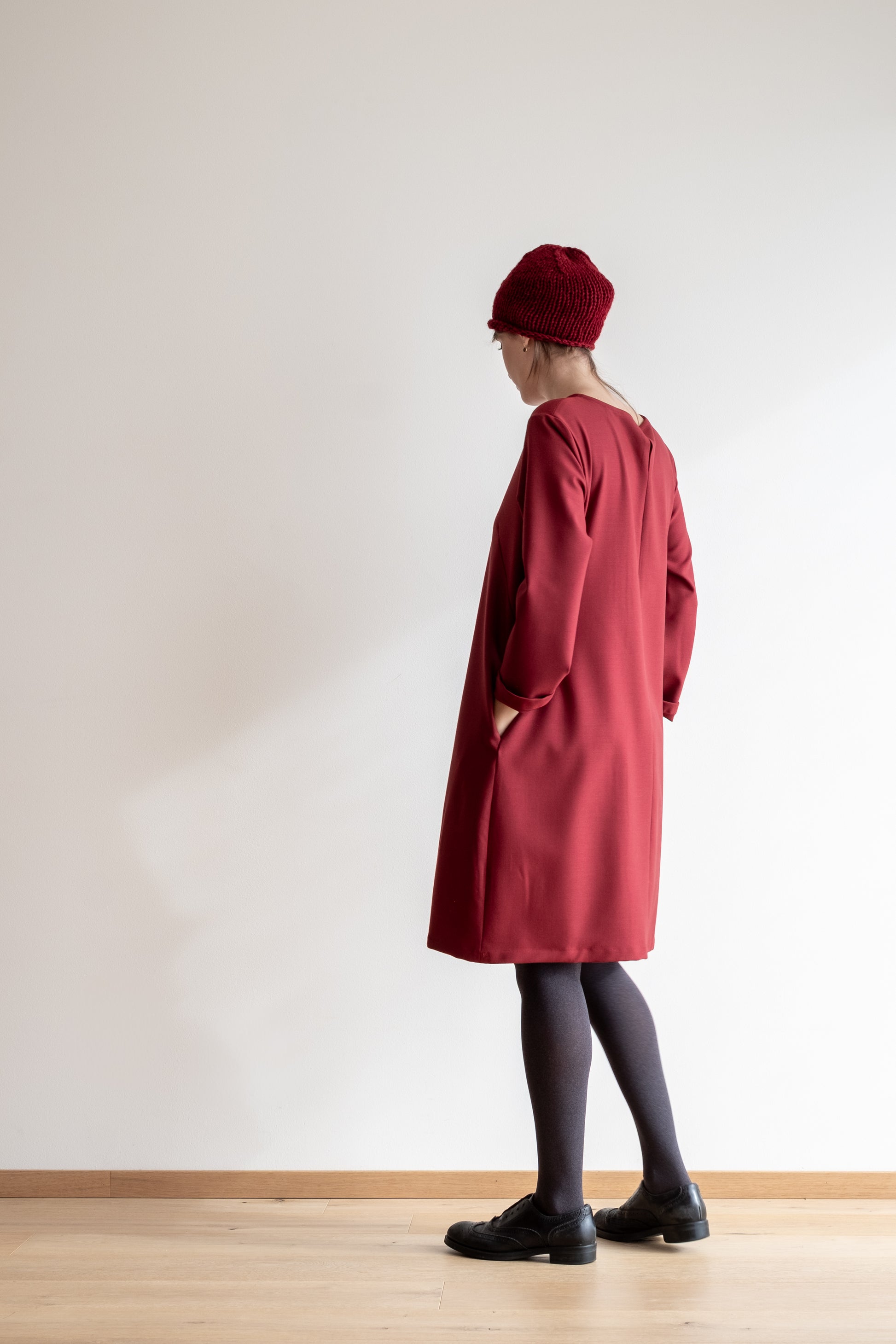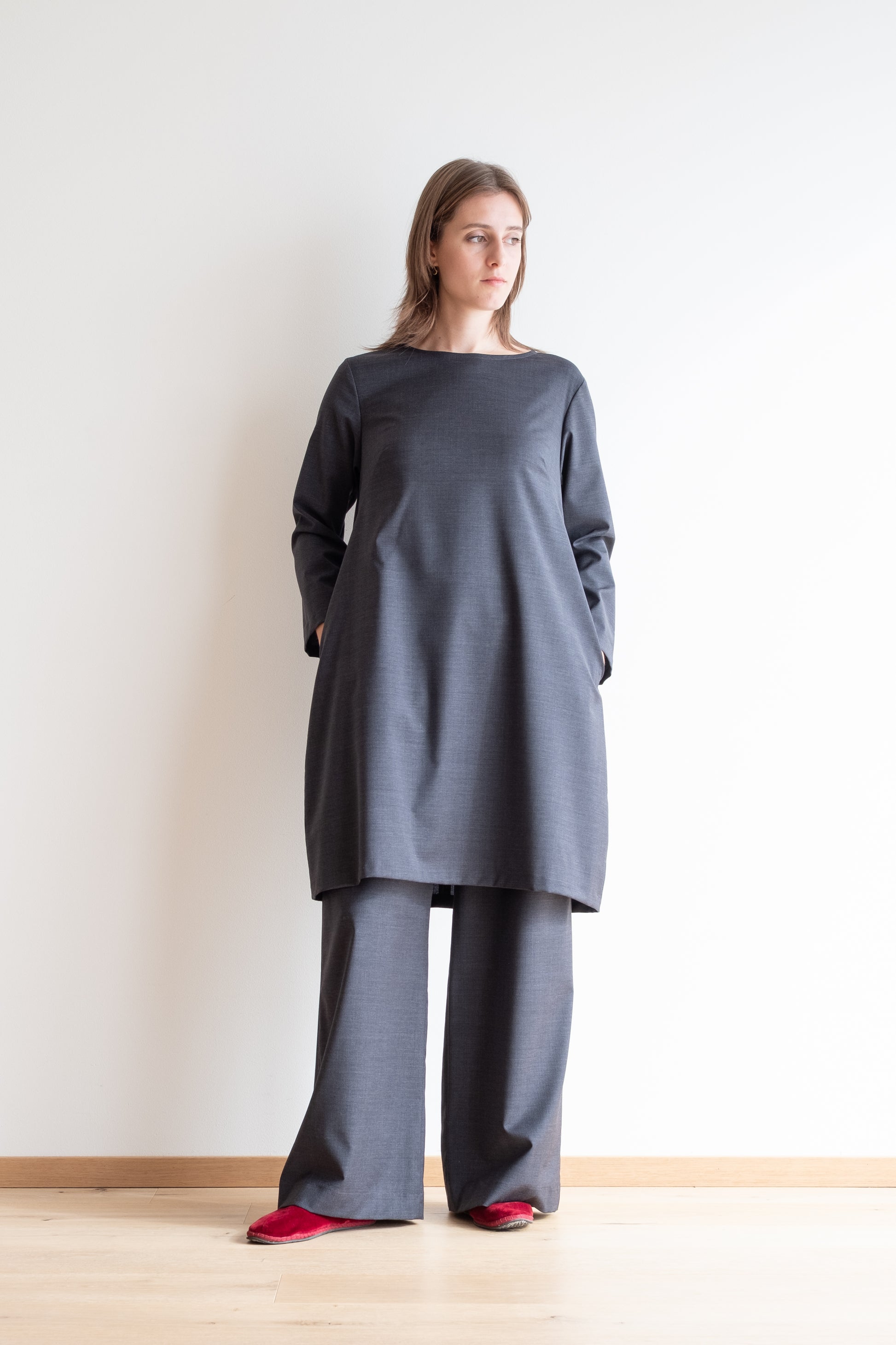 Modello diritto, scollo rotondo, chiuso con un bottoncino sulla schiena, manica lunga.