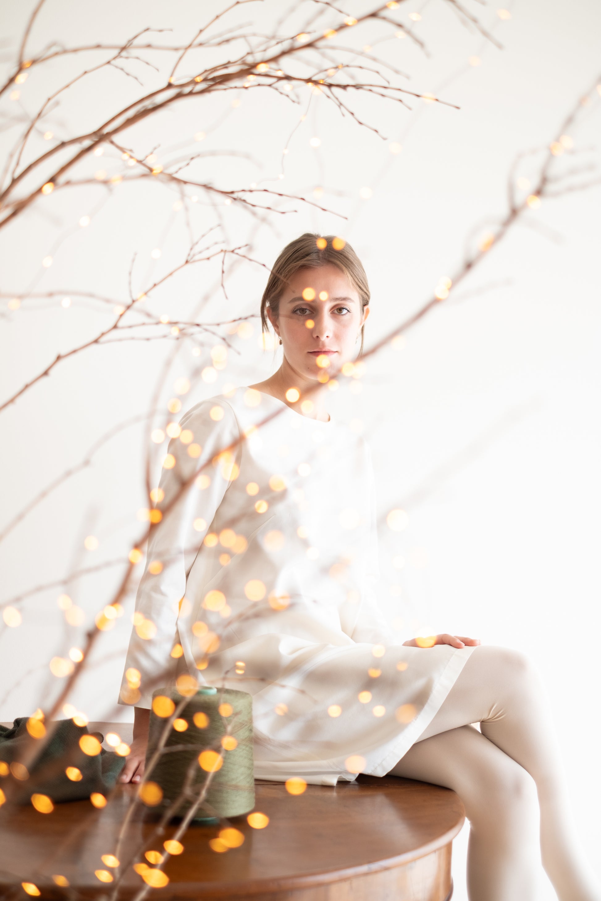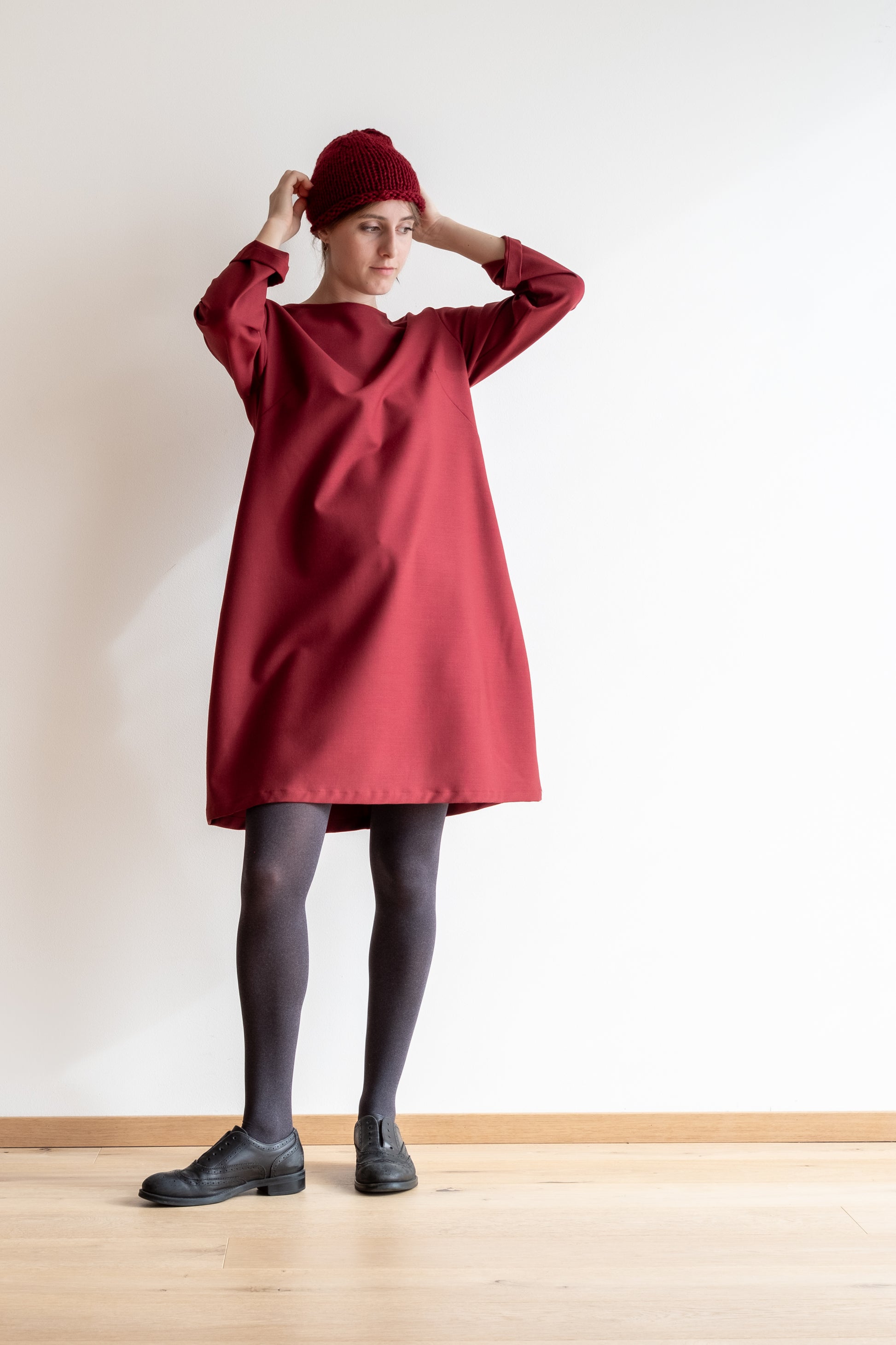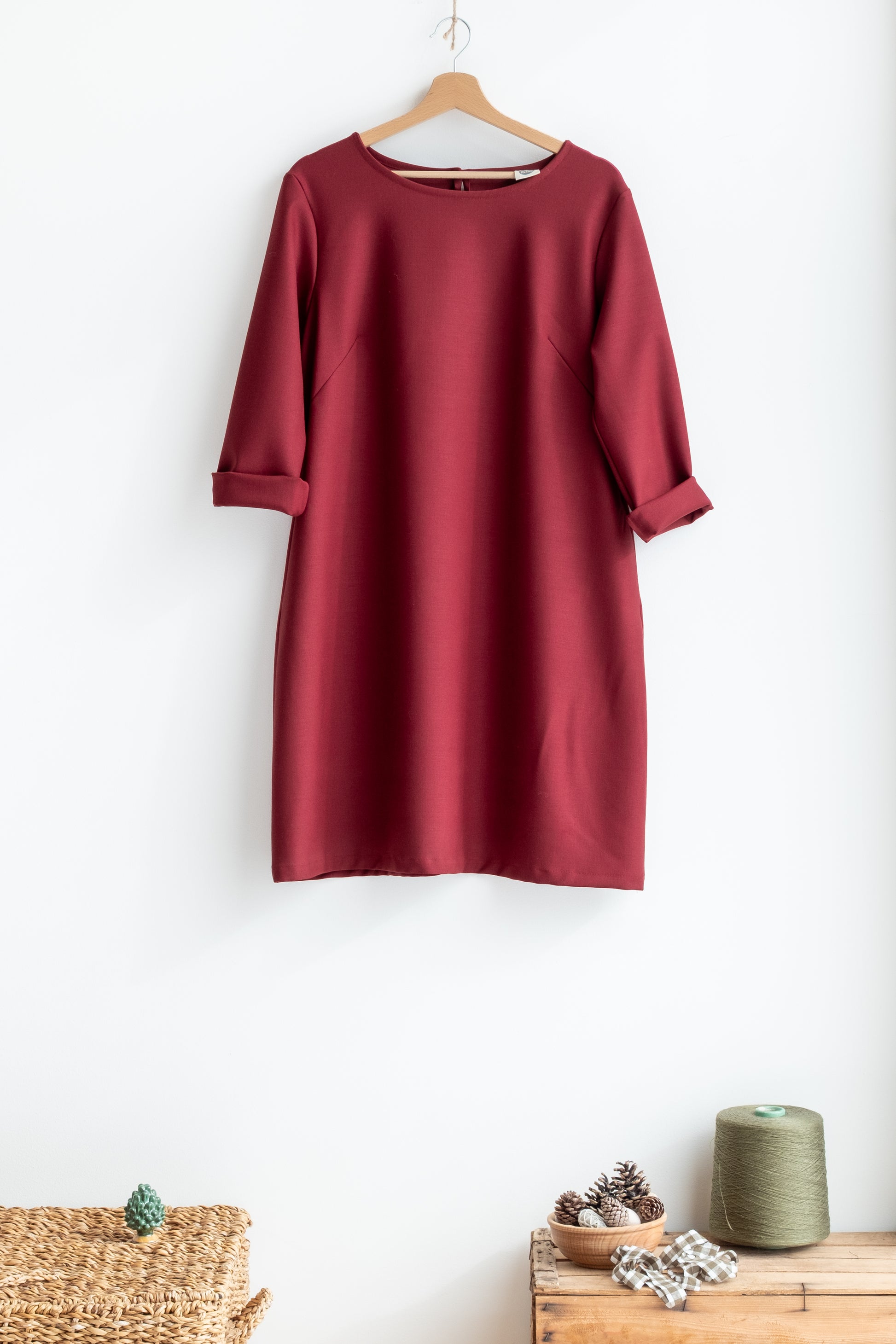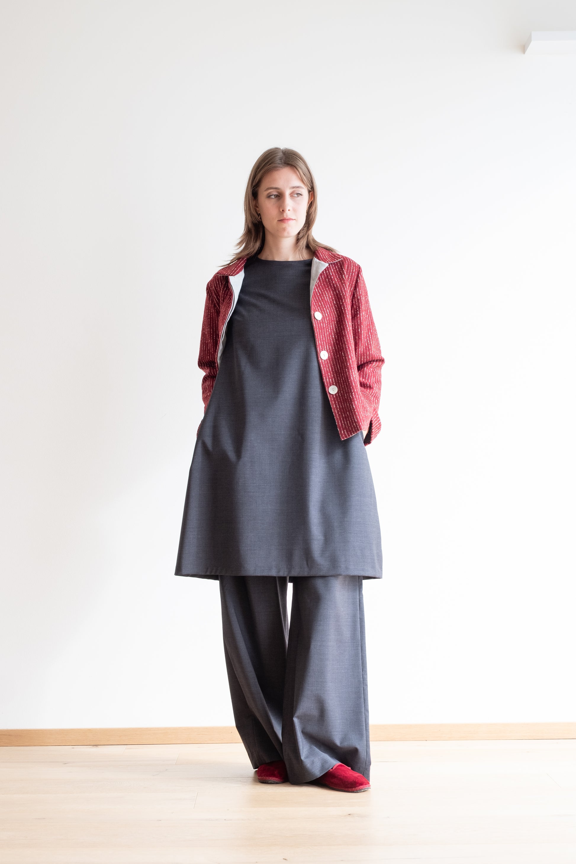 Modello diritto, scollo rotondo, chiuso con un bottoncino sulla schiena, manica lunga.