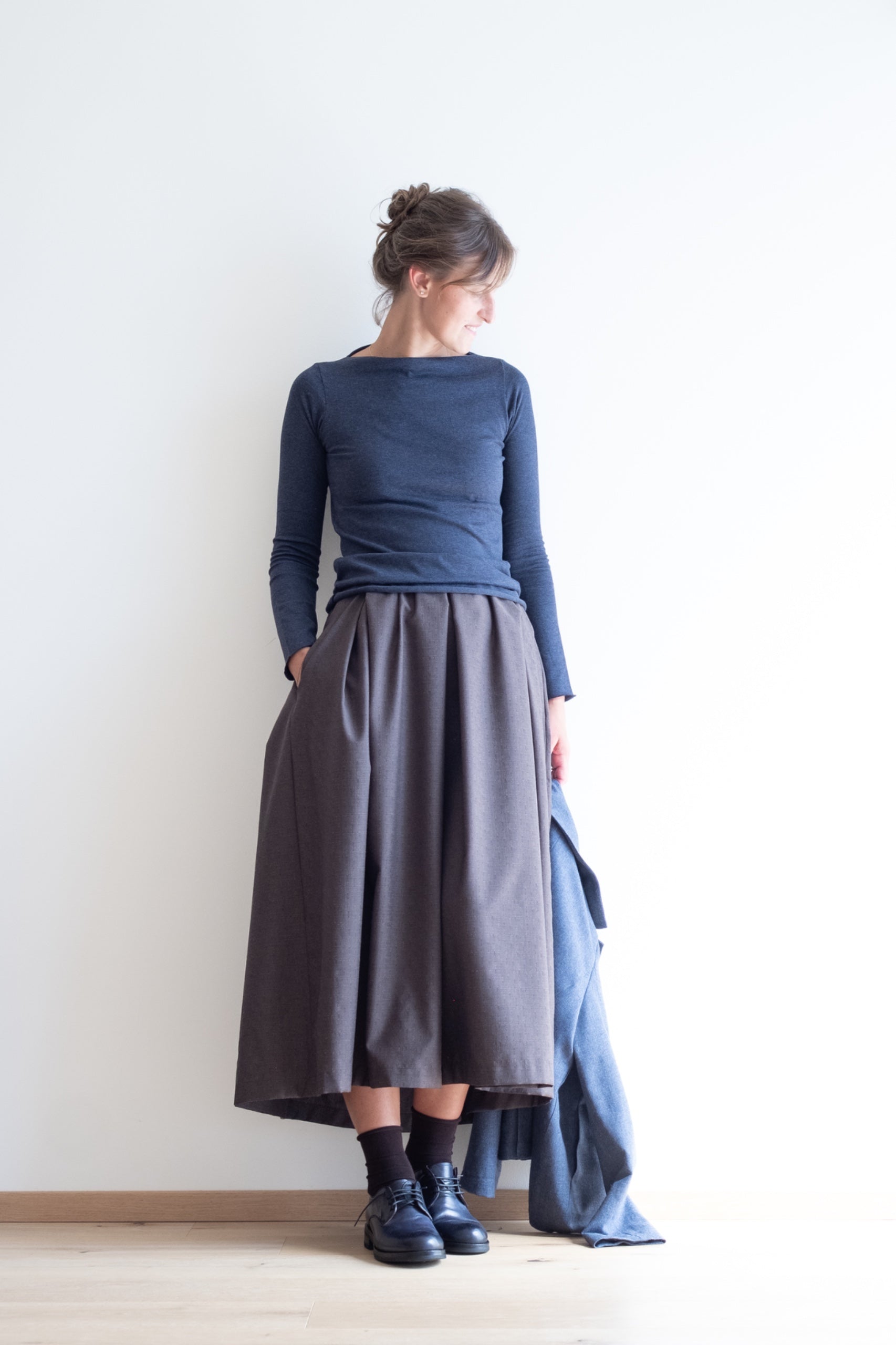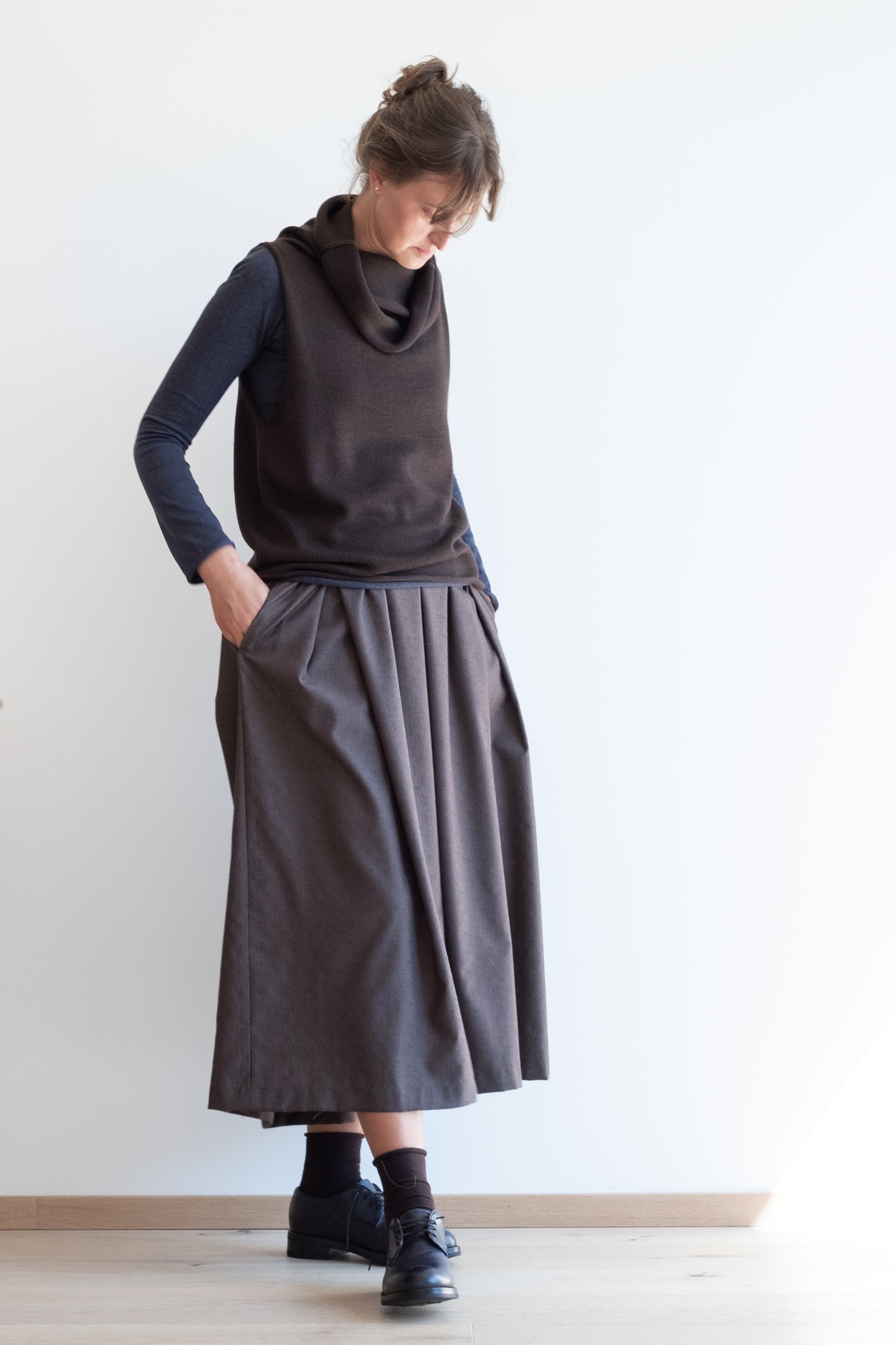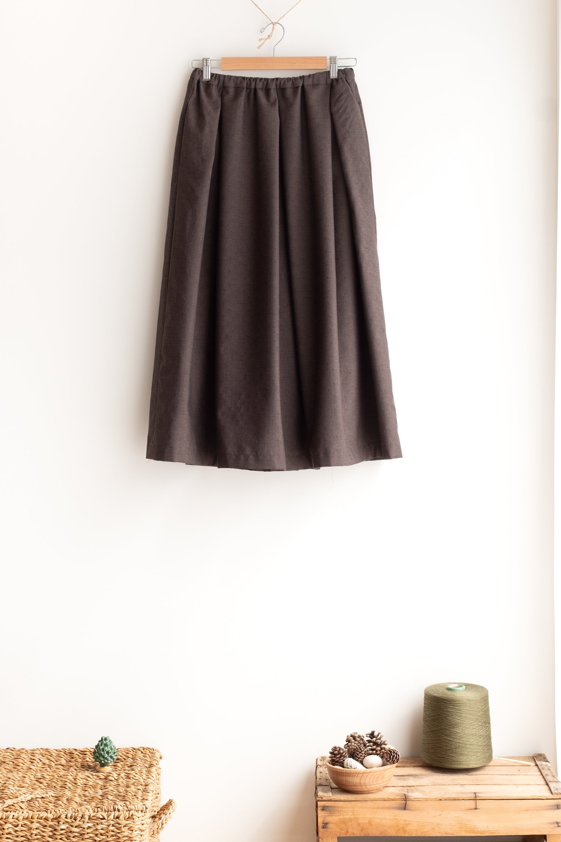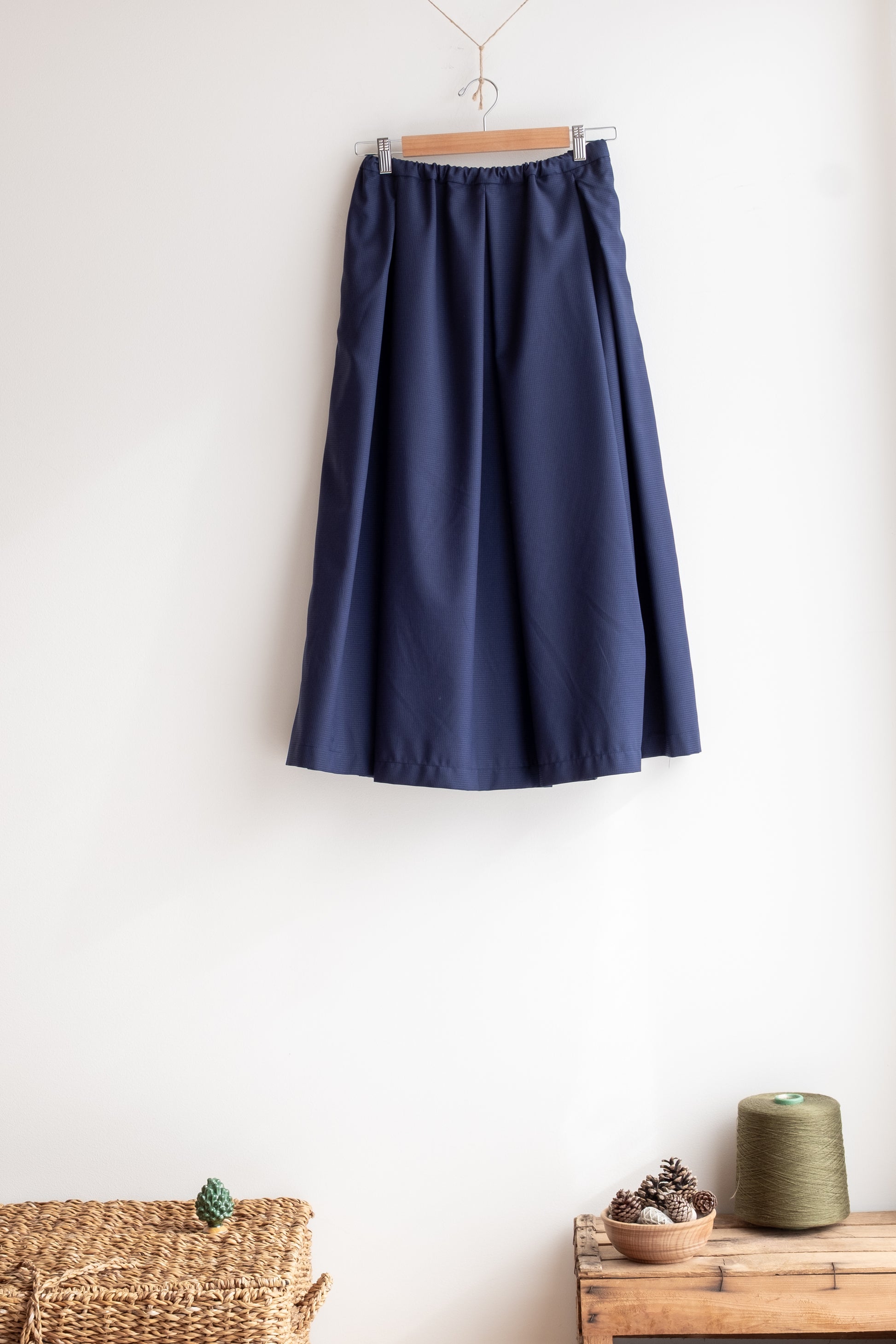 Modello ampio con sfondi pieghe sul davanti e sul dietro, elastico regolabile in vita, con tasche, lunghezza sotto il ginocchio, orlo con cimosa (laddove la cimosa è bella).
