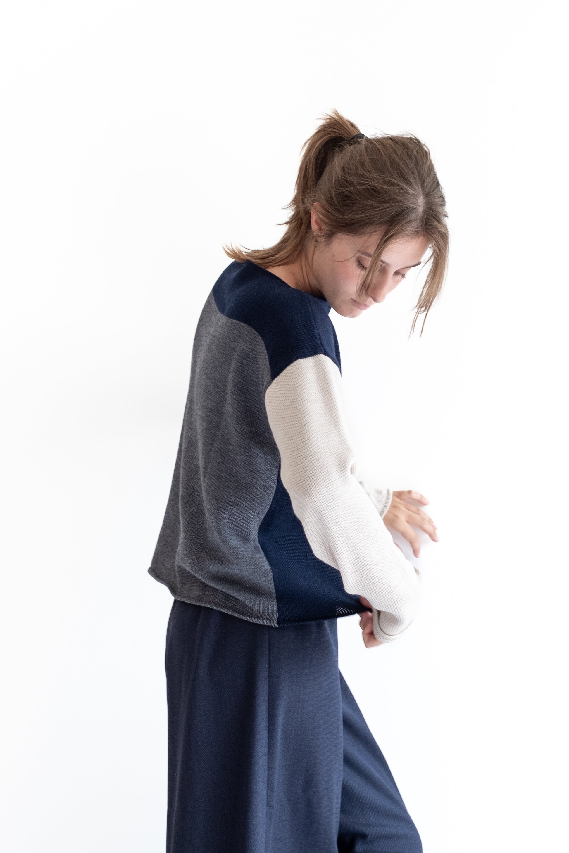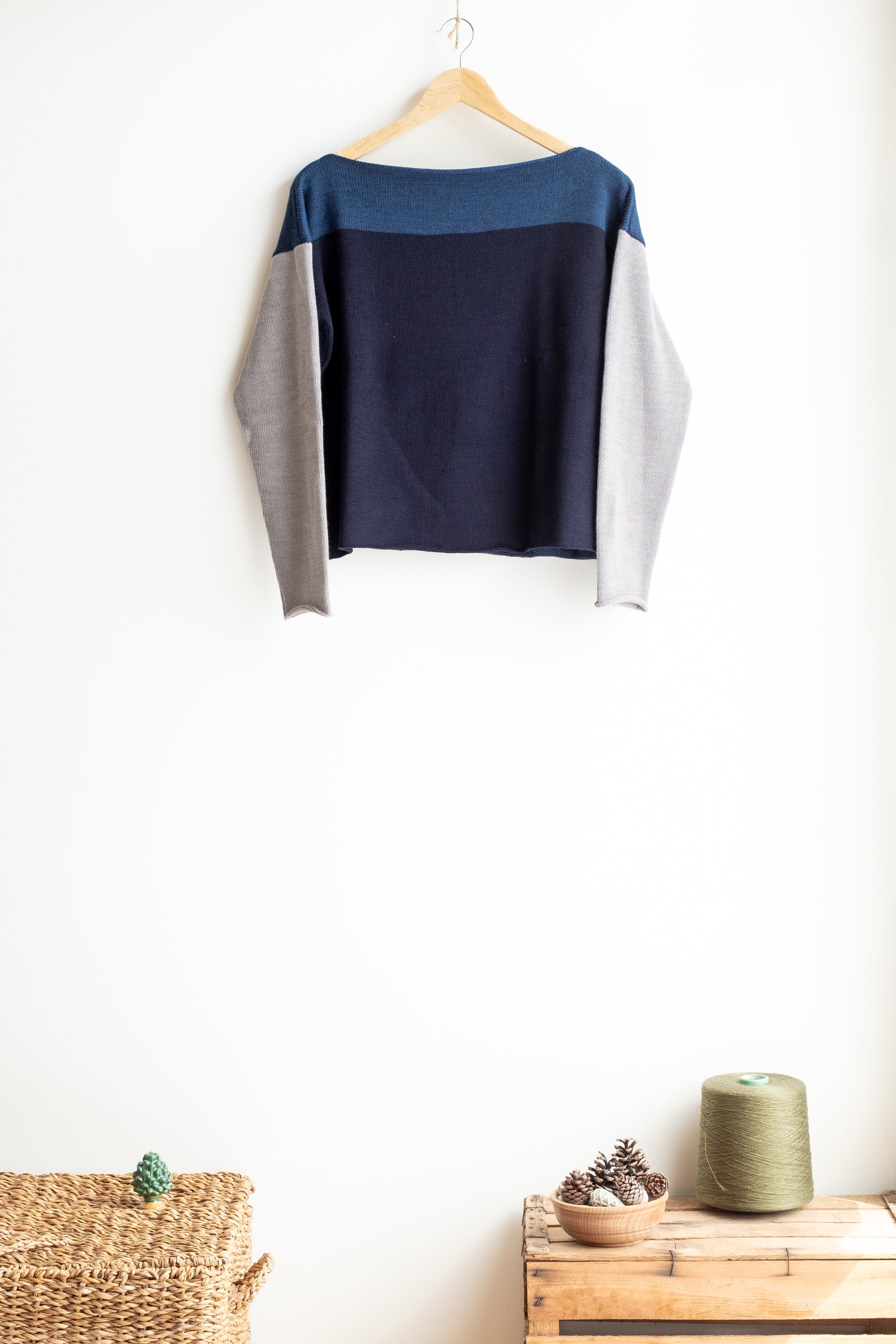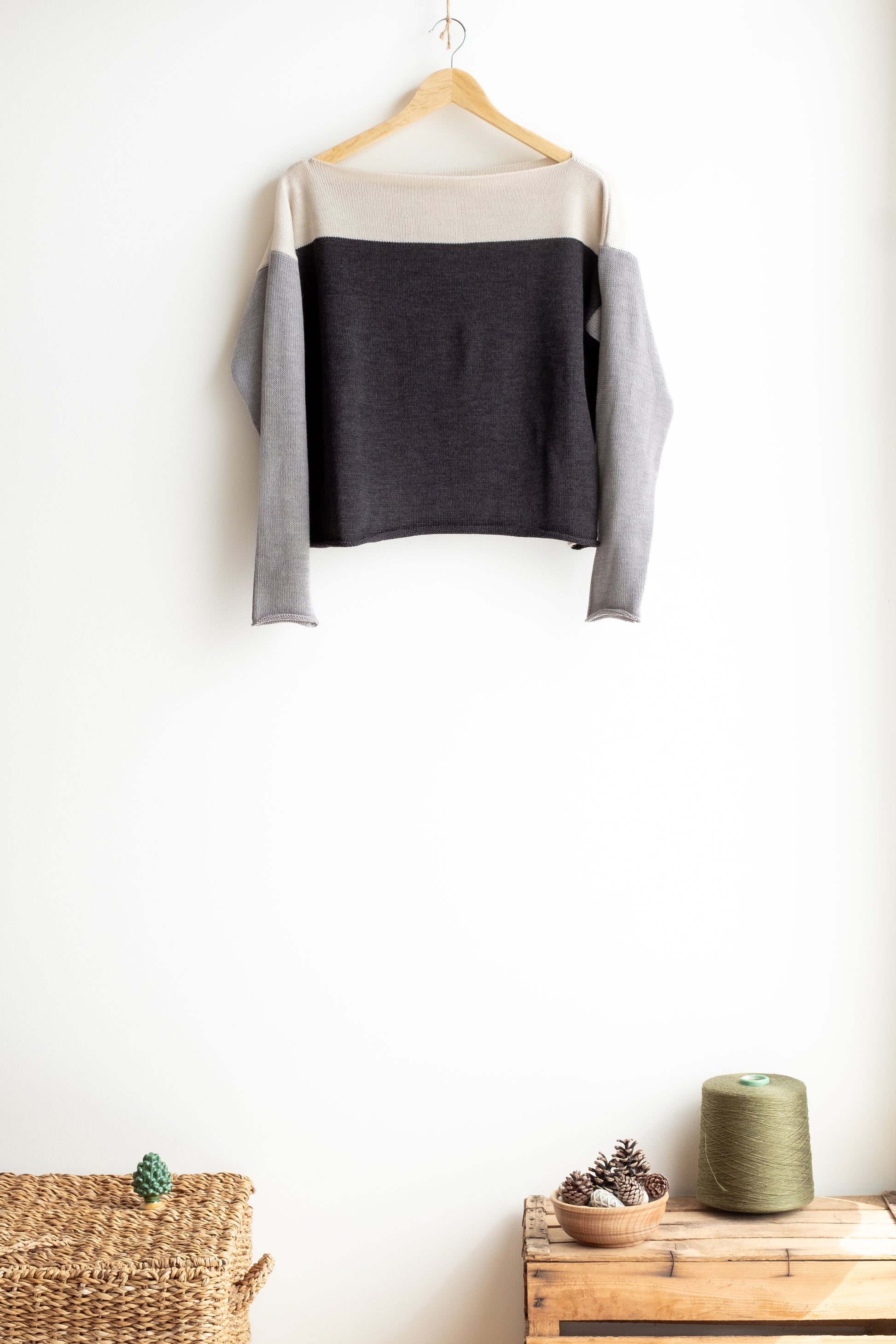 Modello quadrato e ampio, scollo a barchetta, manica lunga a contrasto, in lana merino sottile di tre colori