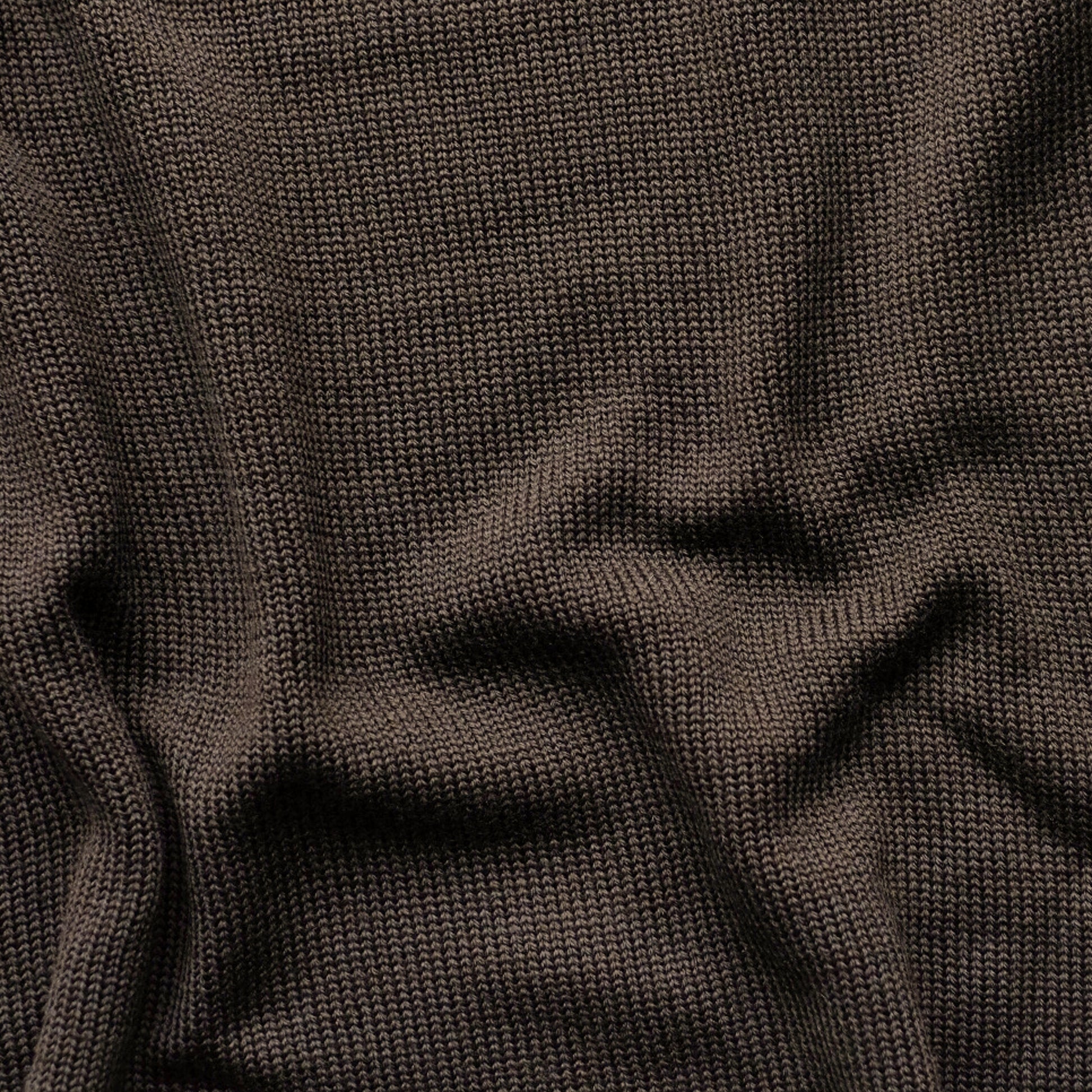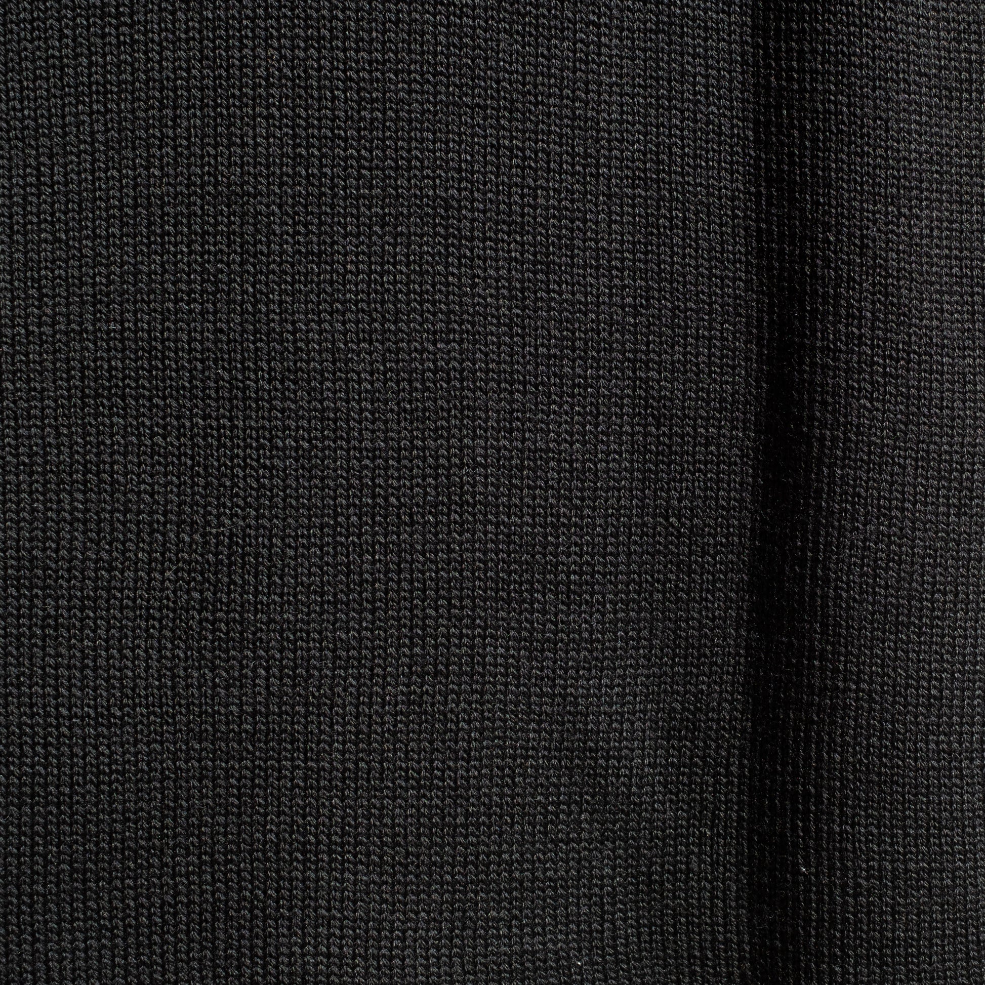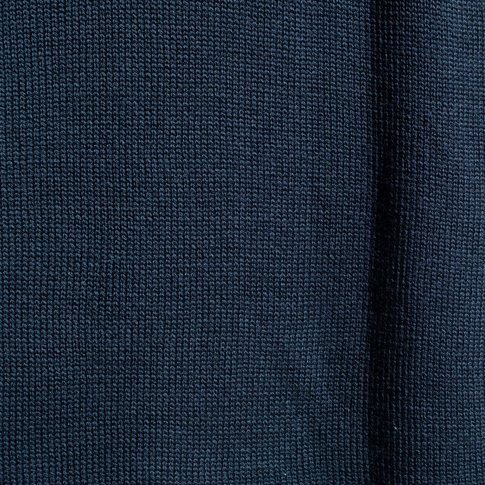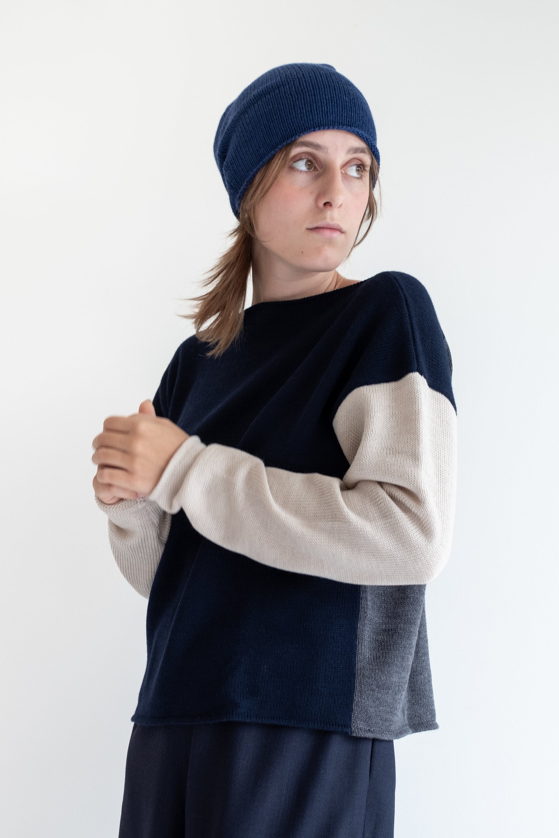 Modello quadrato e ampio, scollo a barchetta, manica lunga a contrasto, in lana merino sottile di tre colori